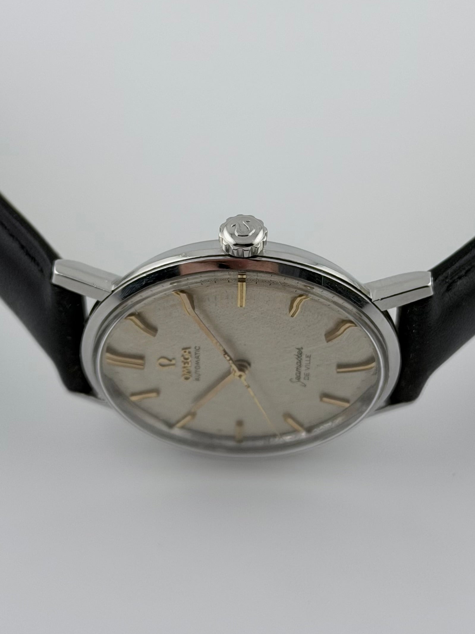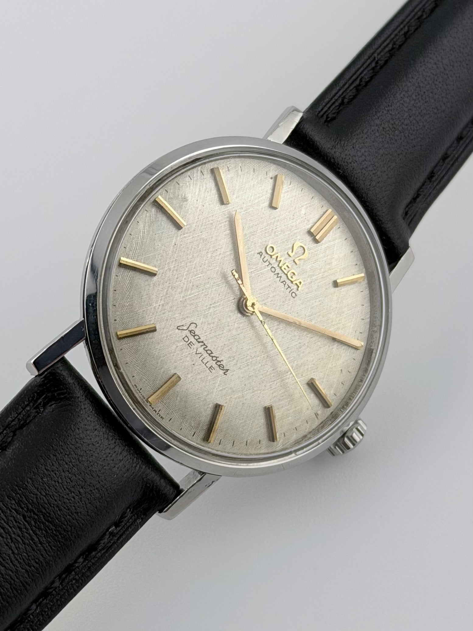 This is an incredibly rare Omega Seamaster De Ville from the 1960s which features an absolutely stunning linen dial. The watch is in overall great condition for its age with the exception of an outward facing dent just above the nine baton which shows as a darkened spot in the photographs. Aside from this, the quality of the dial is exceptional and the combination of the gold coloured faceted baton markers rally looks amazing on this dial. We have just had this piece fully serviced and calibrated to ensure that it is keeping excellent time within specification.
