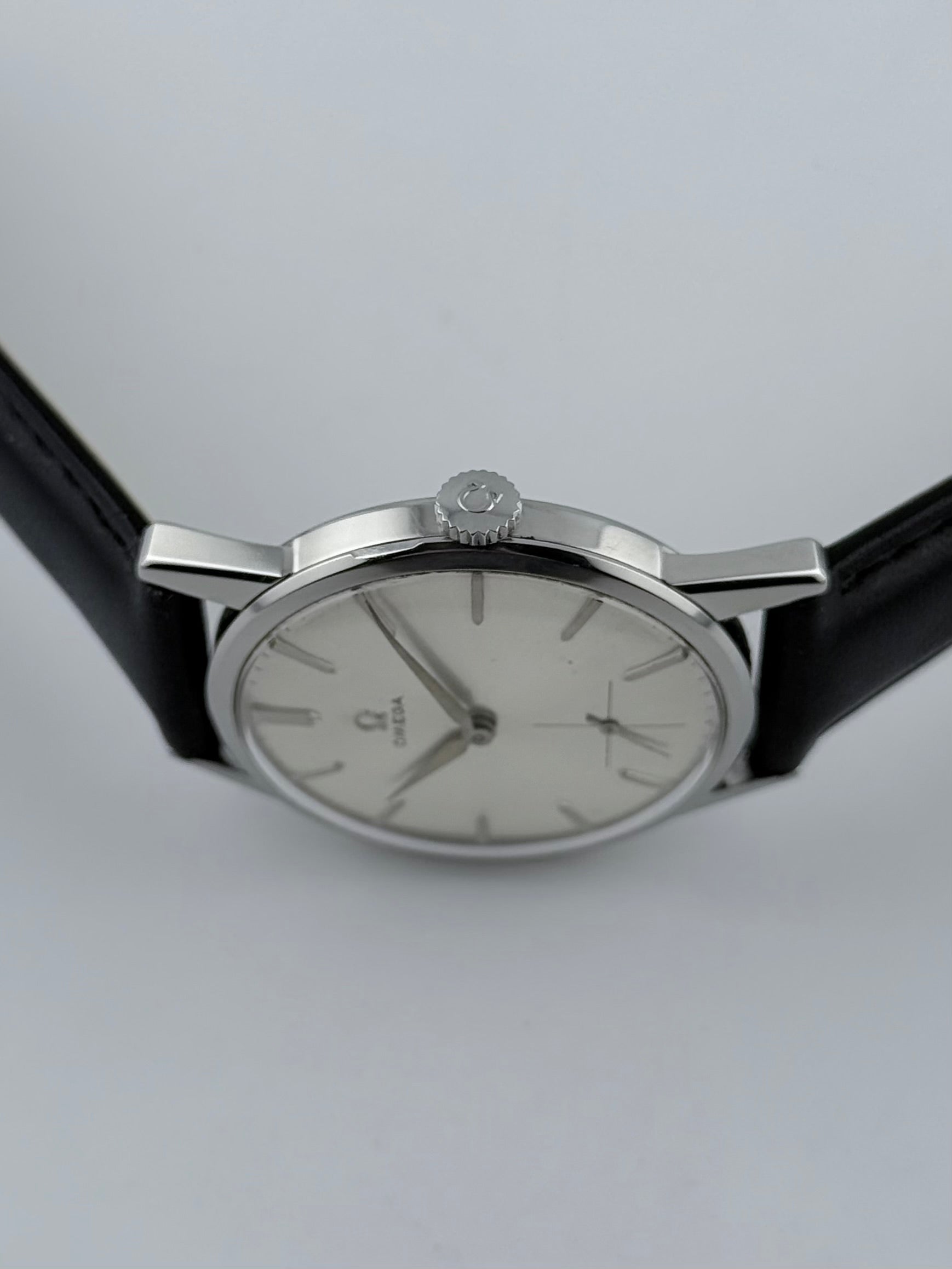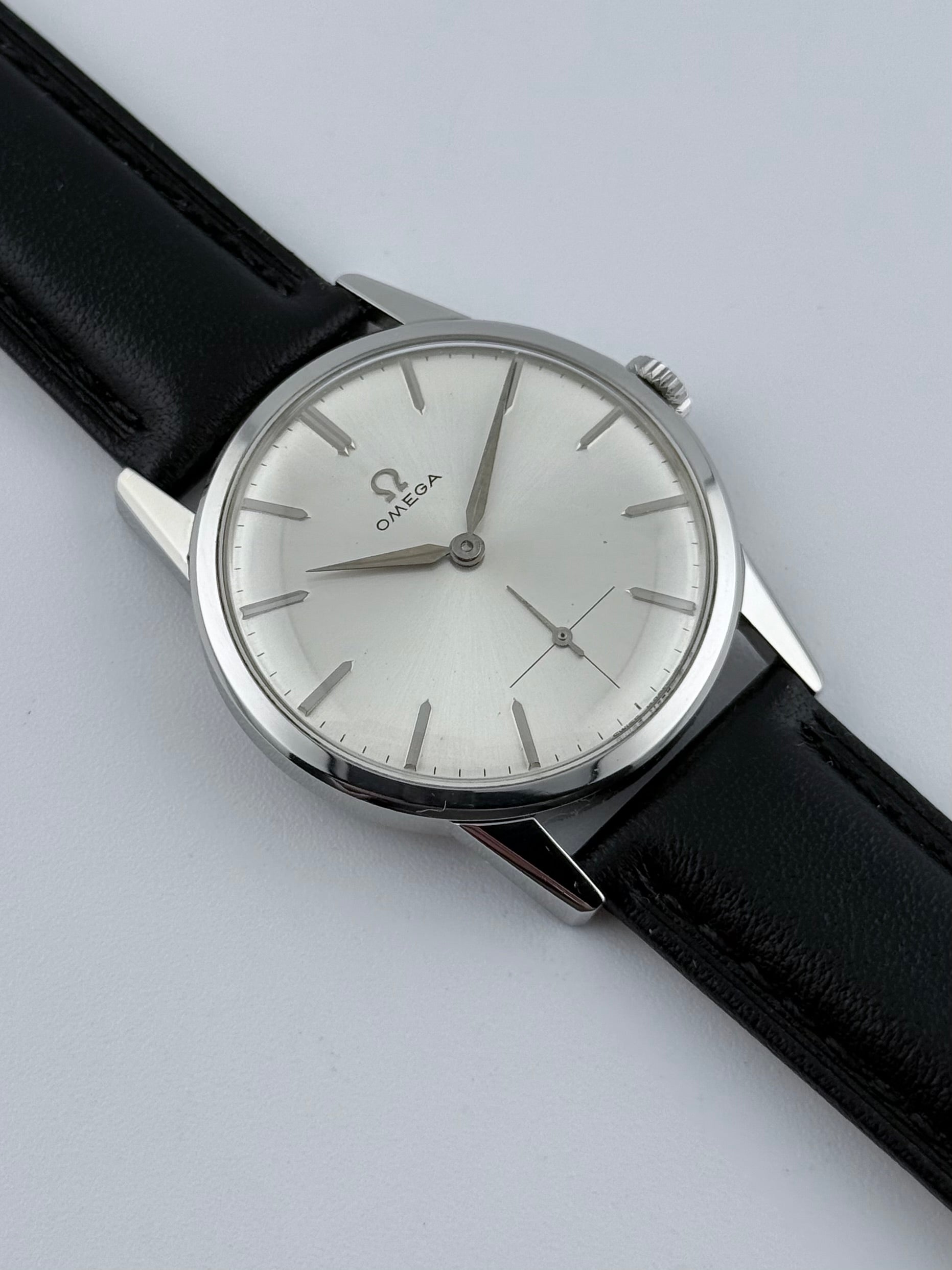 This is an absolutely stunning vintage Omega Small Seconds from 1964 featuring a beautiful silver sunburst dial with crosshair seconds' sub-dial and stylish leaf hands and faceted baton markers. The watch is in amazing condition, only showing some very slight signs of wear and age! Mechanically, it is working perfectly and keeping great time within specification.