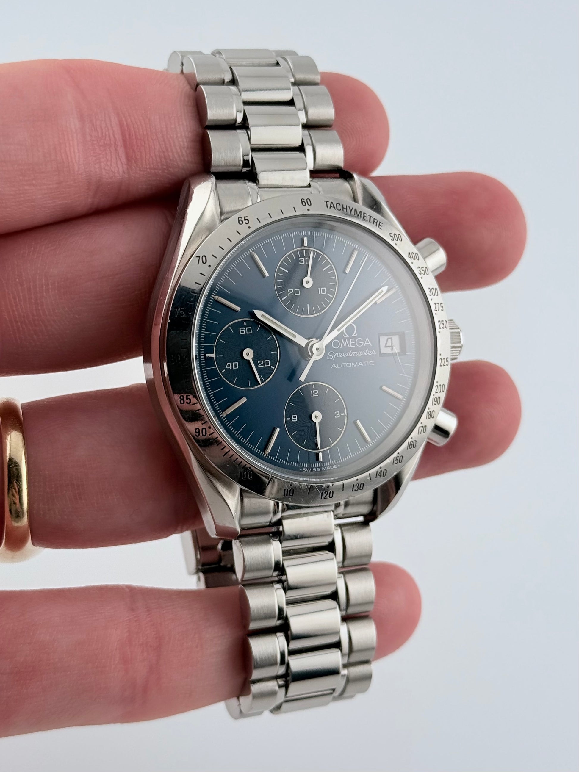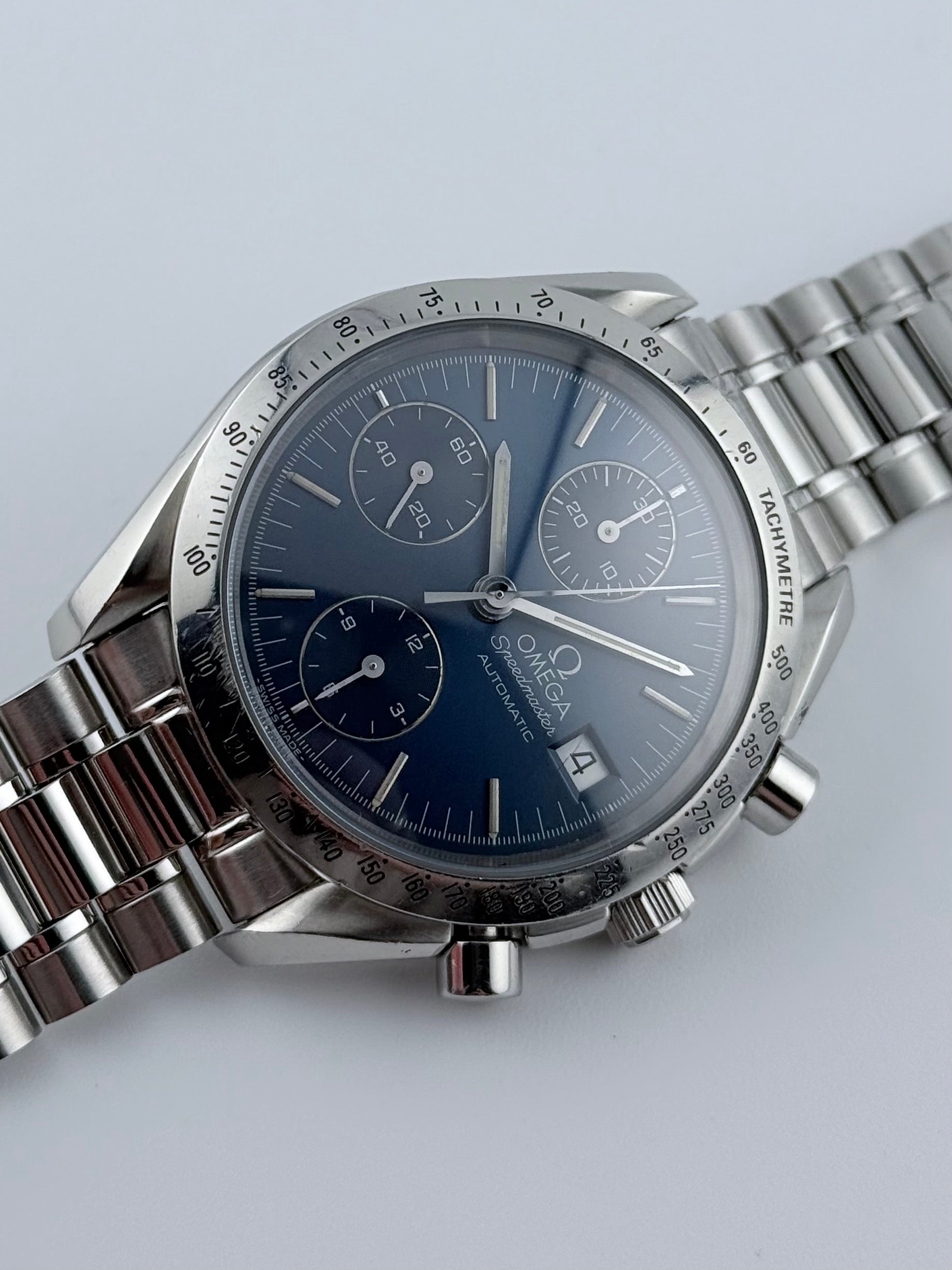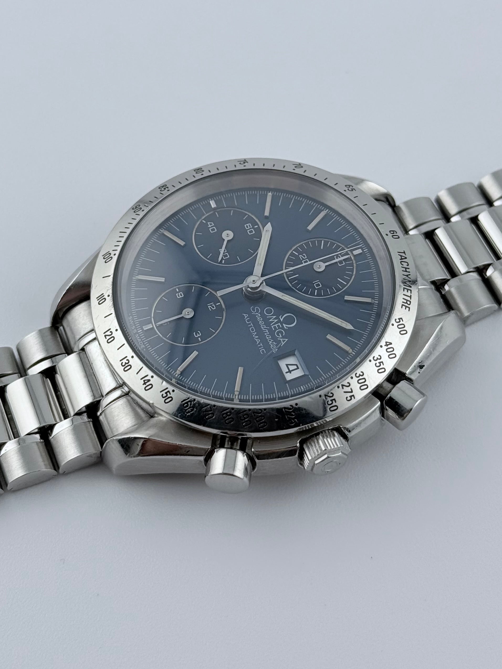 We have for sale a stunning neo vintage Omega Speedmaster which dates back to 1999. This watch features a gorgeous sunburst blue dial which reflects the sunlight in a stunning way. The dial hosts a a date, seconds counter and an hours and minutes counter for the chronograph function. The watch is in lovely condition for its age showing minor patina on the dial which is only discernible under a Loupe. The watch is running perfectly in every way.