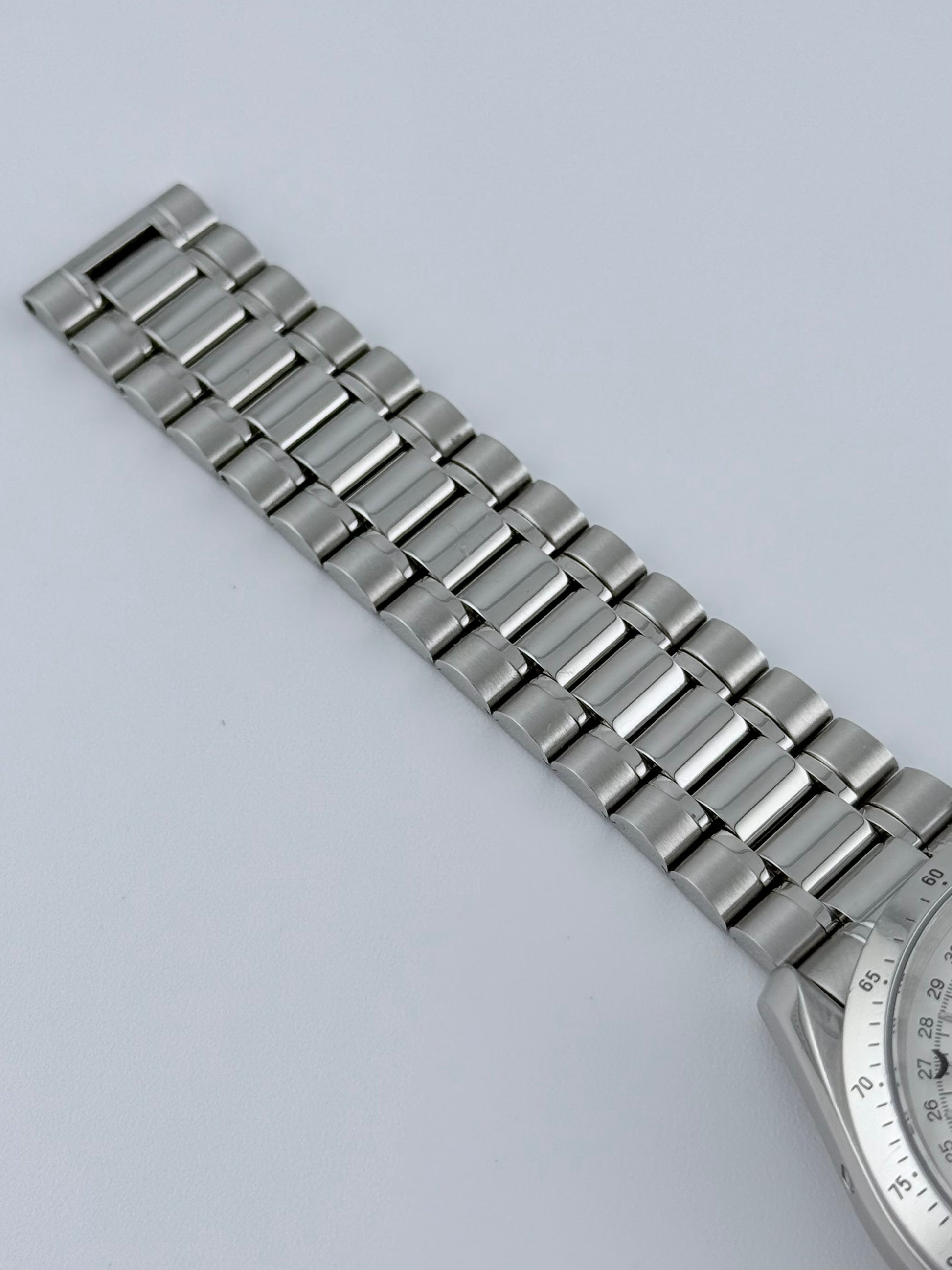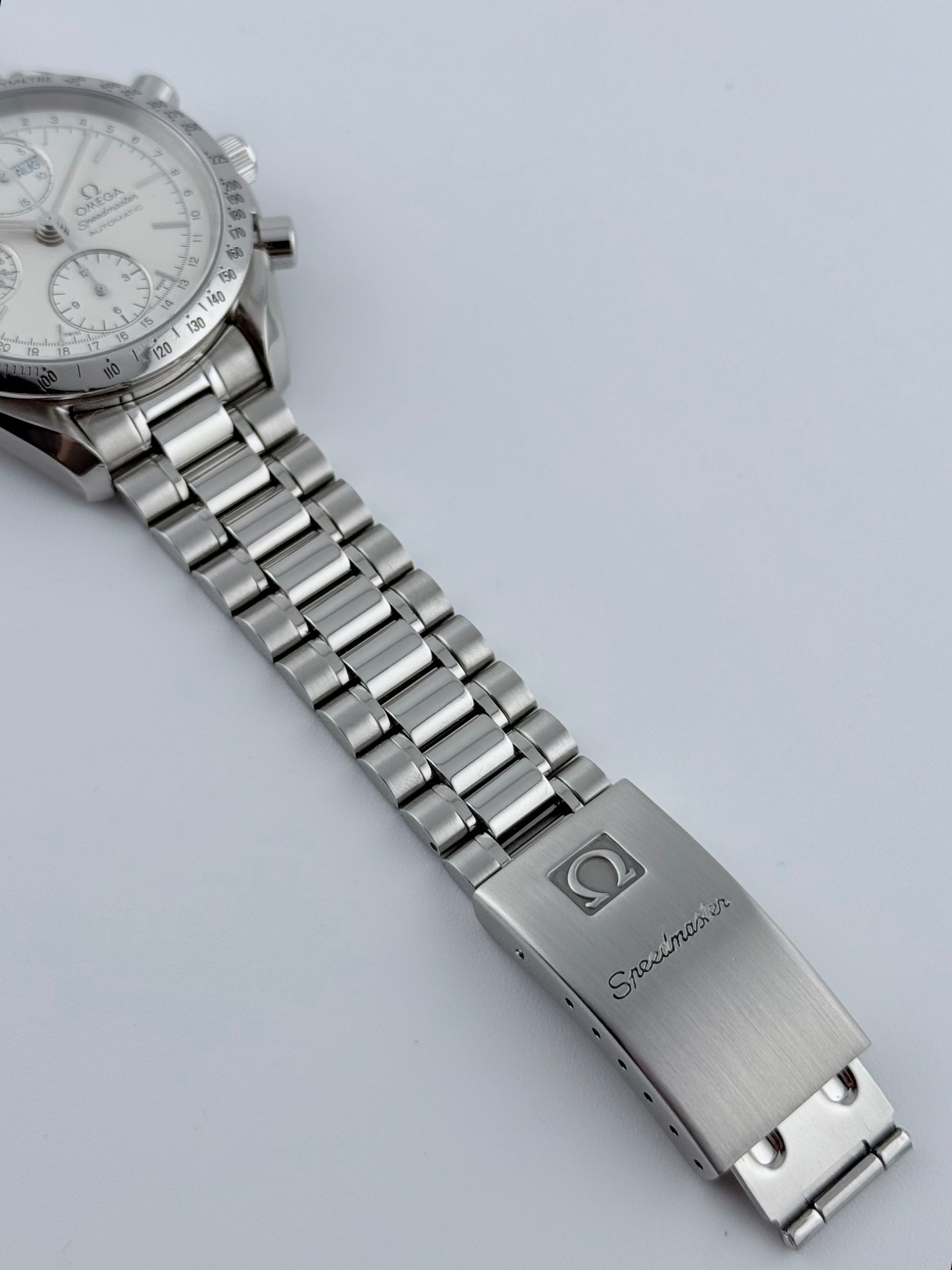 We have for sale a stunning neo vintage Omega Speedmaster which dates back to 1999. This watch features a gorgeous white dial. The dial hosts a a triple date, seconds counter and an hours and minutes counter for the chronograph function. The watch is in outstanding condition for its age. The watch is running perfectly in every way.