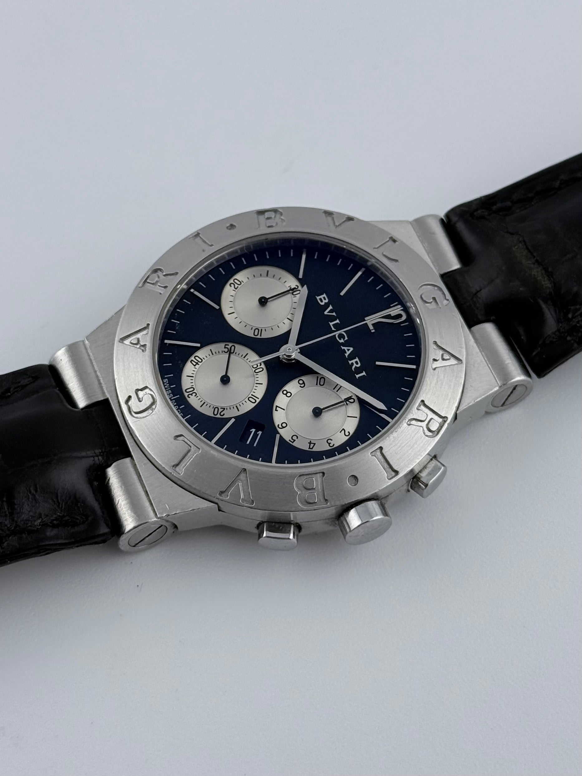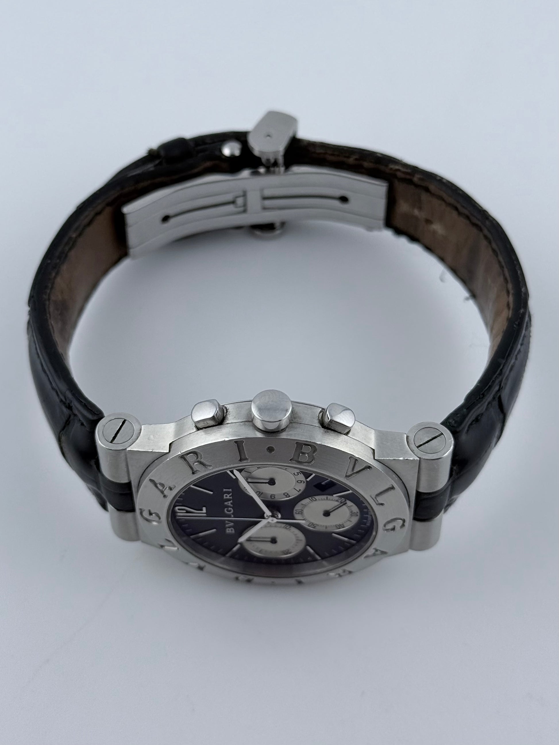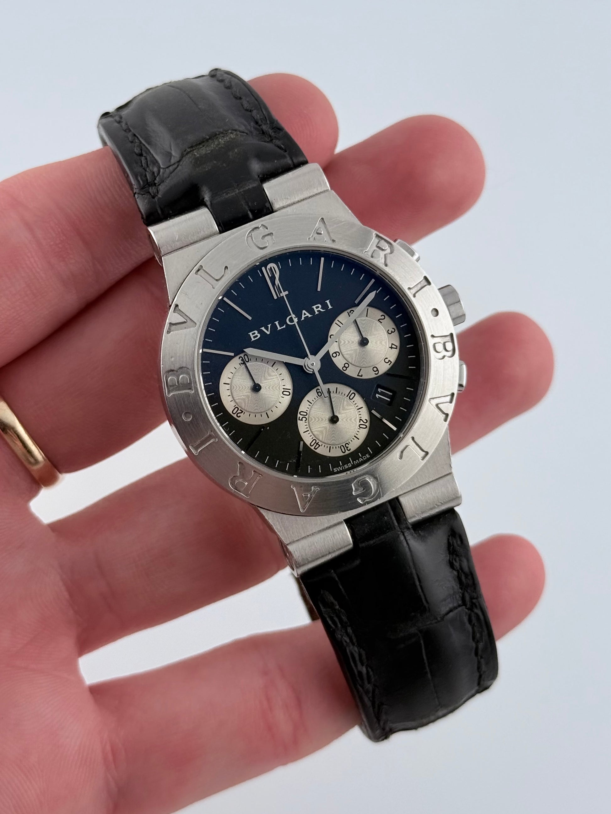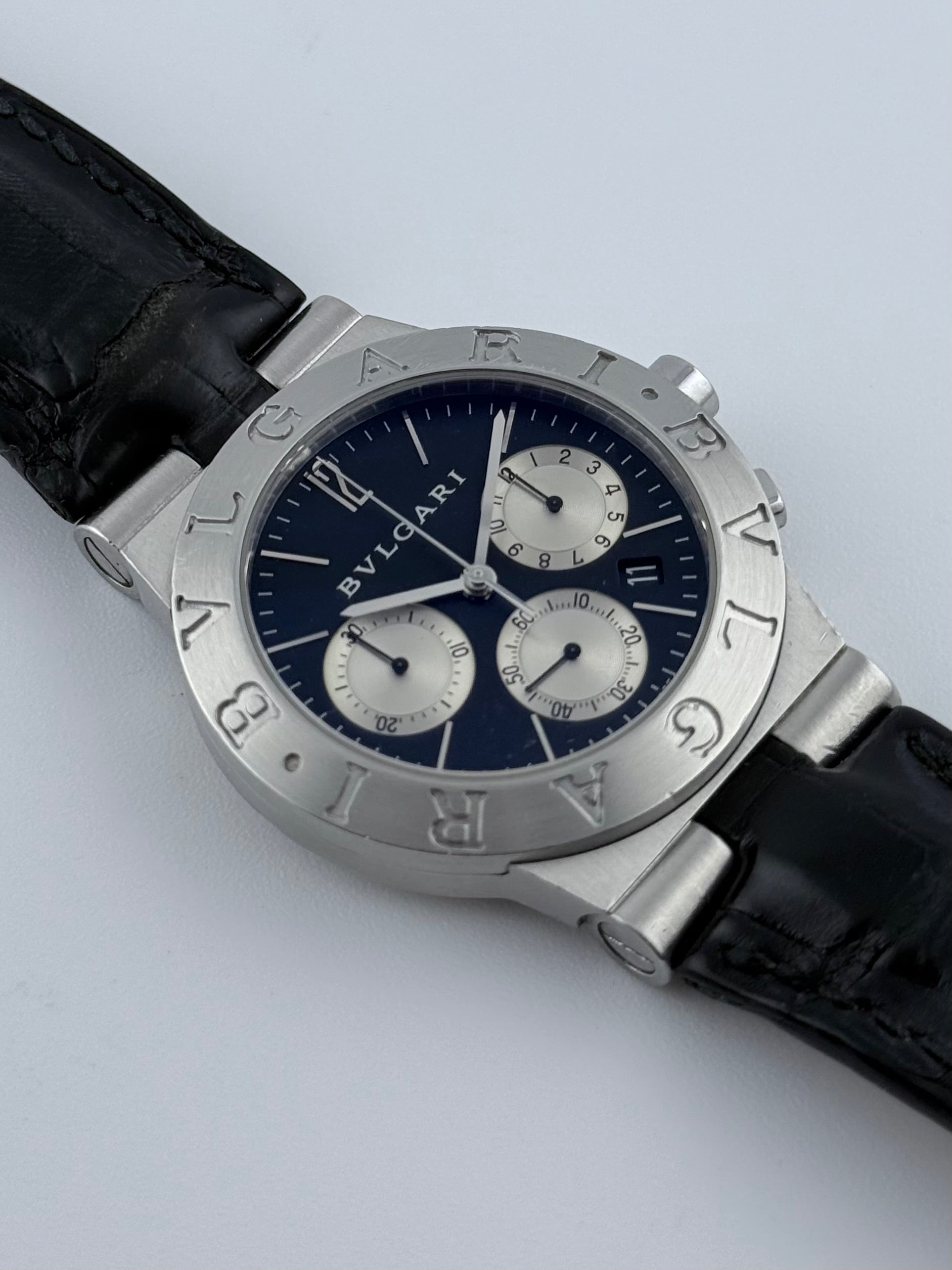 We have for sale a fantastic vintage example of Bulgari Diagono quarz watch line, which was debuted in the late 1990s as Bulgari's entry into luxury sports watches. This particular piece is featuring a combination of cool matt black dial and stainless steel sub-dials, and a case with bezel and comes with its original Bulgari leather strap and butterfly clasp for added safety. The stunning design of minutes' markers, hands with silver sub-dials for the chronograph function give off a head-turning effect when moving the watch on your wrist. The watch is in outstanding condition for its age and is running perfectly in every way.