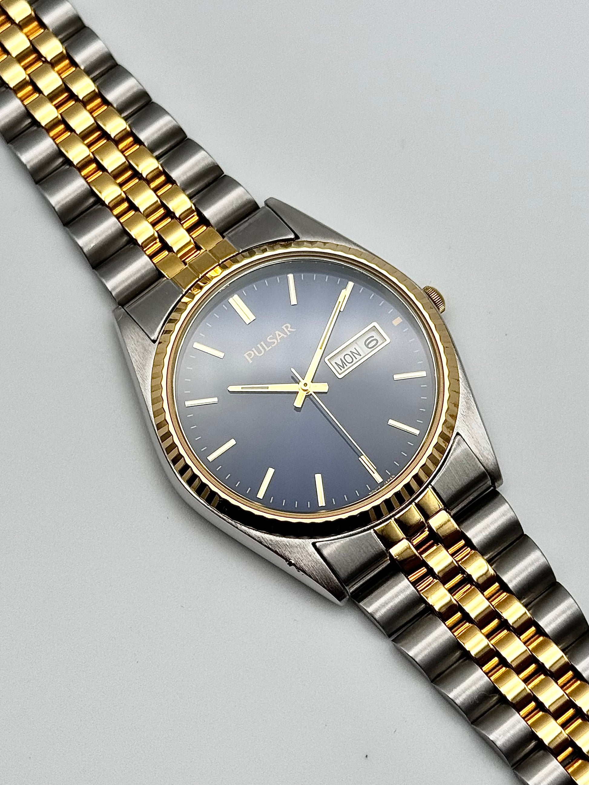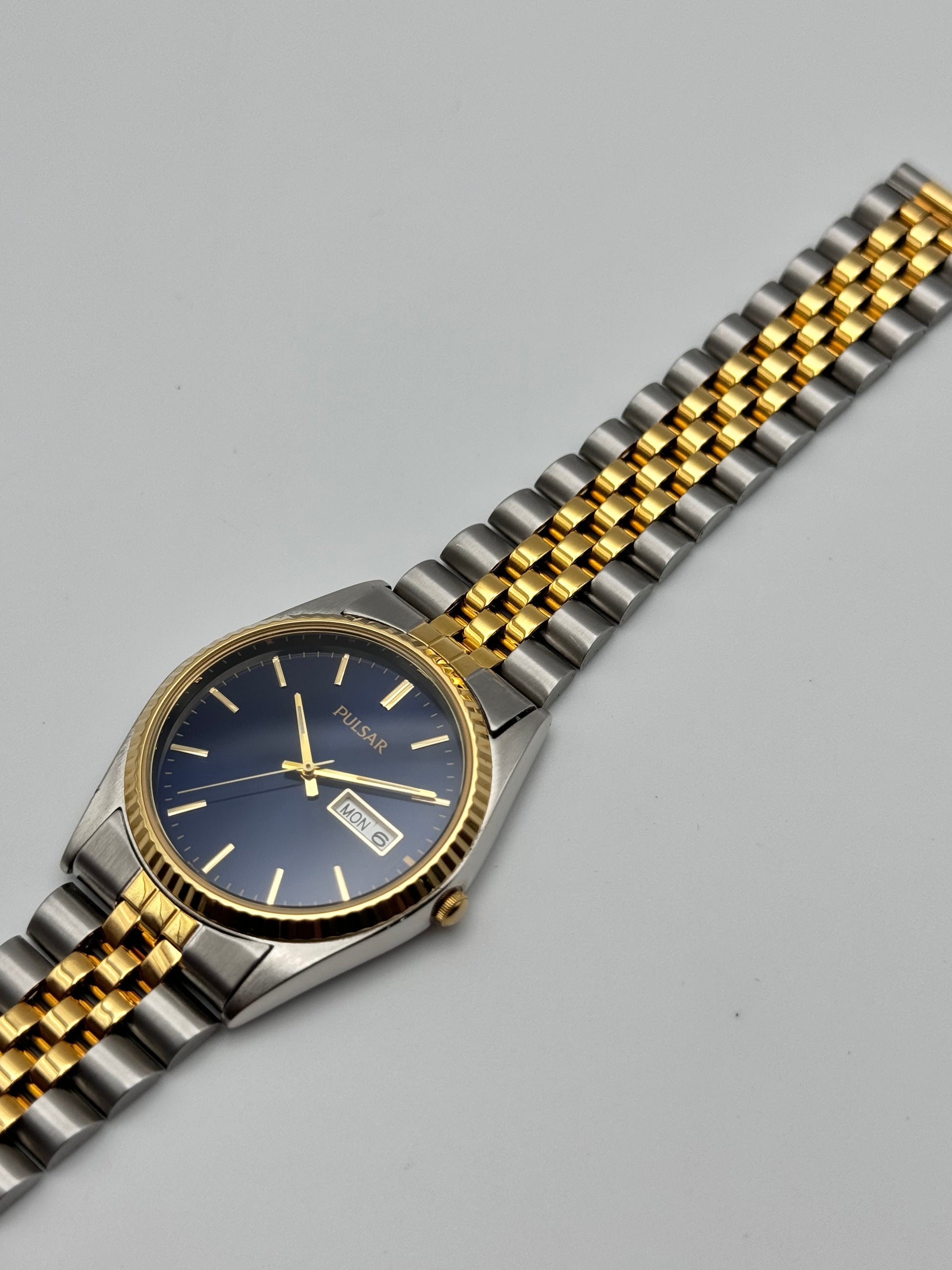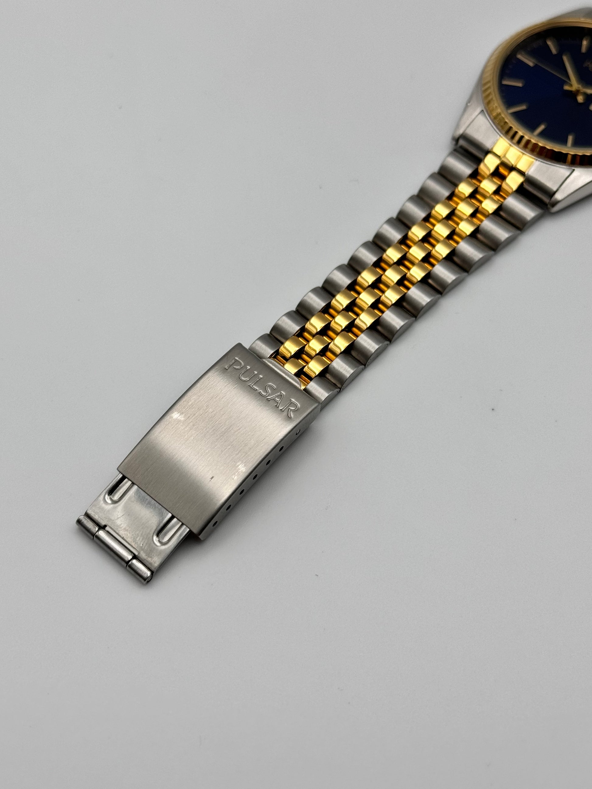 This is a stunning Pulsar Quartz which provides a perfect alternative to the Rolex Datejust or Day-Date. The watch is in fantastic condition and shows very little signs of wear. It also comes with its original box!