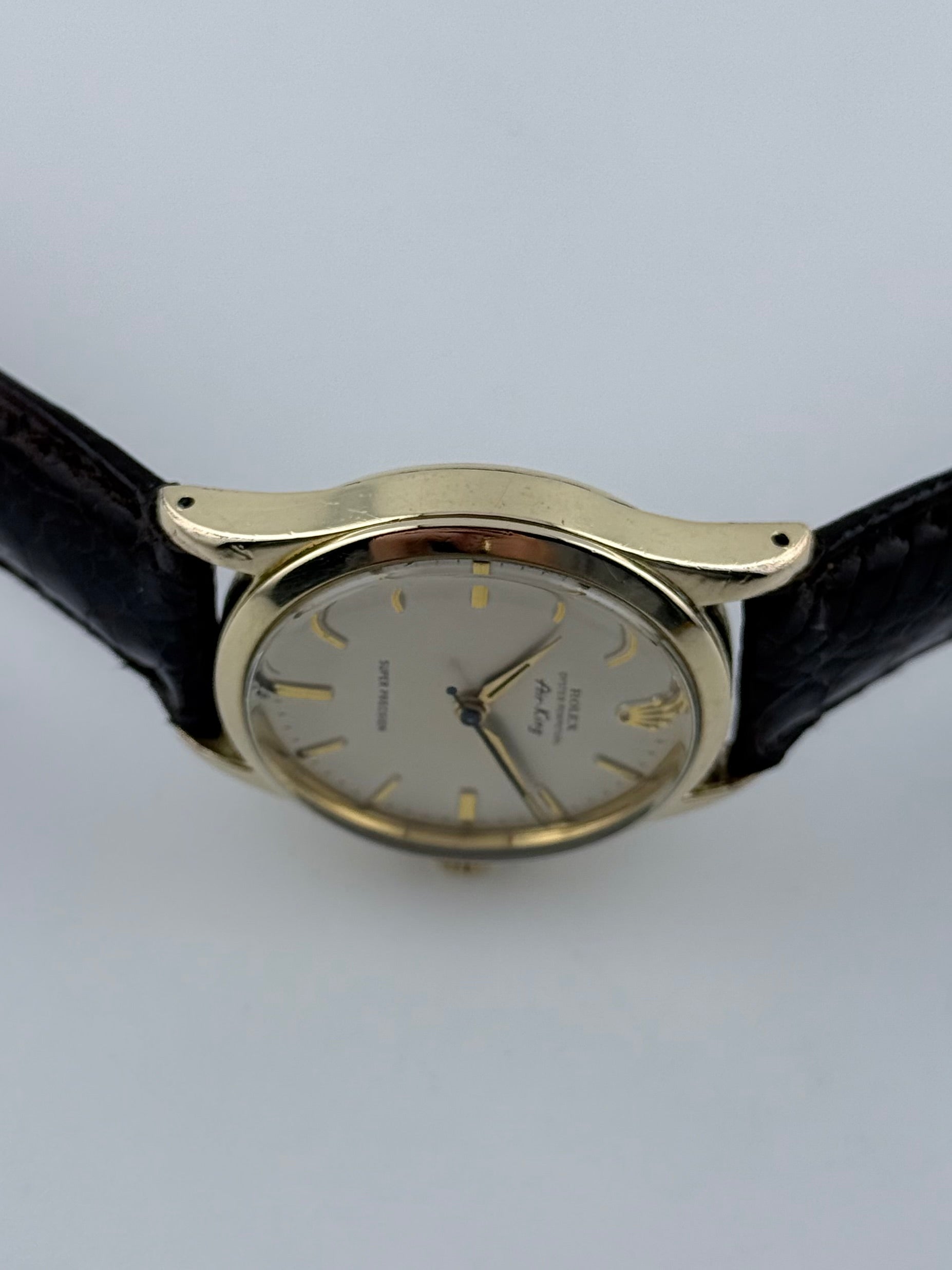 This 18k gold plated Rolex Air-King 5506 is absolutely stunning as well as it is in brilliant condition for its age. The watch shows only light signs of wear and features a beautiful off-white dial which brings out the glinting gold indexes, hands and, of course, the iconic Rolex crown sign indicating 12 o'clock. This watch also features an engraved dedication on the case back which always adds a story to such incredible vintage timepieces. The watch is keeping perfect time.