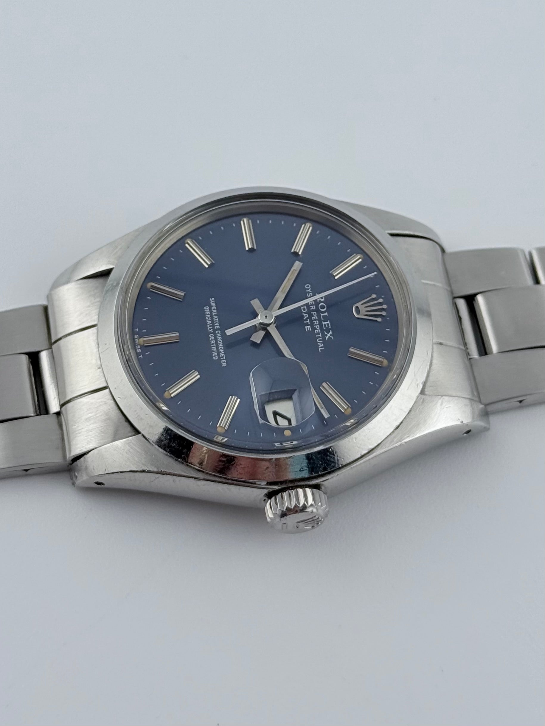 Presented in fantastic condition is this timeless Rolex Oyster Perpetual Date from the 1970s. This piece features an amazing and original blue sunburst dial which displays original and crisp applied text and baton markers. The watch is in spectacular condition and is running perfectly with the movement being in exceptional mechanical order.