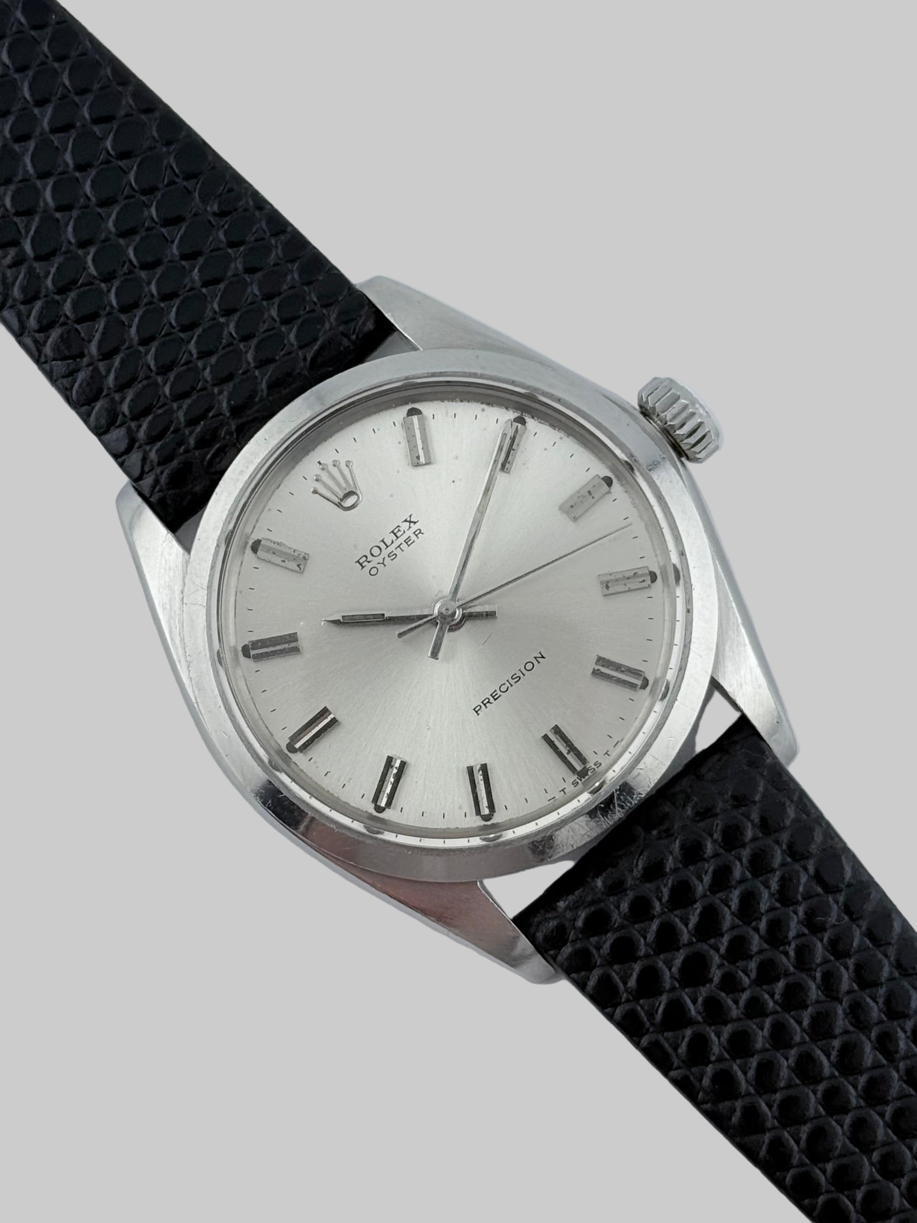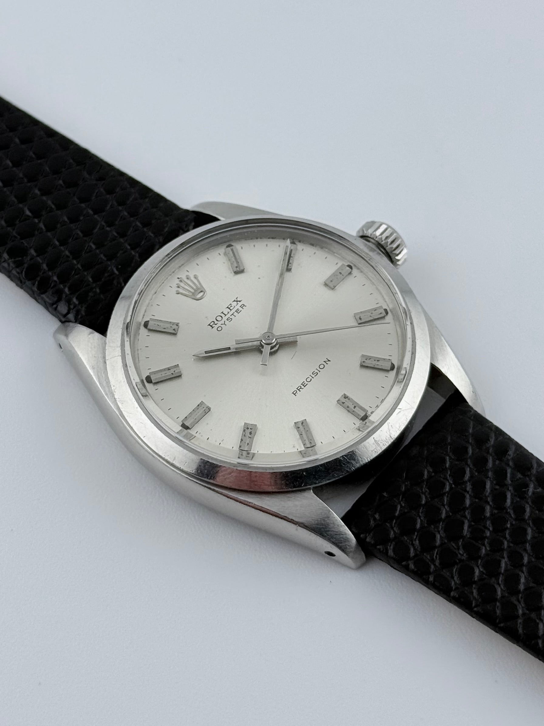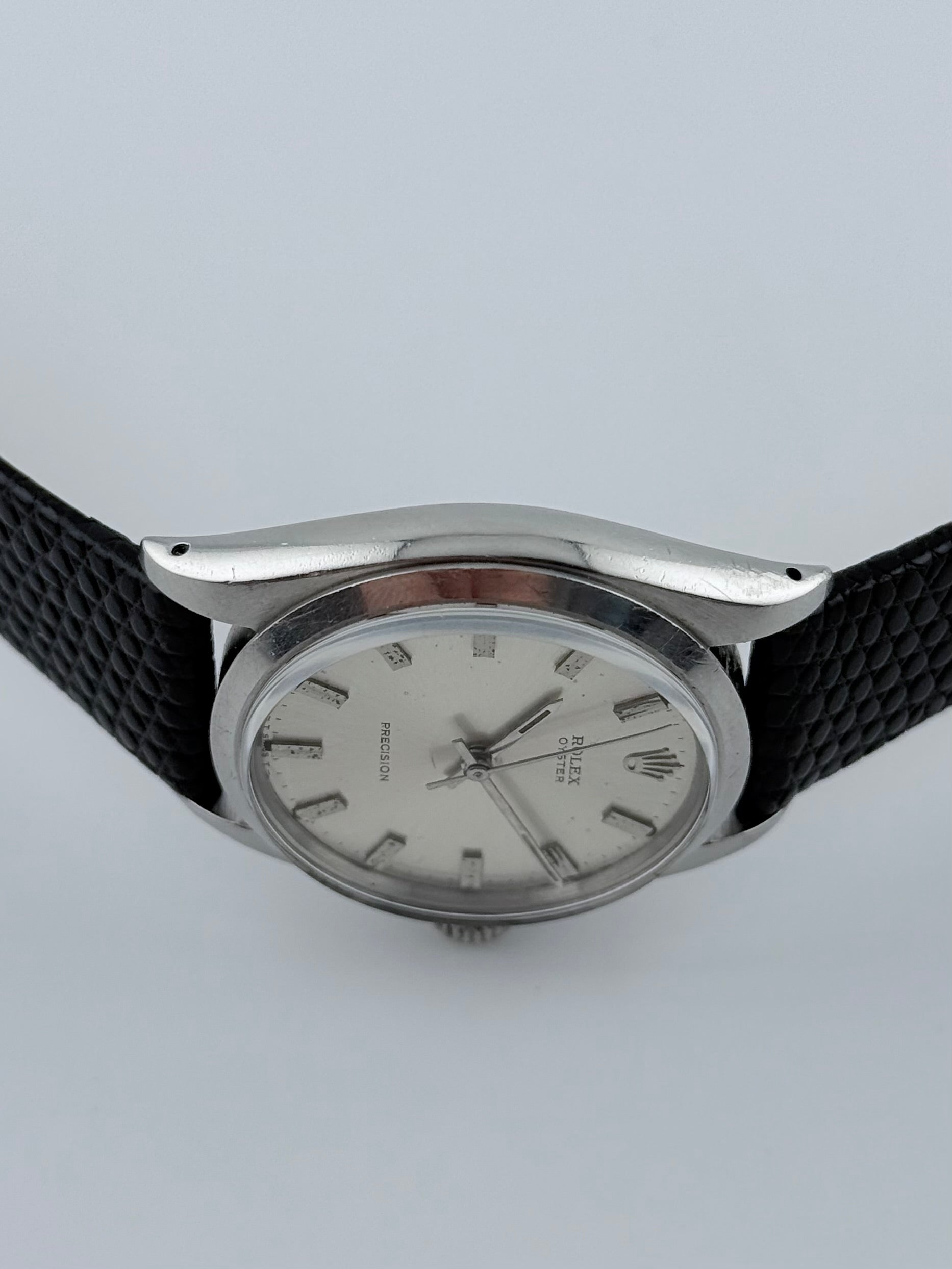 This classy and timeless Rolex Oyster Precision from the 1960s is presented in fantastic vintage condition, featuring a stylish design of a beautiful and original silver colour, sunburst dial which displays original and crisp applied text and baton markers. The watch is in spectacular condition for its age and is running perfectly with the movement being in excellent mechanical order.