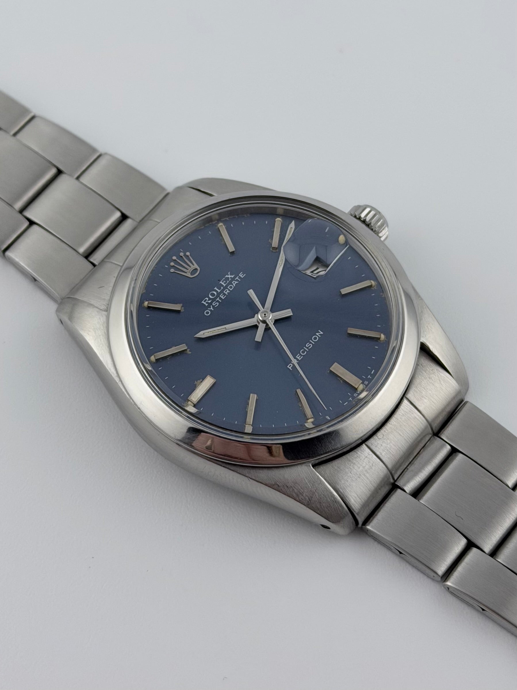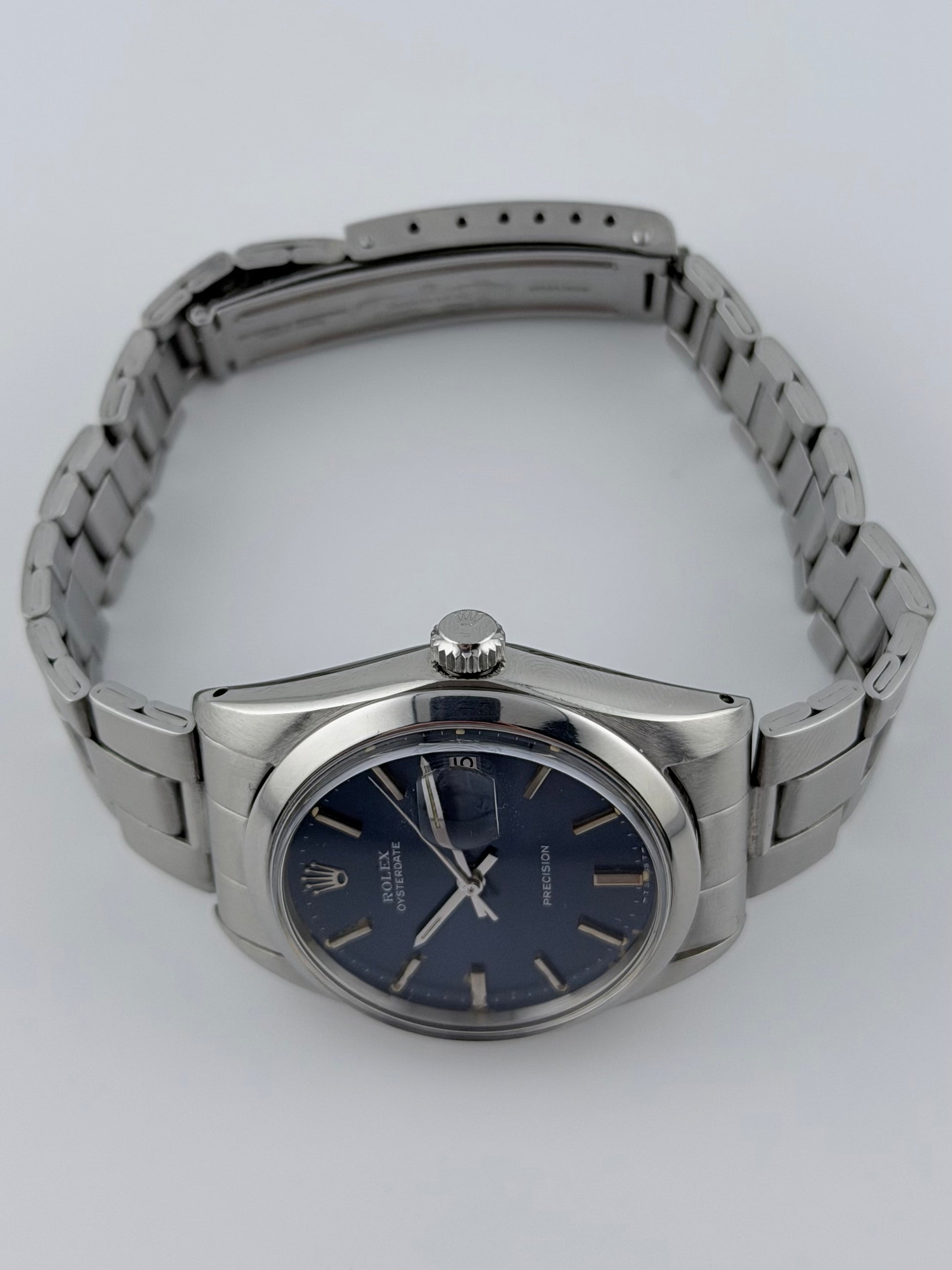 Presented in superb condition is this timeless Rolex Oysterdate Precision from 1971. This piece features an amazing and highly sought after blue sunburst dial which displays original applied baton markers and a fully functional date complication viewed through the classic Rolex cyclops lens. The watch is in stunning, brilliant vintage condition and is running perfectly with the movement being in exceptional mechanical order.