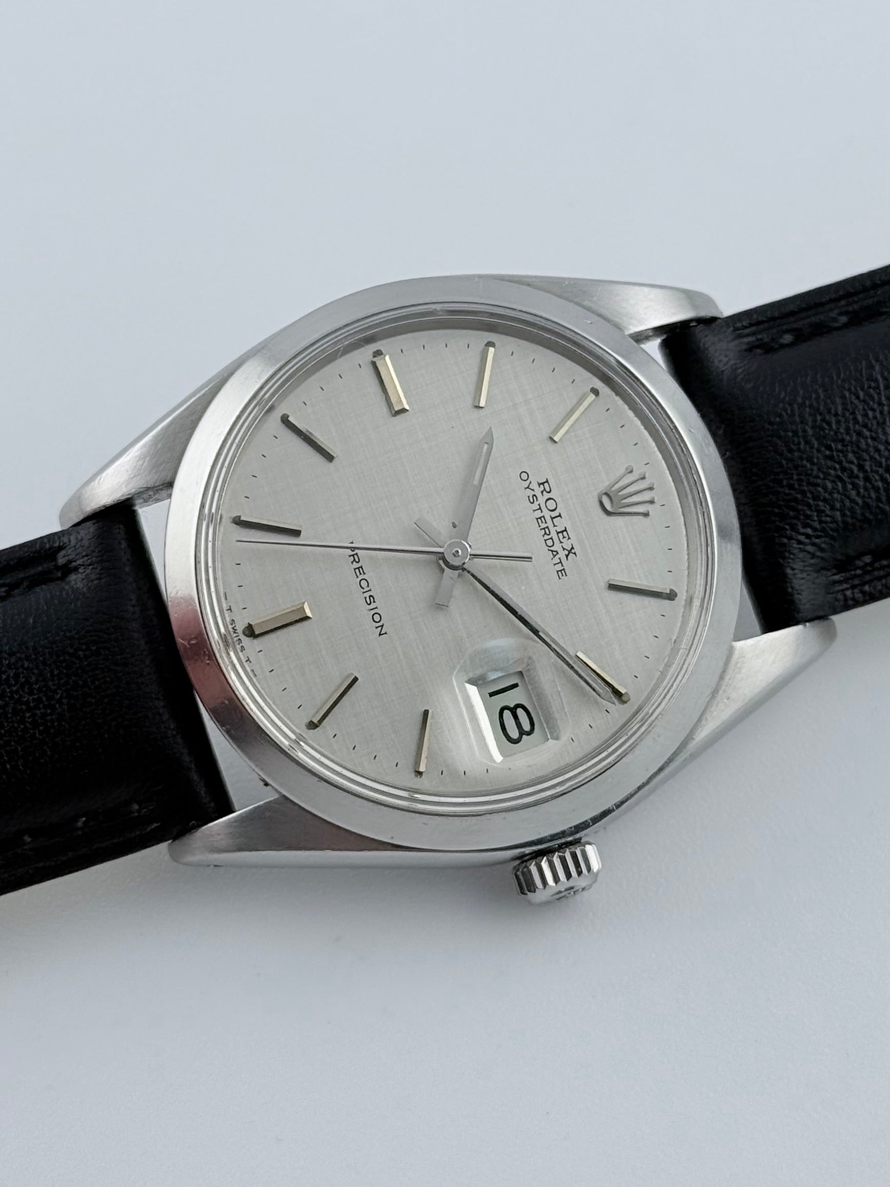 Presented in fantastic vintage condition is this timeless Rolex Oysterdate Precision from the 1960s. This piece features an amazing linen dial which displays original and crisp applied text and a fully functional date complication. The watch is in very nice vintage condition and is running perfectly with the movement being in exceptional mechanical order. Although this watch does not have its original box and papers, it will be presented to its new owner in a luxurious presentation box.