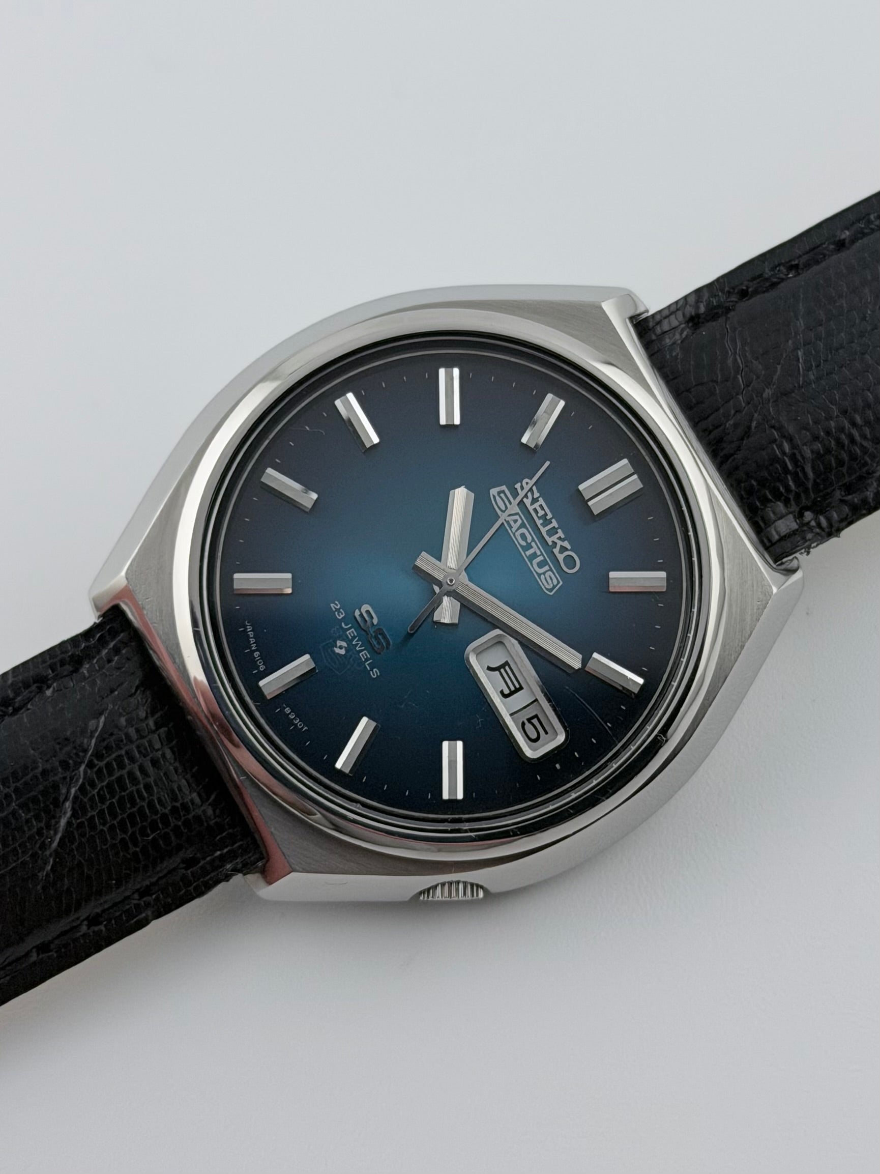 This is a stunning and rare Seiko 5 Actus JDM Automatic from the 1970s. The watch is in excellent condition and features a striking blue colour sunburst dial which displays a fully functional Japanese Kanji/English day-date complication. The watch is in full working order and keeping time.