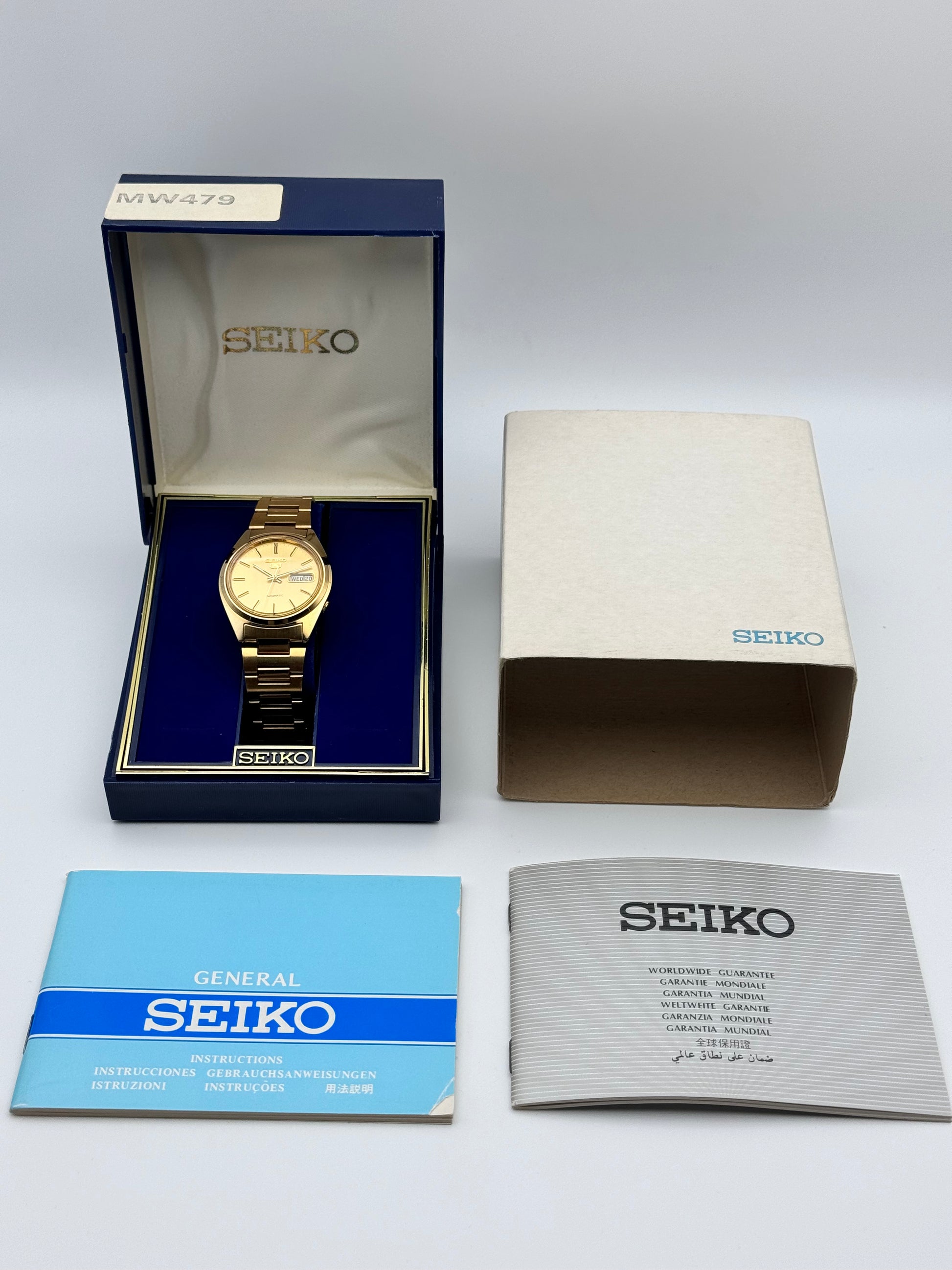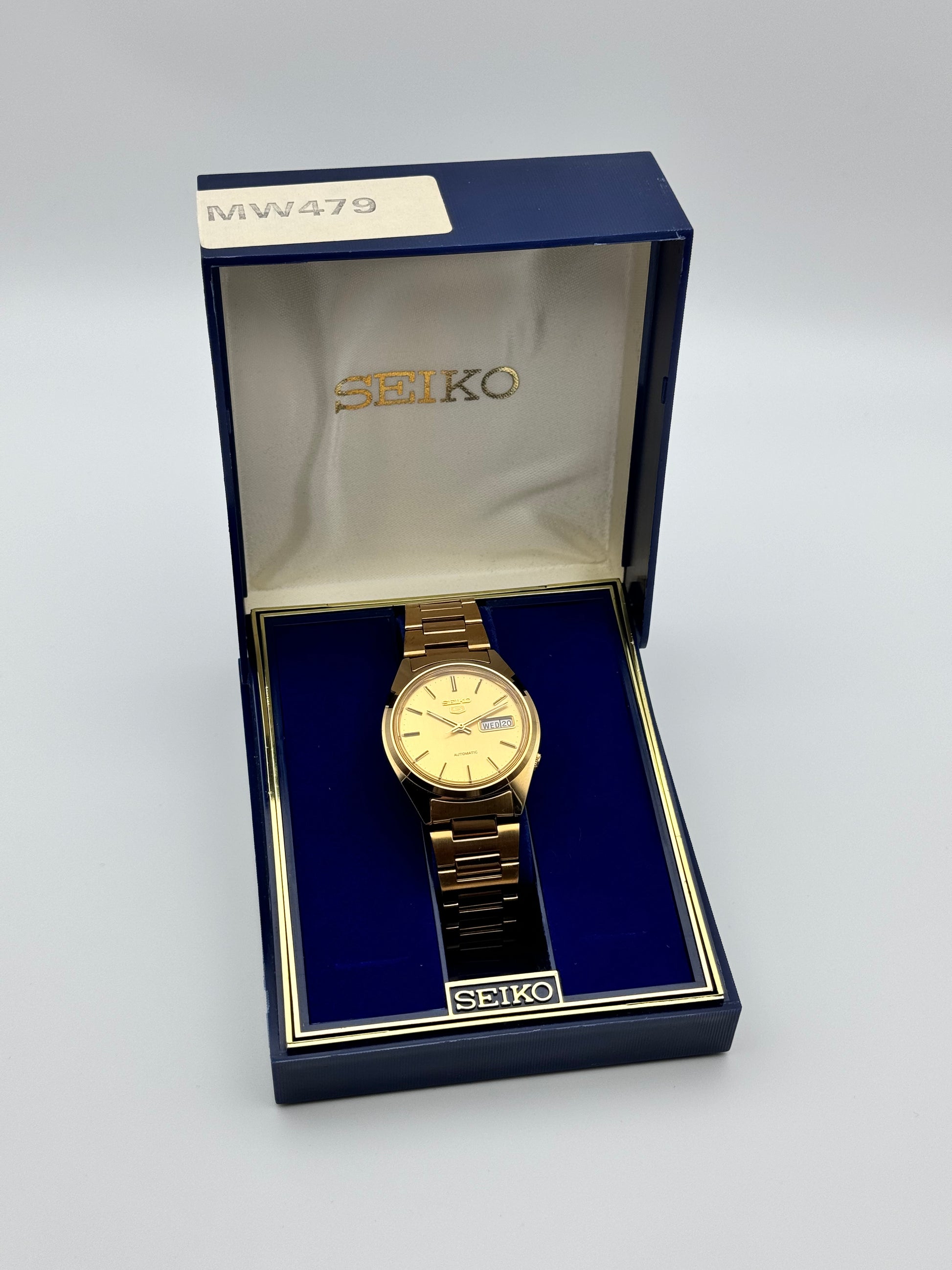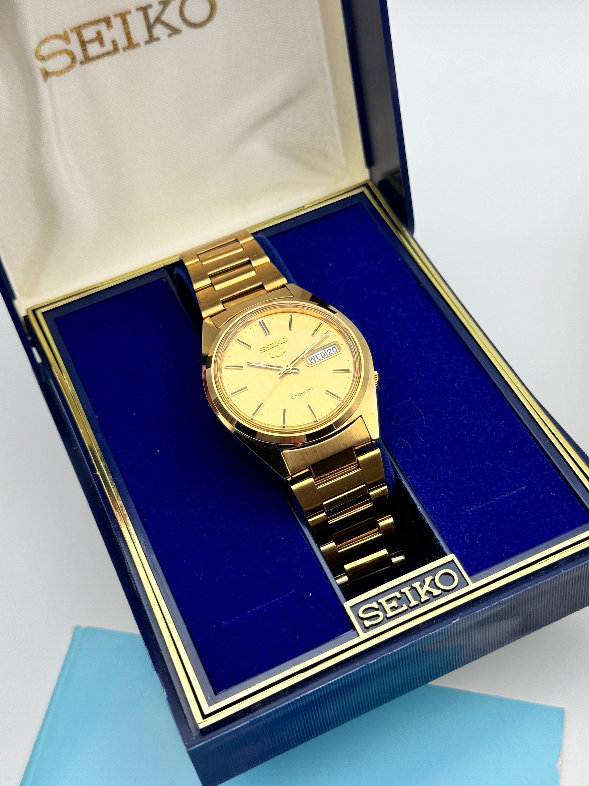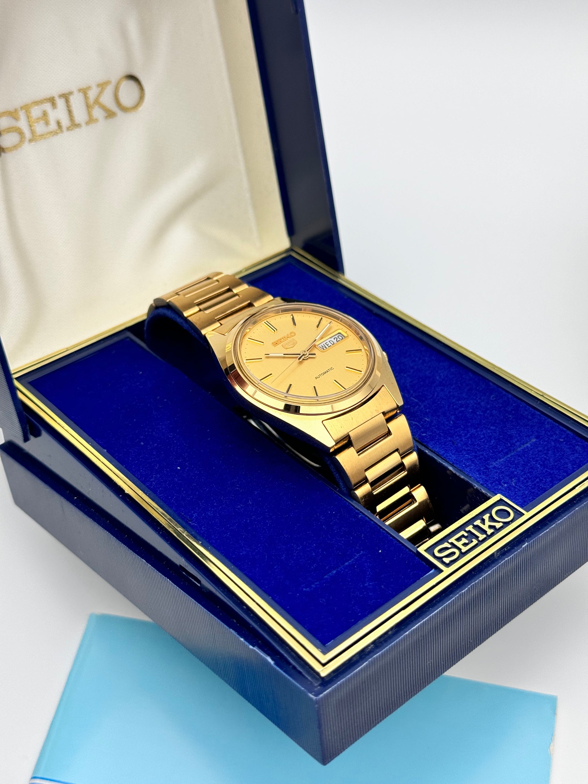 This is a stunning vintage Seiko which features a brushed gold dial. This piece is in near immaculate condition showing signs of just storage marks. The watch is fully functional and keeping time. This piece comes with its original Box, papers and hang tag.