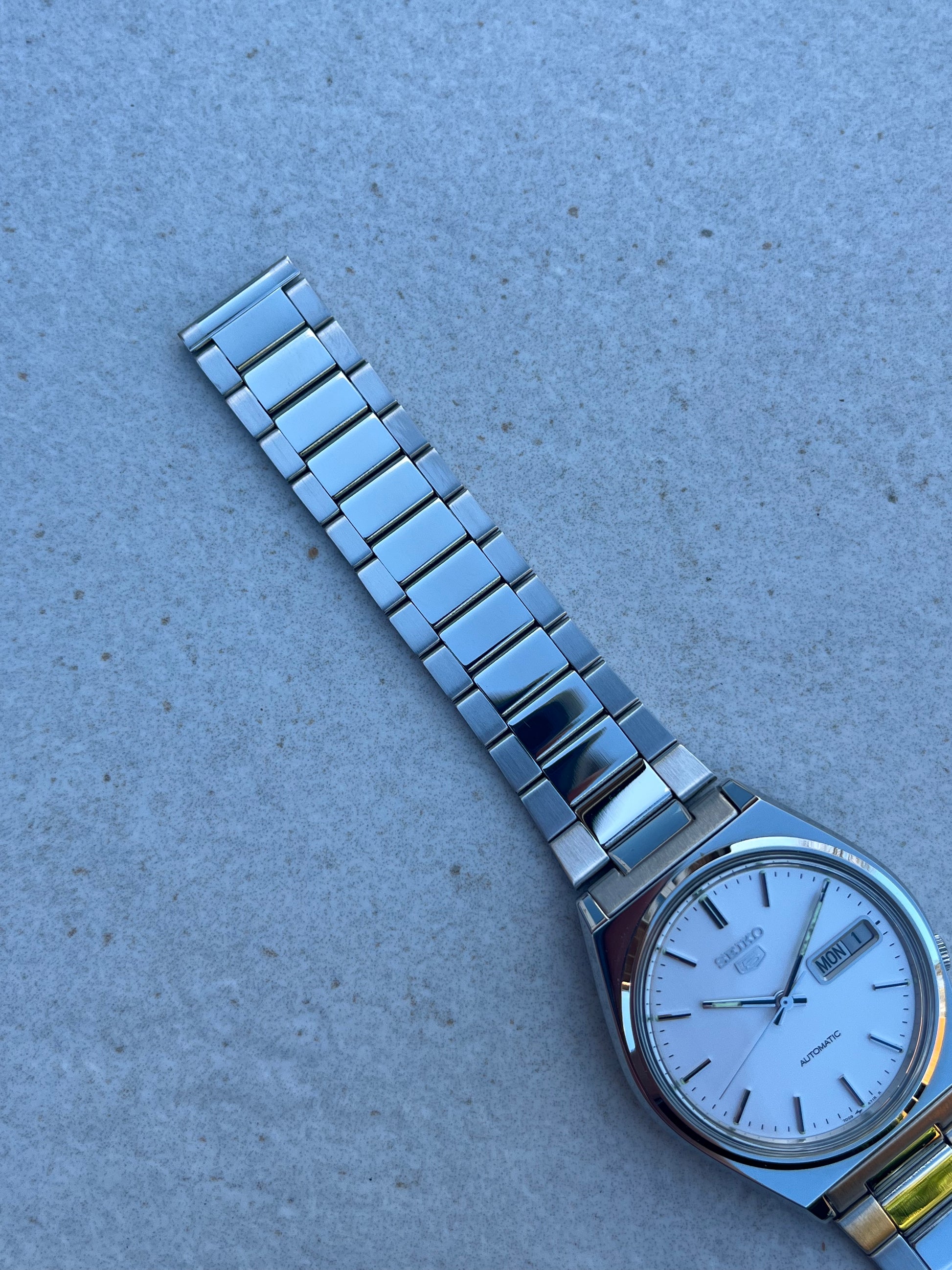 This vintage Seiko 5 is in new old stock condition which is extremely rare to find. The watch does show a few tiny storage marks which is normal for a watch of this age. It has its full box and papers and tags! This model features a beautiful brushed silver dial which displays a fully functional English/French day-date. This piece is keeping great time.