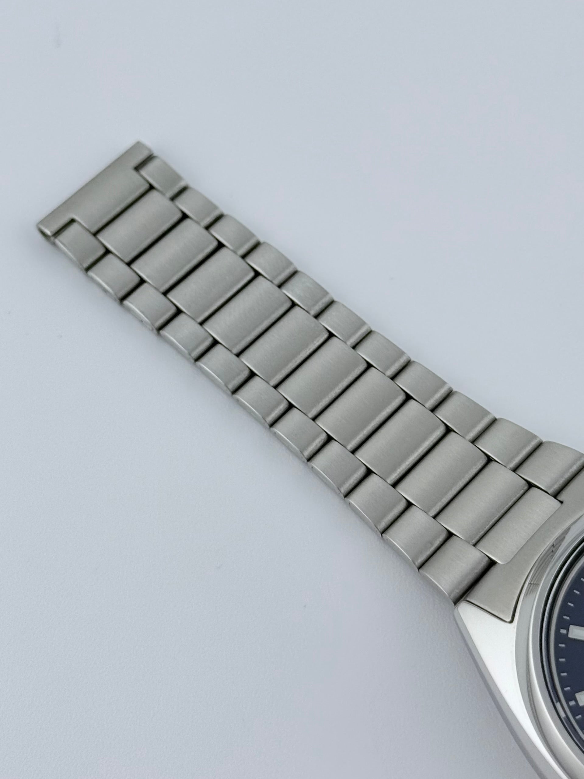 This highly desired Seiko is in near mint condition with an almost mark free case and bracelet. The watch features a beautiful dark blue sunburst dial with a fully functional English/French day-date. This is one of the most sought after dial colours! It also comes with its original box and hang tag.
