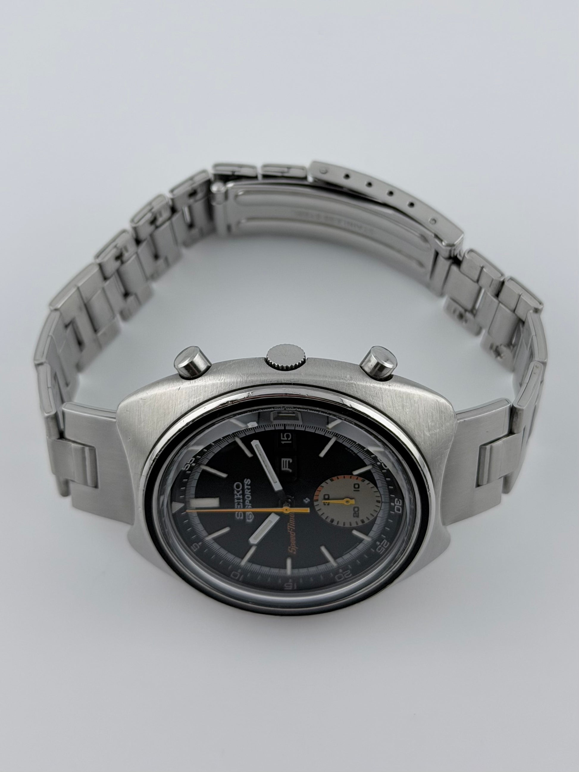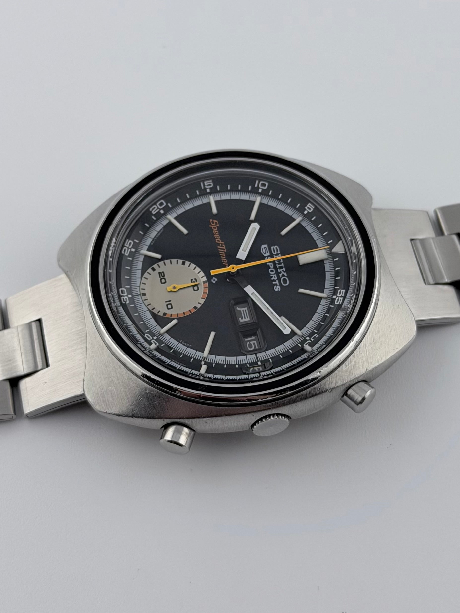 Up for sale we have an iconic piece of Seiko history, the 1971 Seiko 5 Sports Speedtimer from the Japanese Domestic Market (JDM). This particular variant is especially sought after by collectors for its distinctive, rare and striking “Flying Saucer” dial, robust movement, and authentic 1970s sporting heritage. Famously one of the first automatic chronographs ever produced, this watch provides bold design, all original parts as well as its original bracelet and legendary performance, with all its functions working brilliantly. The condition of this special piece is fantastic, rich in vintage character and showing only mild wear and age.