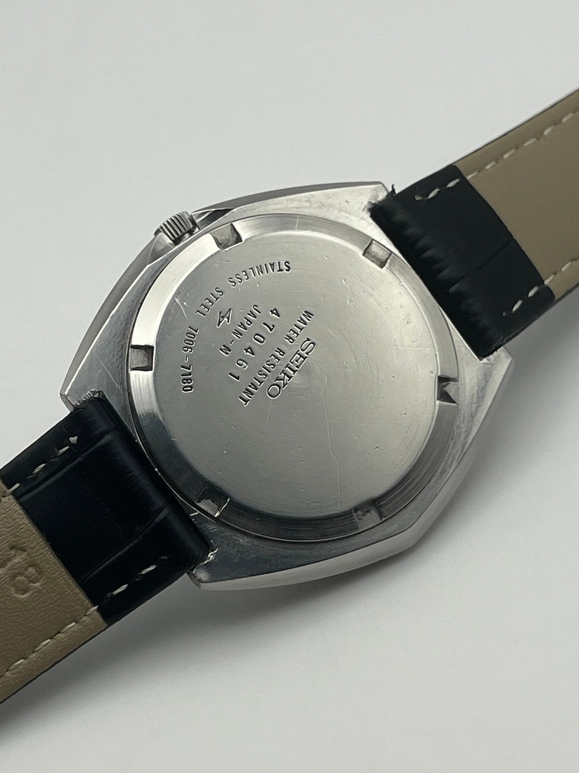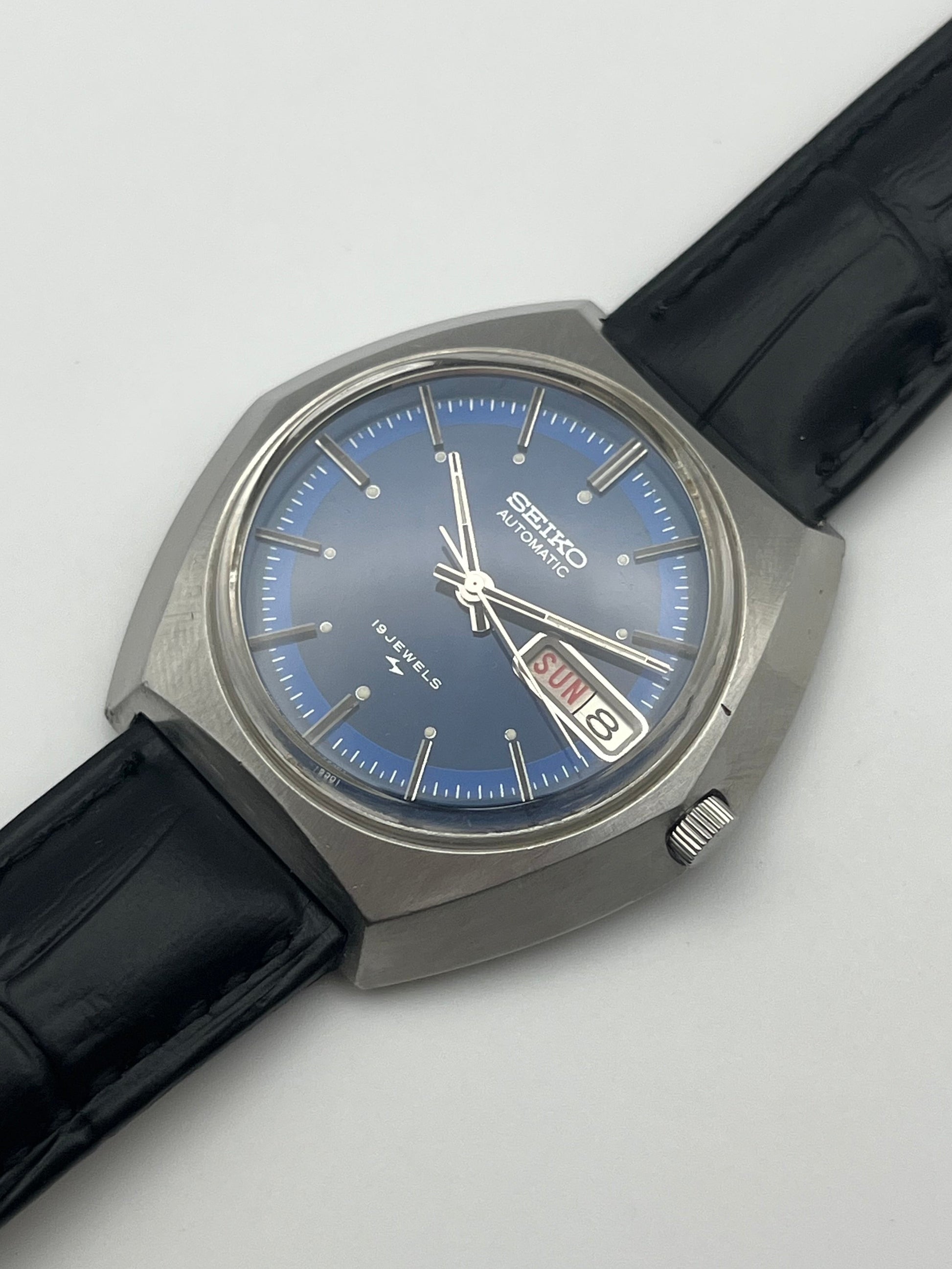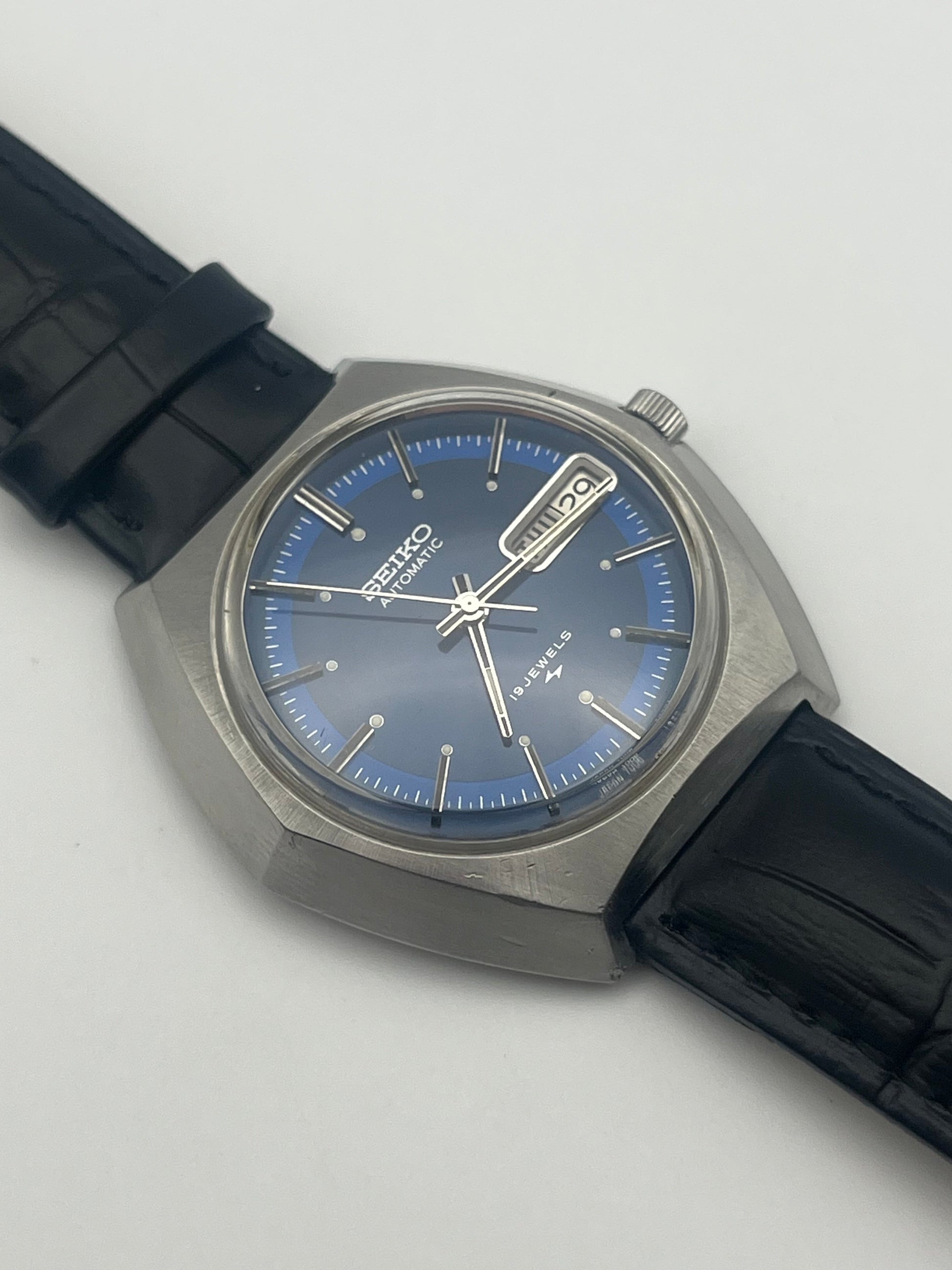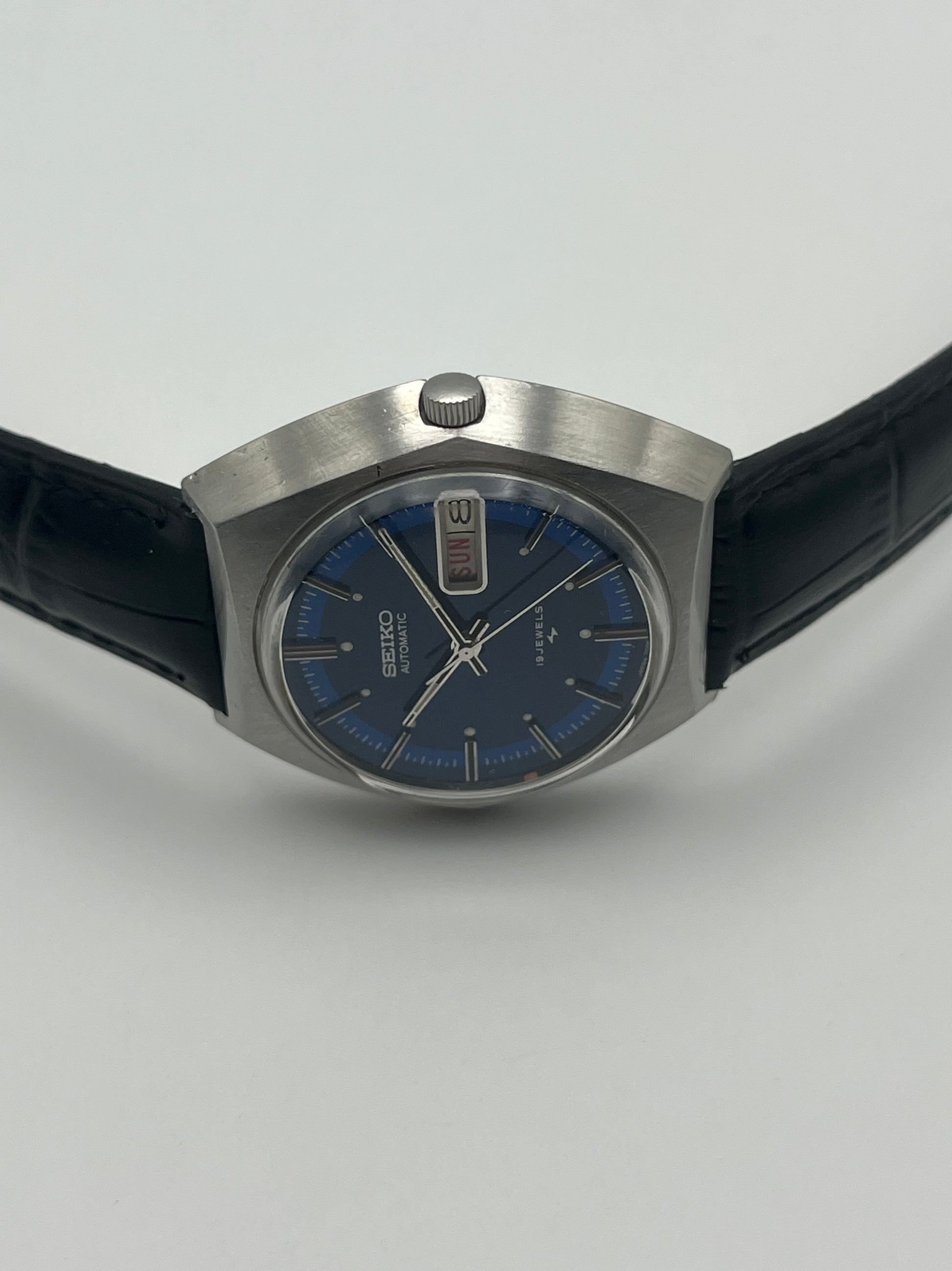 This vintage Seiko is in superb condition for its age with a distinctive and very attractive two tone blue dial with a fully functioning English day date complication. The dial is virtually mark free and the original lume spots are still present. The day is changed by moving the hands back and fourth past the 12am mark. This is normal for the 7006 movement. The watch is in full working order and keeping time.