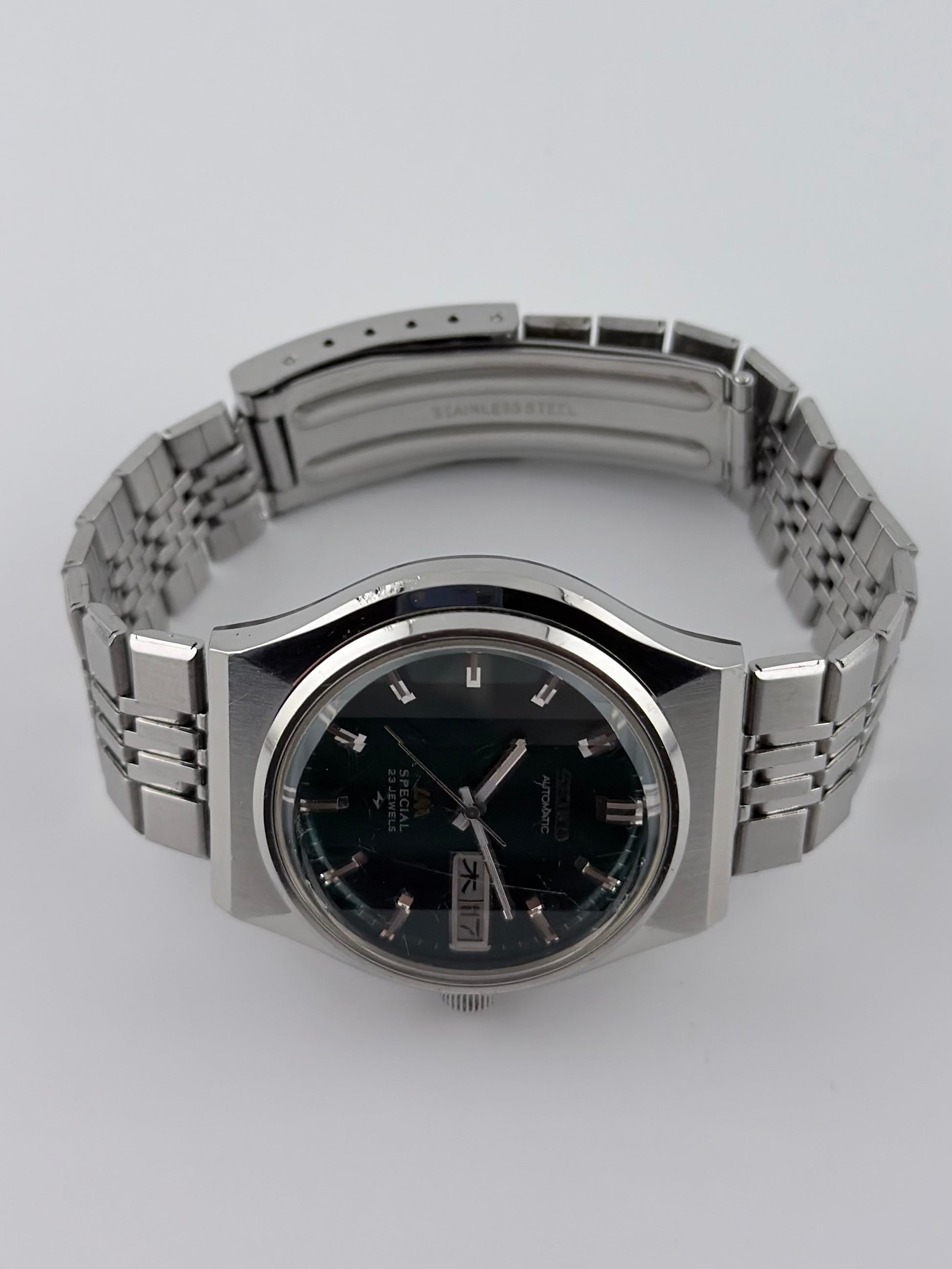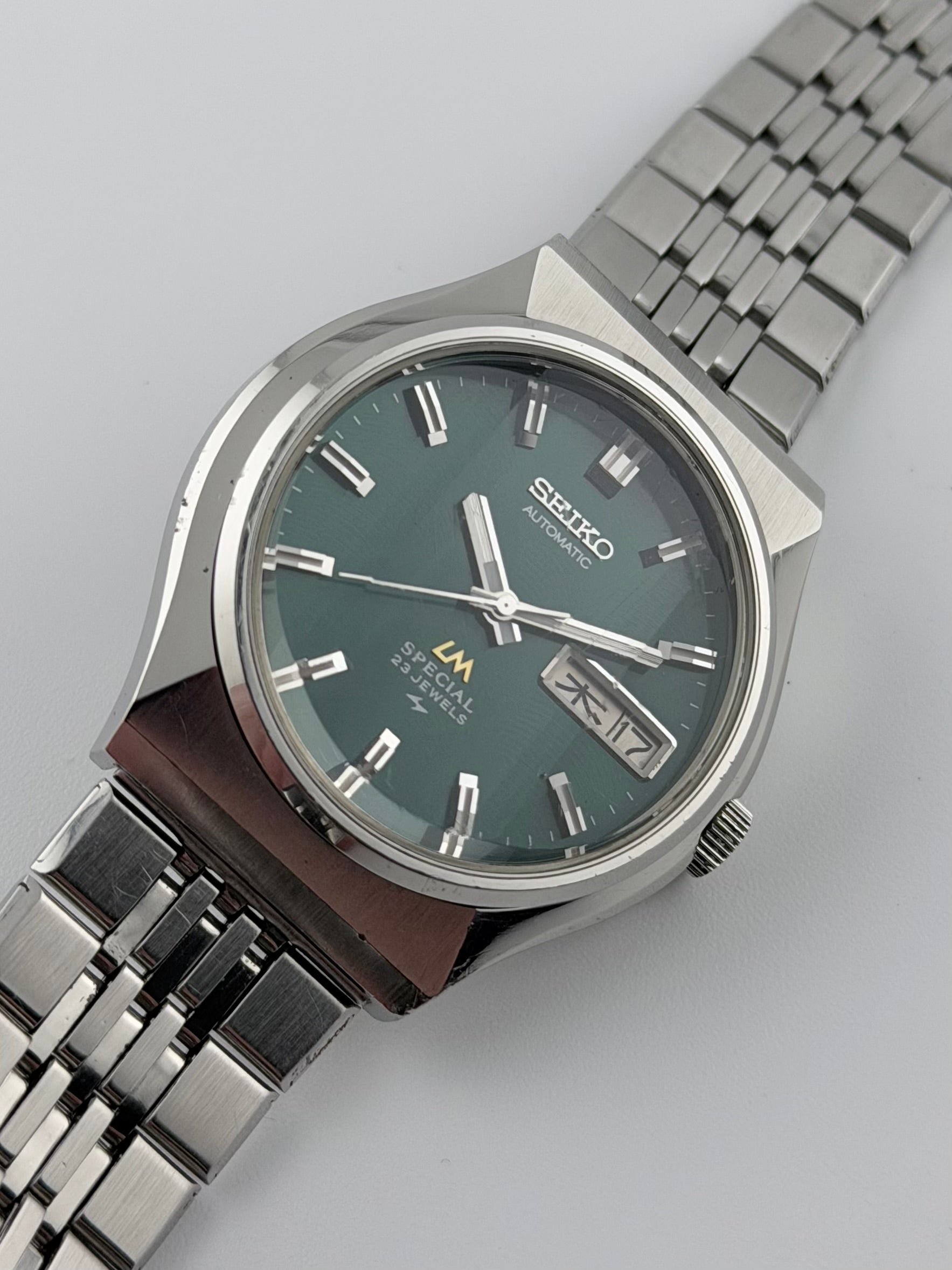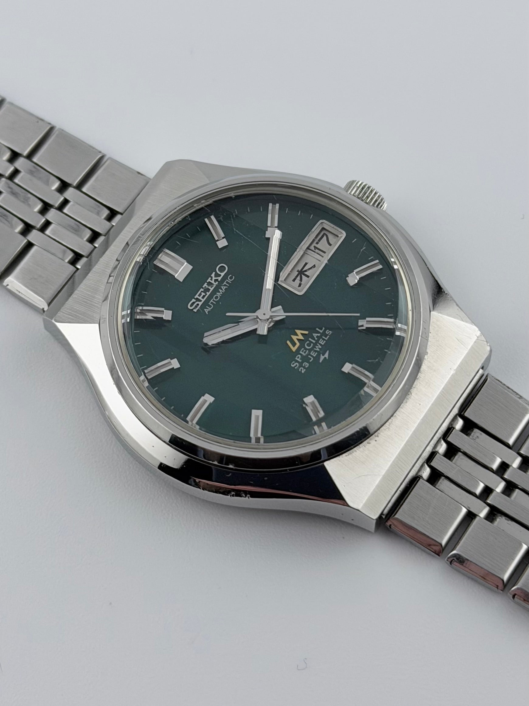 This is an absolutely incredible and extremely rare JDM Seiko LM with a high-beat automatic movement with hand winding capabilities. Featuring a green dial which is unusually brushed with curved strokes creating a fascinating effect in the light, further enhanced by the multi-faceted crystal. The stunning dial also displays a fully operational Japanese Kanji/English day-date complication. The case is unique in its design and retains its brushwork showing minor wear throughout the case. This piece comes with its original bracelet and buckle and the watch is in full working order, keeping excellent time. The mineral glass does have a number of small scratches but in view of the unique faceted glass we feel this should be retained and they are more visible only in certain light.