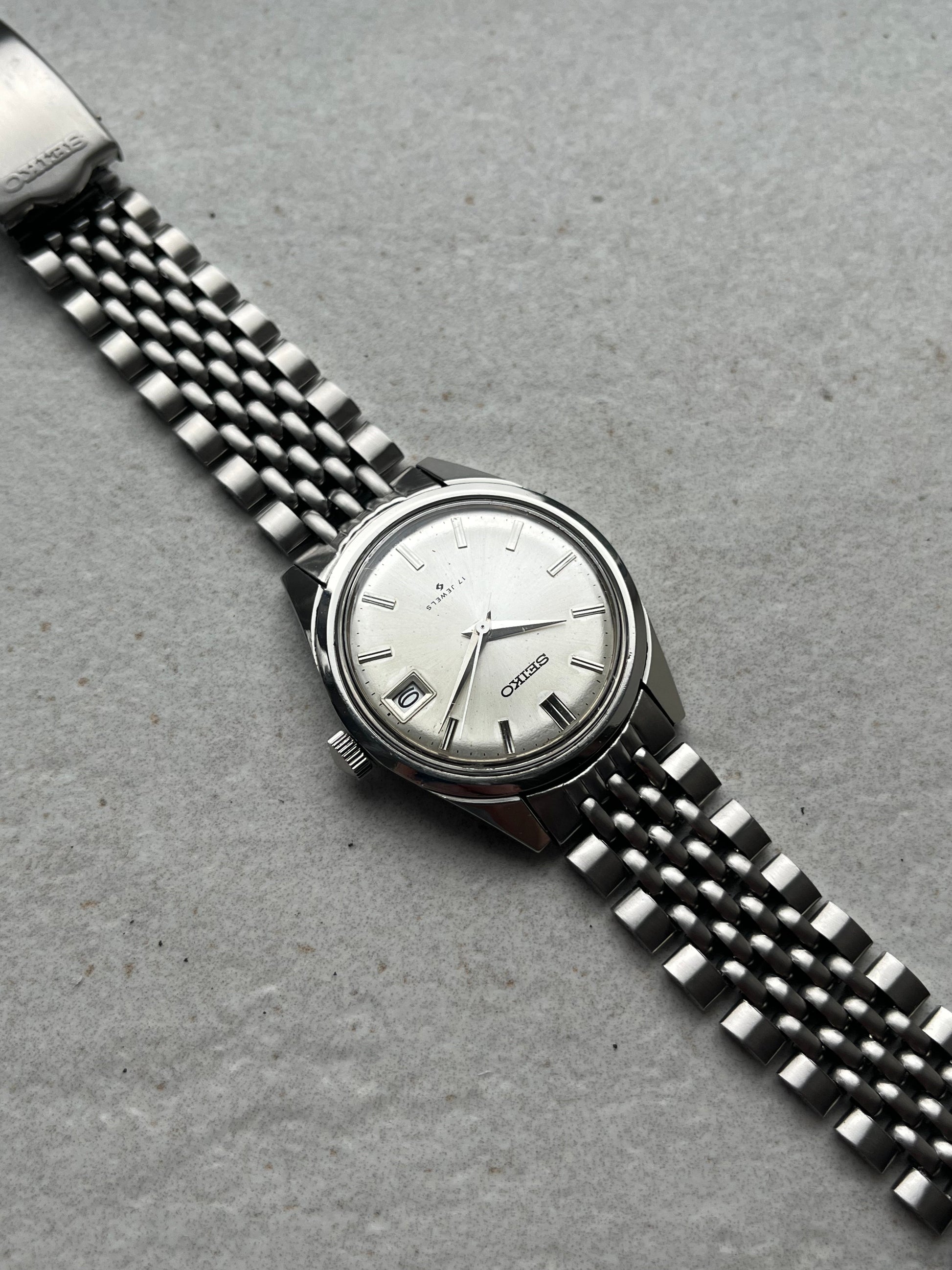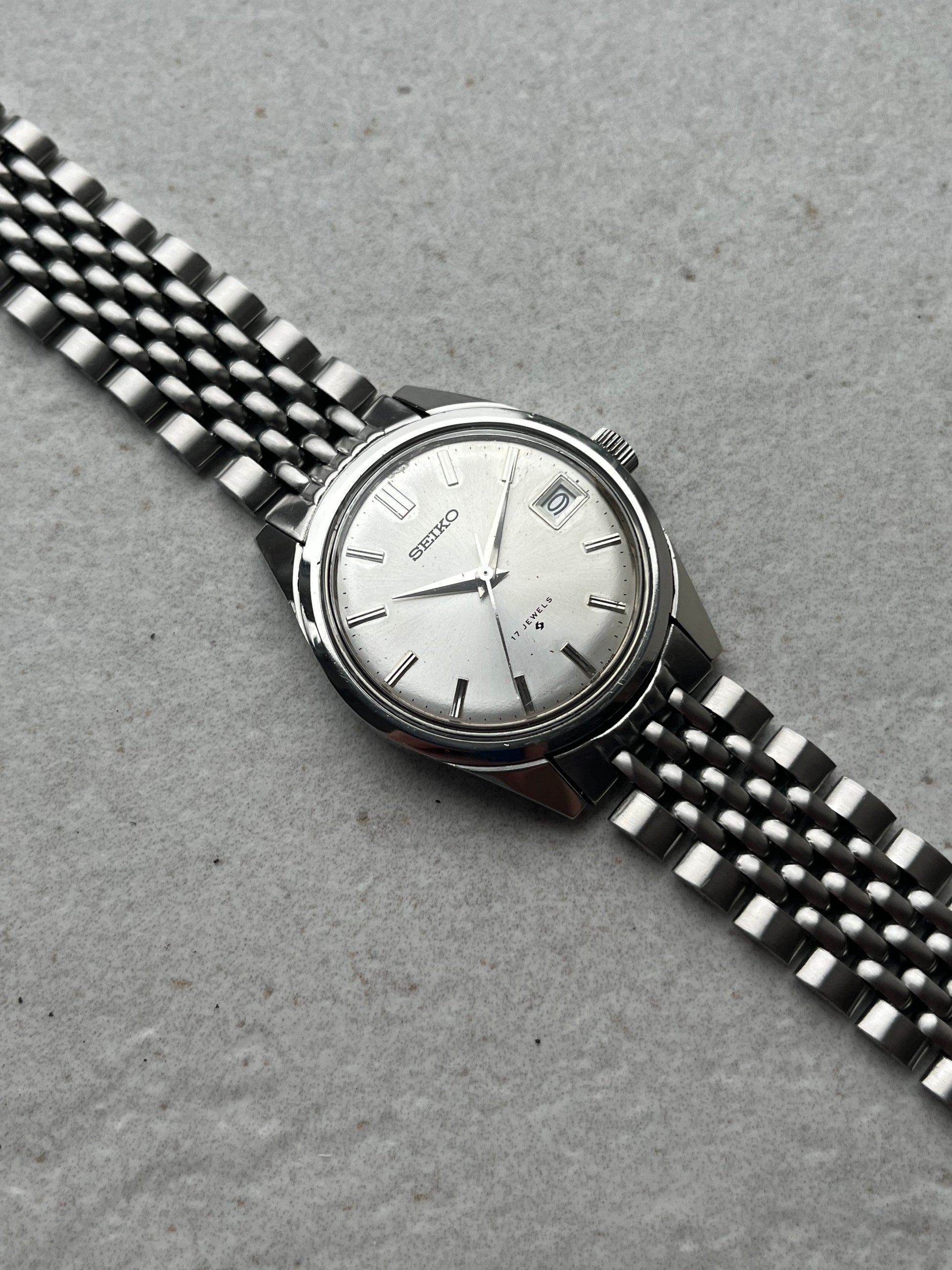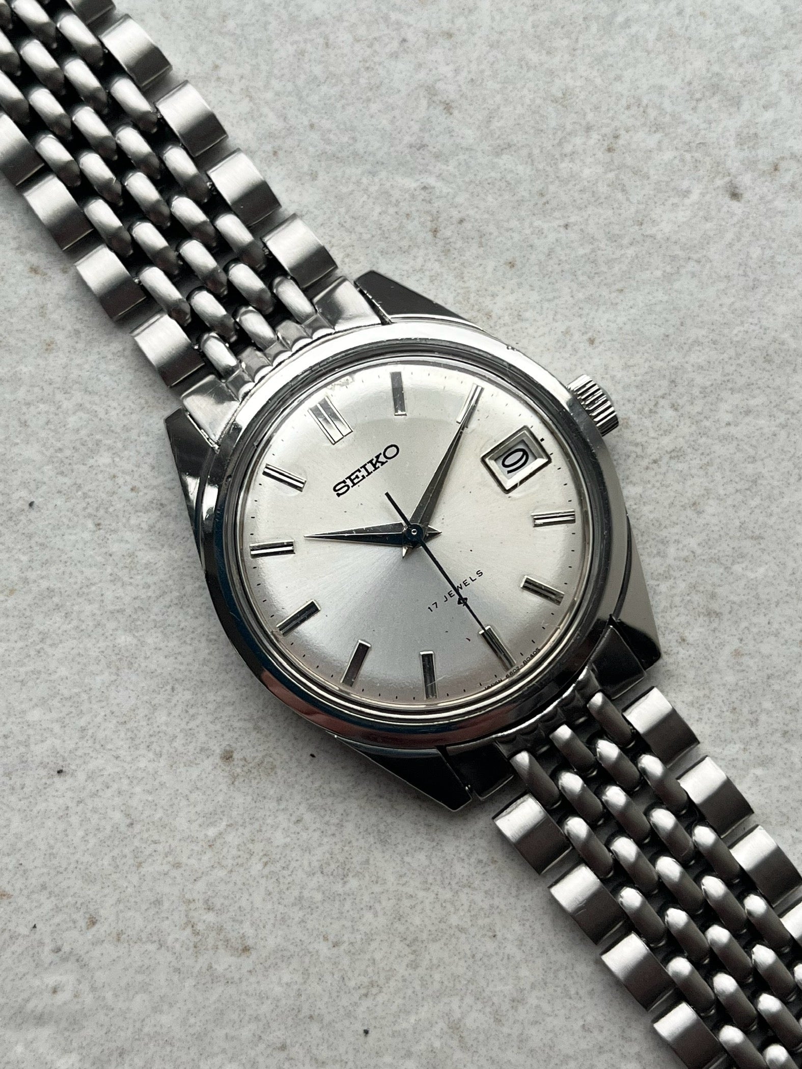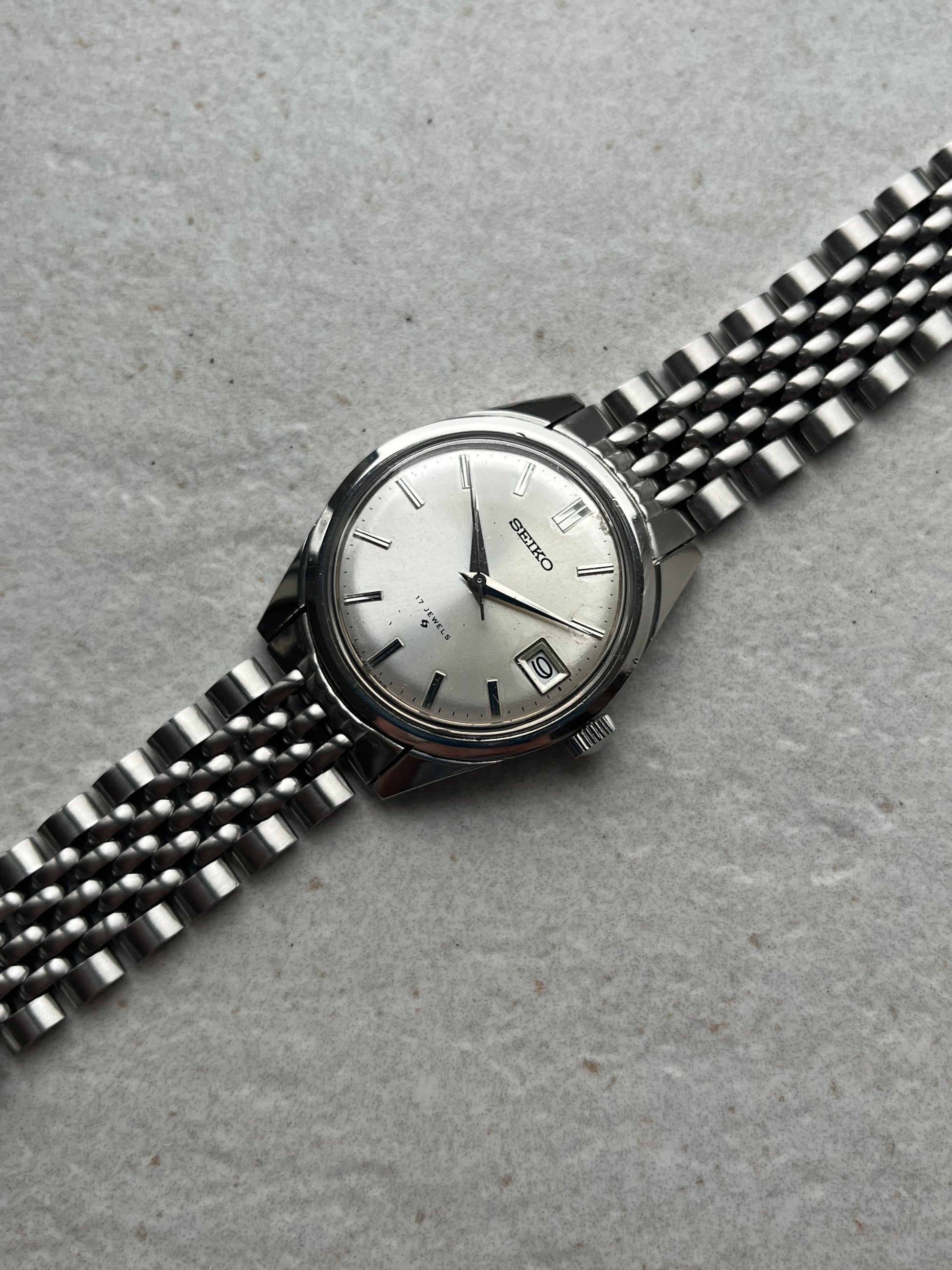 This is an absolutely gorgeous and rare Seiko manual wind from the 1960s. This model features a sunburst silver dial which displays a fully functional date complication. The case sits on a stunning original beads of rice bracelet which is extremely hard to find! This example is in good vintage condition. The dial does have some vintage wear and patina. This watch is definitely one for a vintage watch enthusiasts who likes their wrist to show vintage aesthetic! It is also in full working order and keeping time.