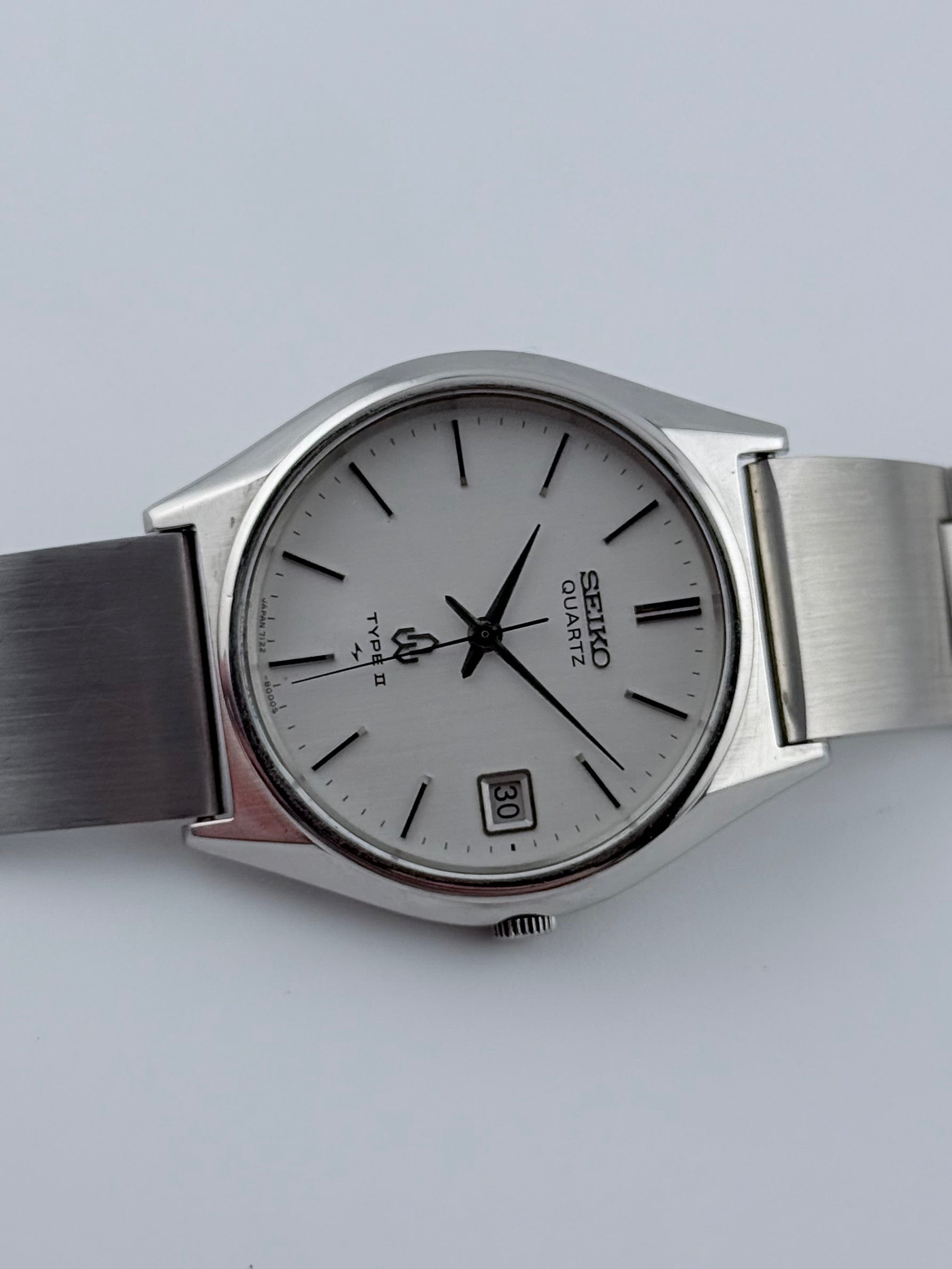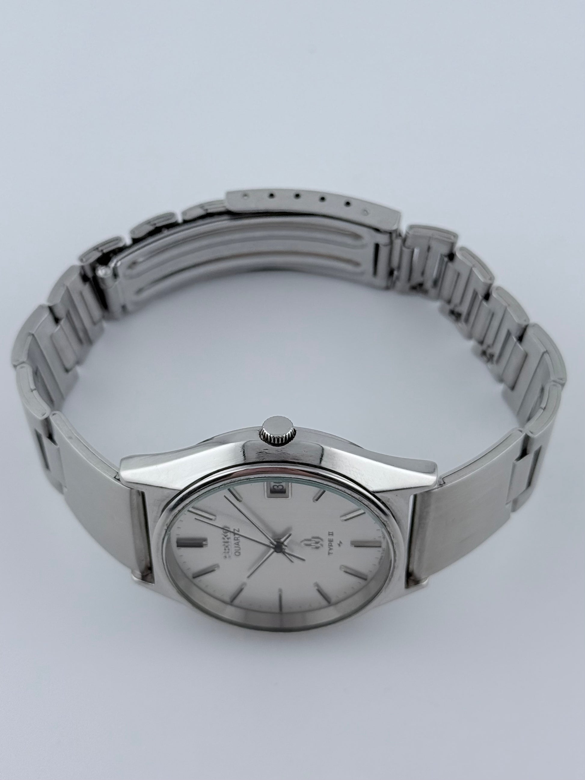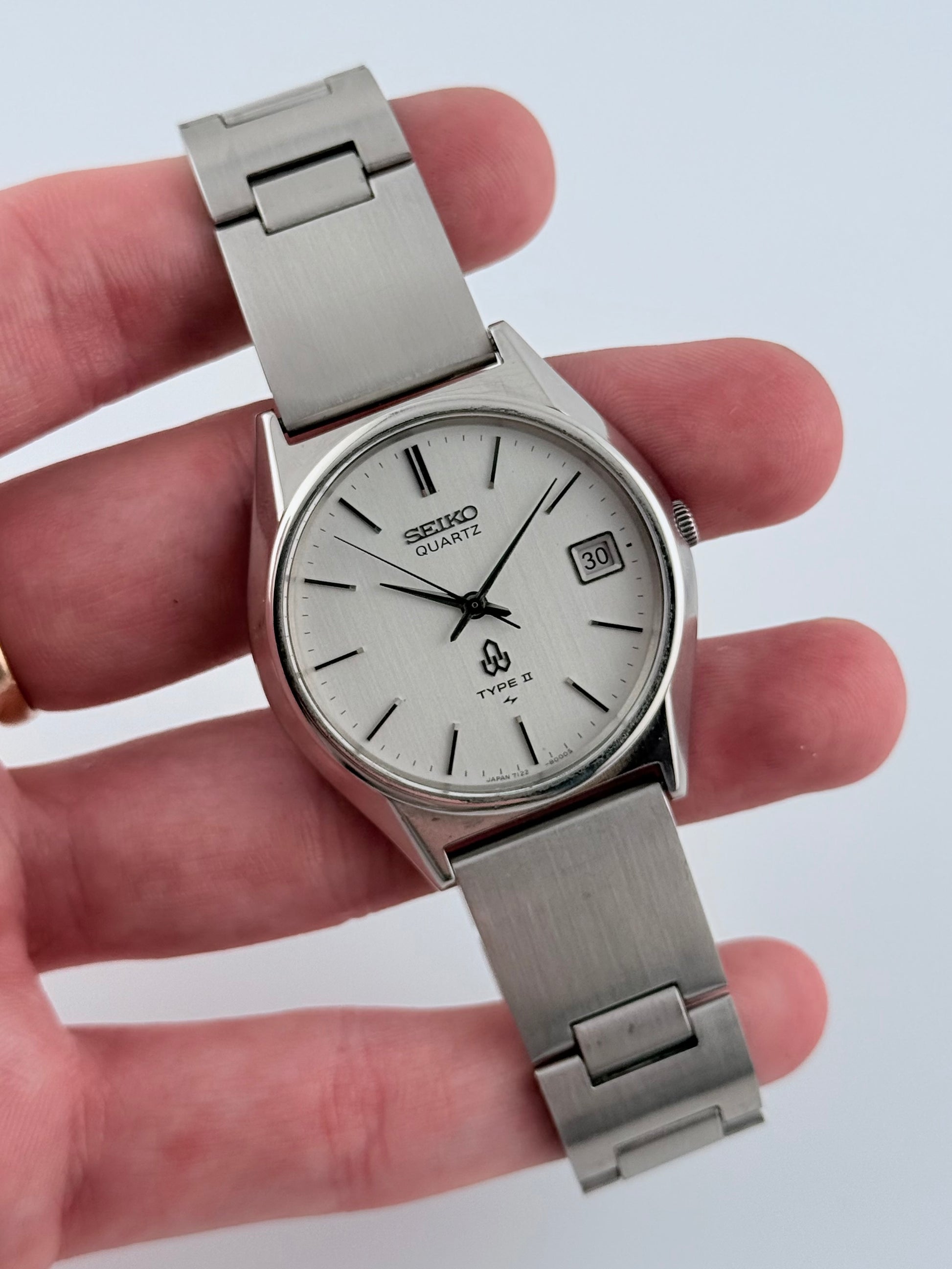 This Seiko features a beautiful silver brushed dial with a fully functional date complication. The watch also features an interesting and rare Seiko bracelet. The watch is in excellent condition showing just a few signs of wear. It is also fully functional and keeping time.
