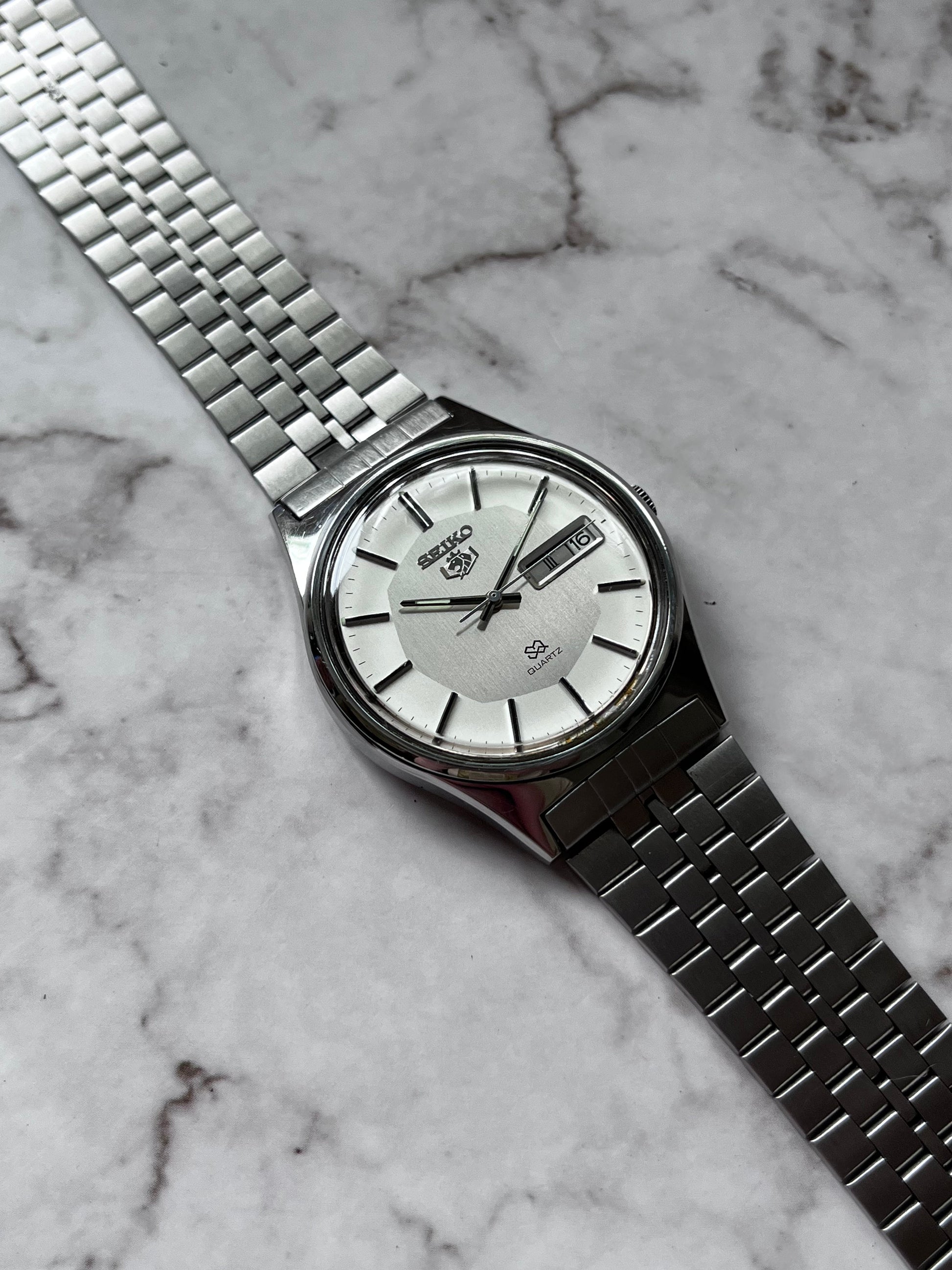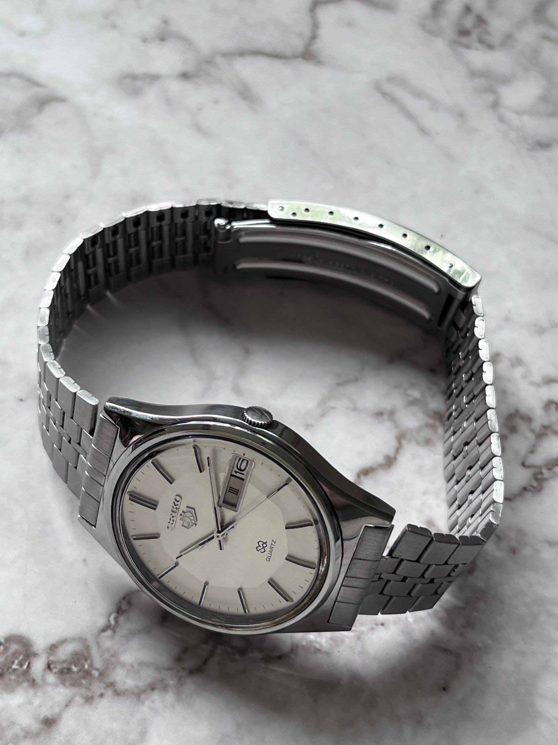 This is a very rare vintage Seiko SQ Quartz which features a rare Lion head Octagonal Dial. This watch is in good condition for its age showing light signs of use. This model has a fully functional Roman Numeral/English day-date. The watch is in overall great condition and is fully working keeping good time.