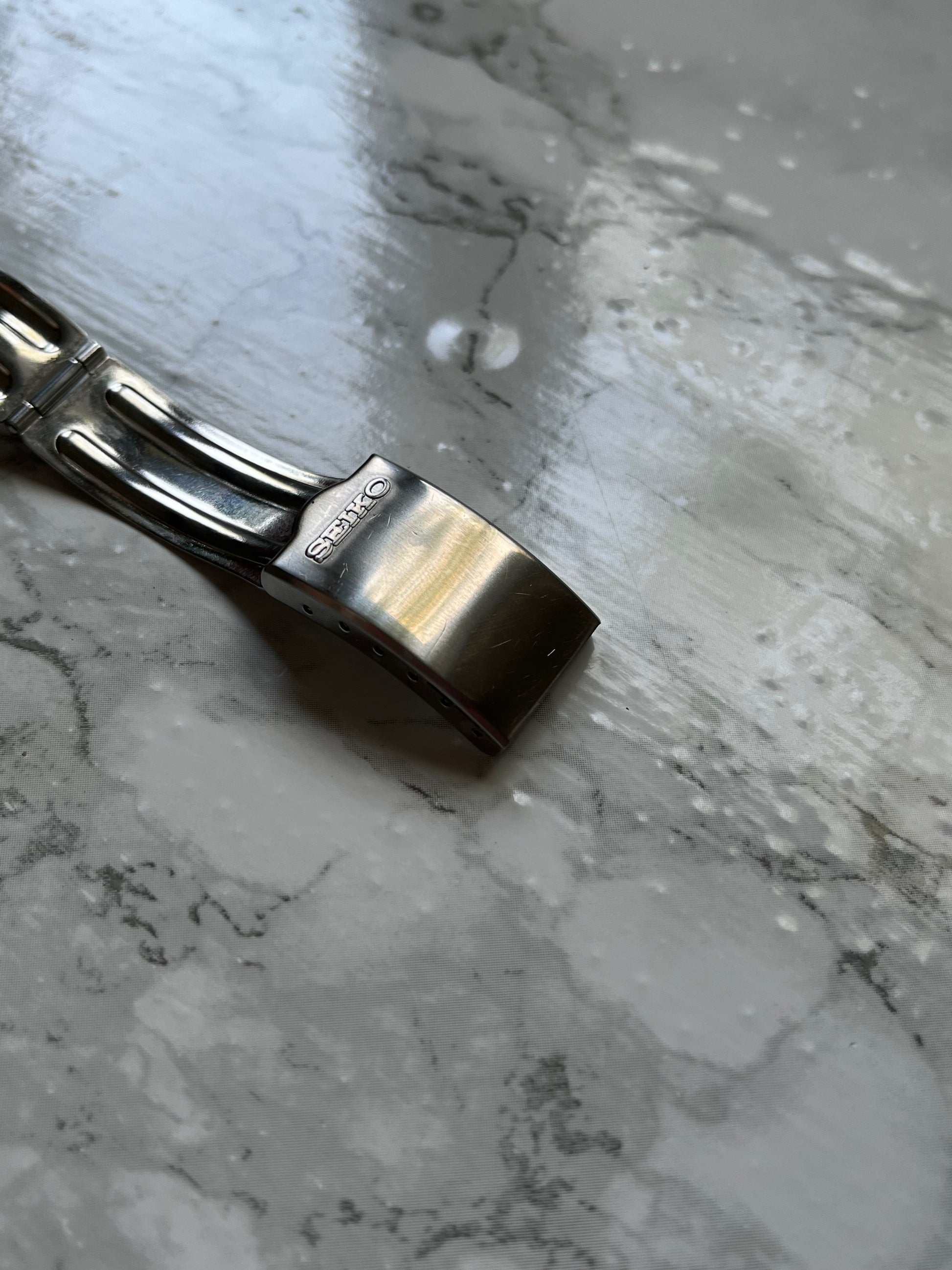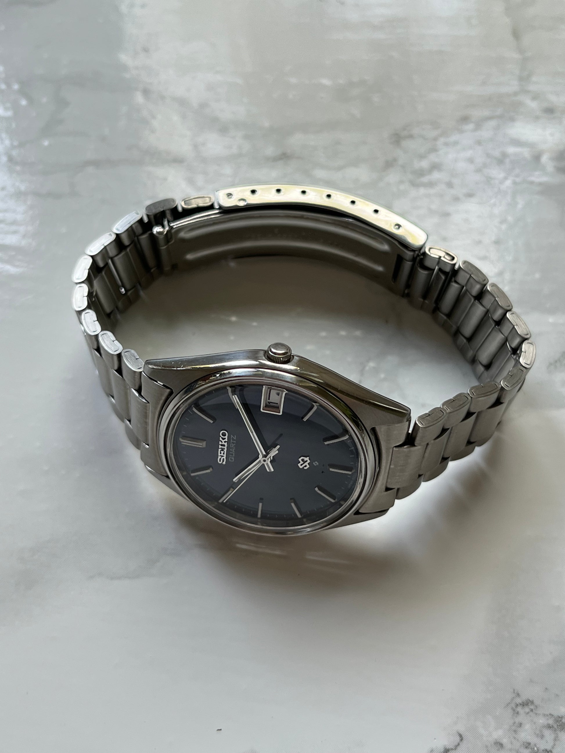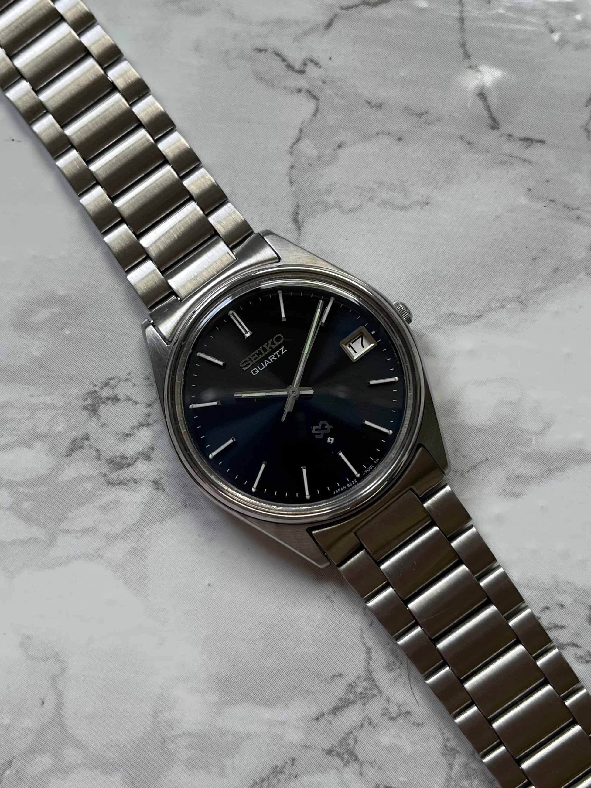 This is a lovely Seiko Quartz from 1980 that features a beautiful blue sunburst dial which displays a fully functional date complication. This watch is fully functional and keeps excellent time.