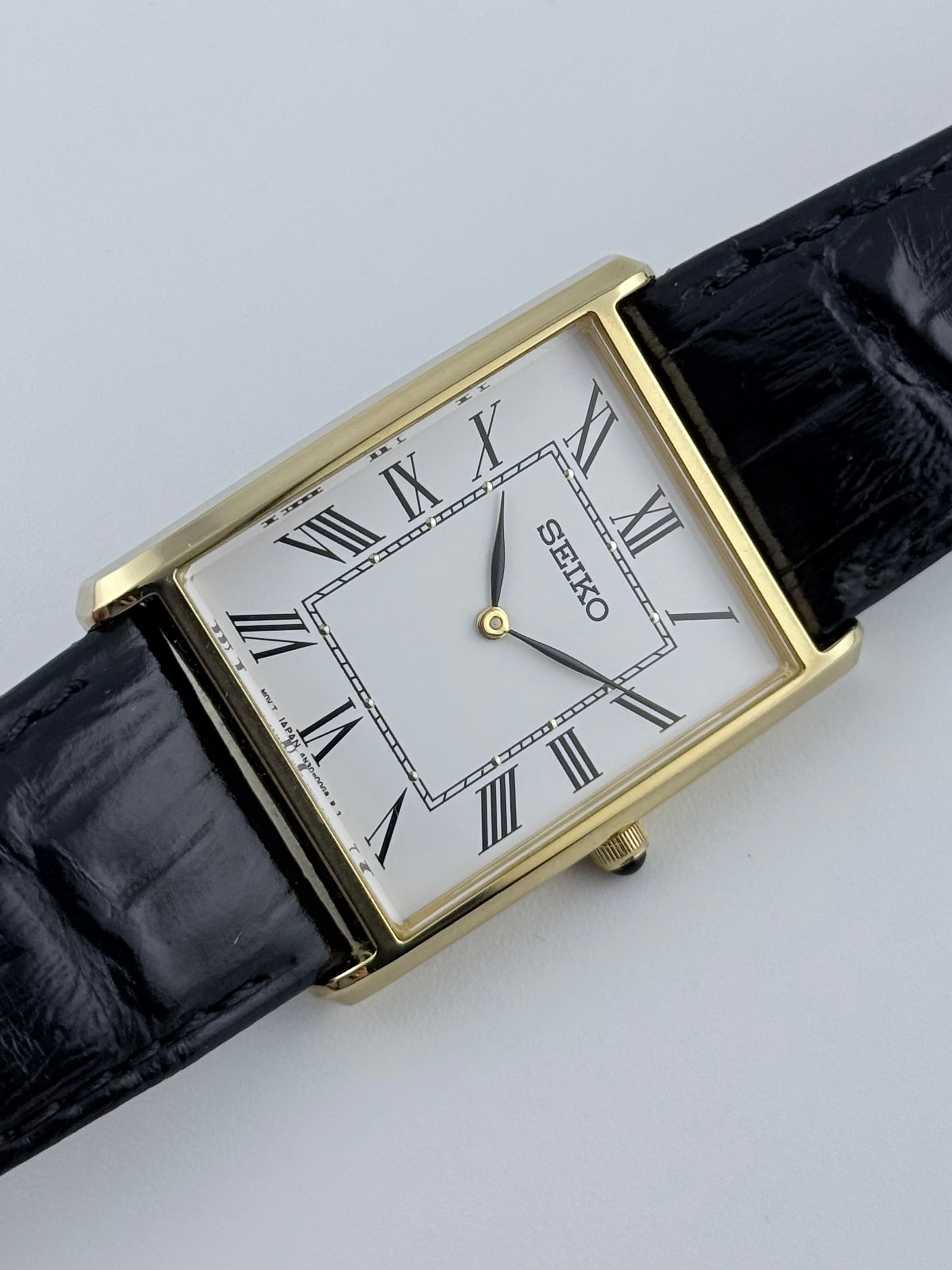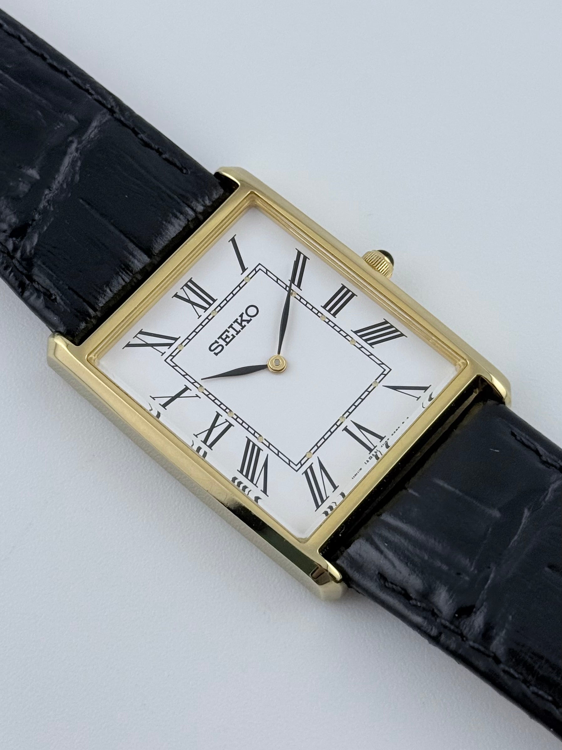 This is a stunning Seiko Tank which features a white dial with Roman Numeral markers in a gold coloured case . This tank is very hard to find these days despite being a newer model. This piece is the perfect alternative to the Cartier tank. The watch is working perfectly and features it’s original strap which is in excellent condition.