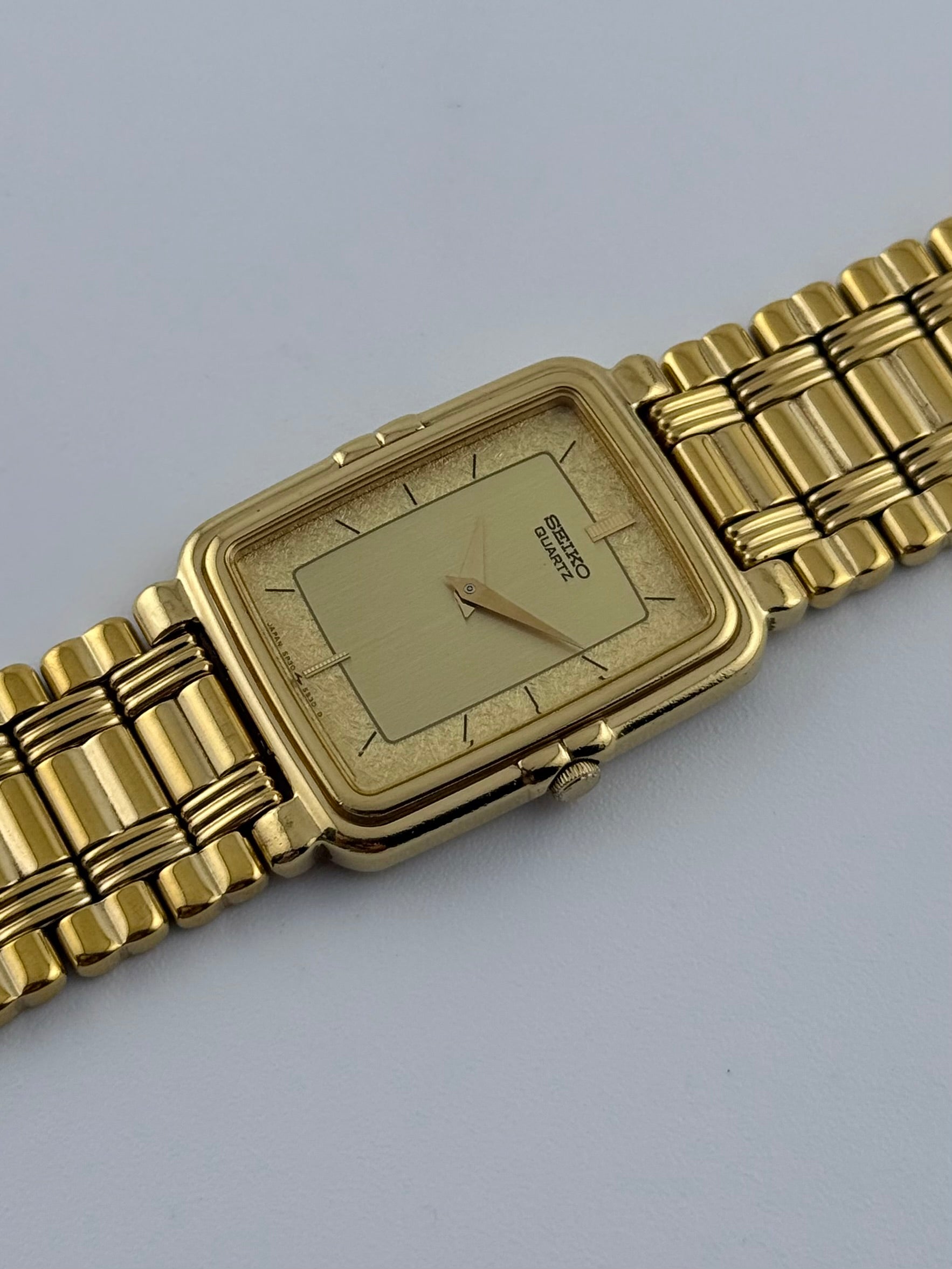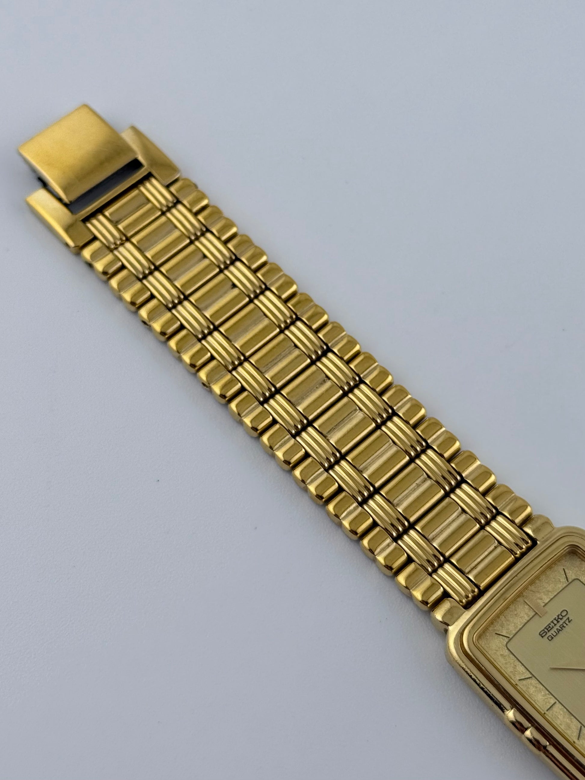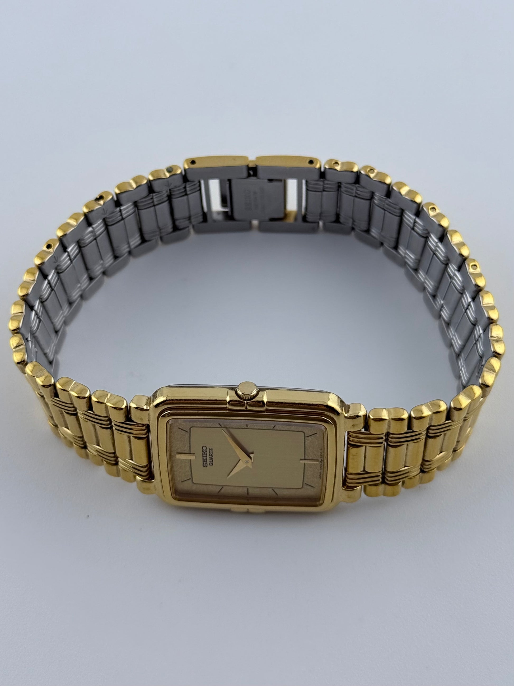 This lovely 1990s Seiko Tank with a beautiful two tone dial is featuring baton markers and dauphine hands. This is combined with a gold coloured bracelet that remains in superb condition. This gorgeous watch is in great condition for its age and is the perfect budget dress watch. The watch is mechanically functioning well and only shows a small handful of very light scratches on the case and back case.