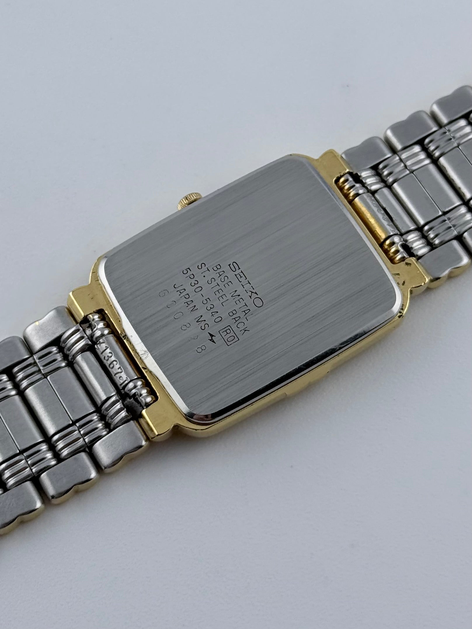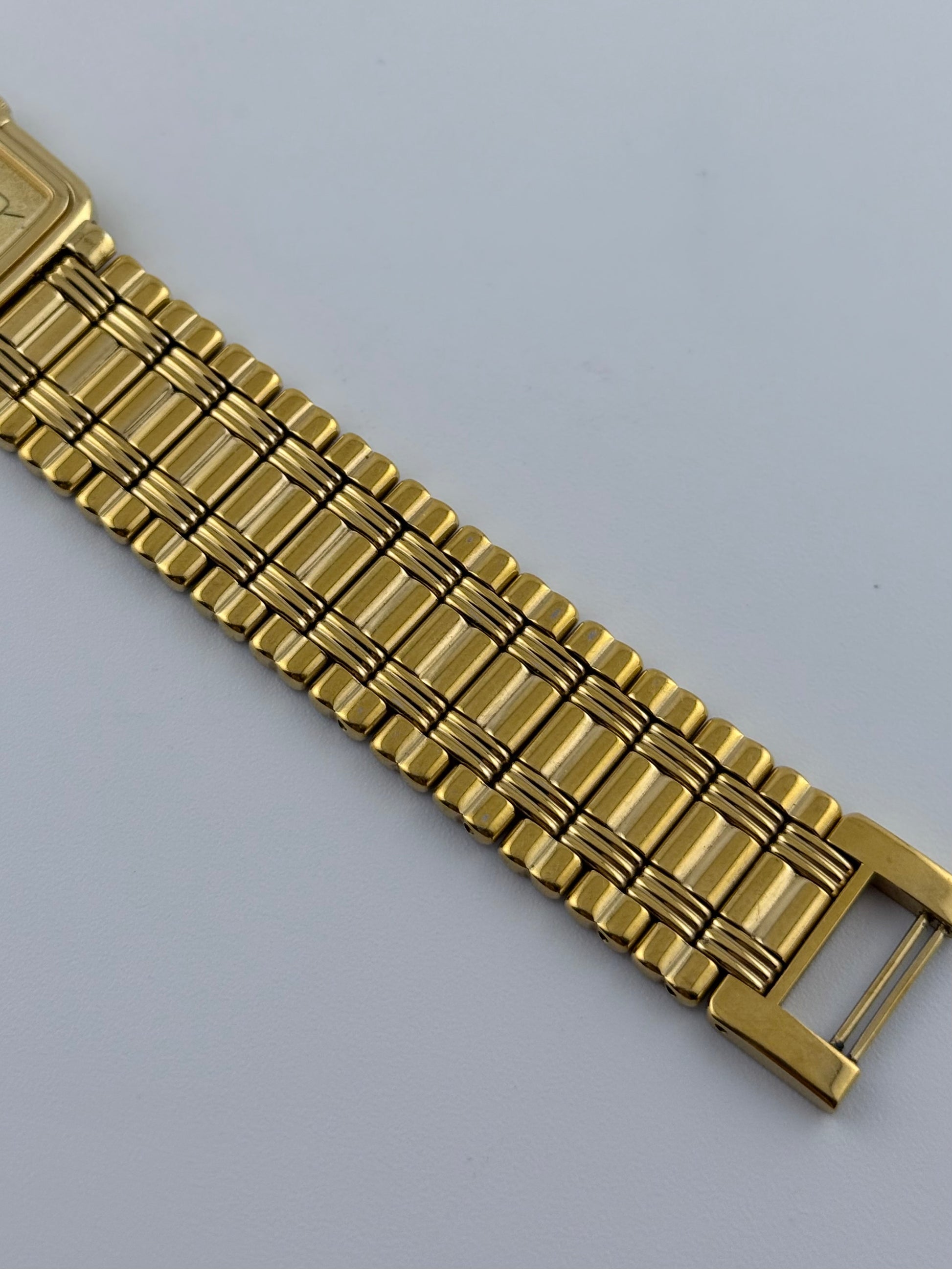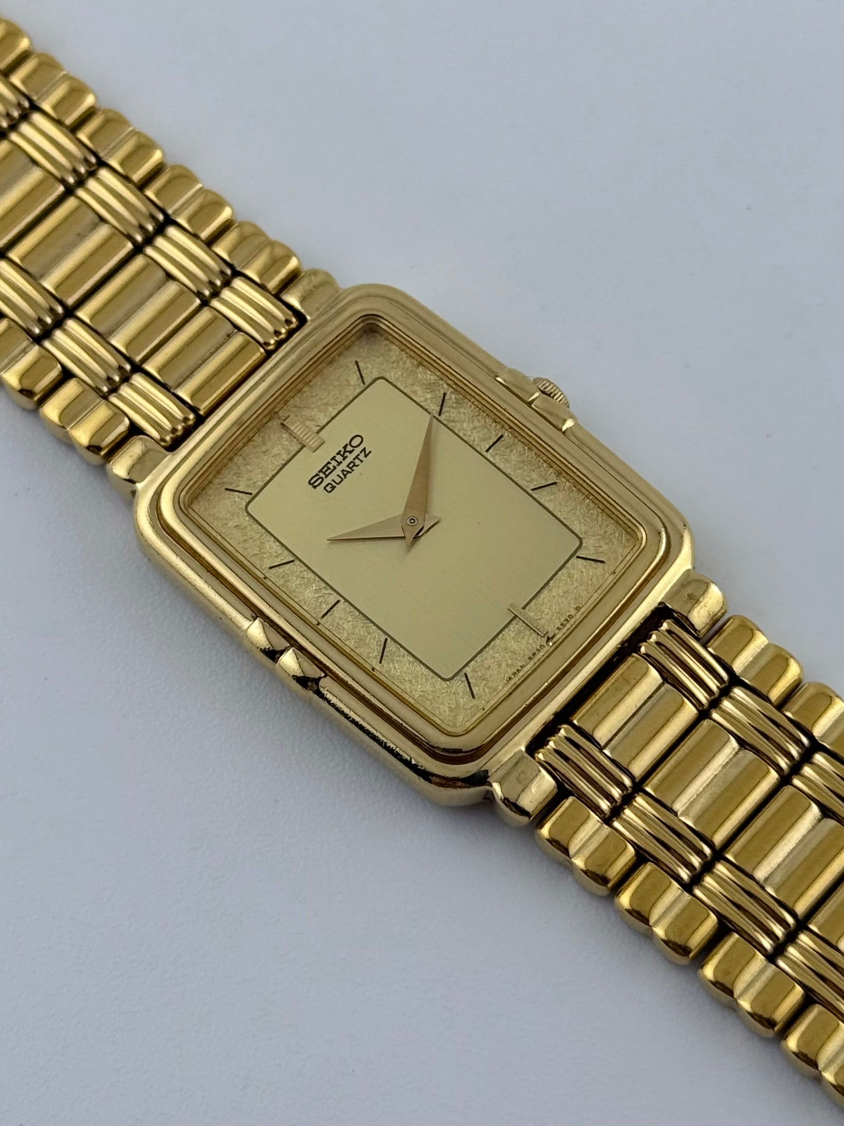 This lovely 1990s Seiko Tank with a beautiful two tone dial is featuring baton markers and dauphine hands. This is combined with a gold coloured bracelet that remains in superb condition. This gorgeous watch is in great condition for its age and is the perfect budget dress watch. The watch is mechanically functioning well and only shows a small handful of very light scratches on the case and back case.