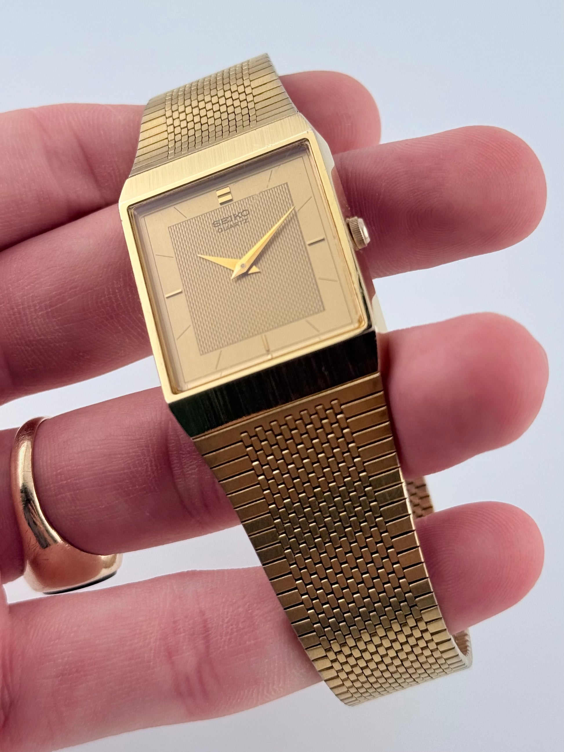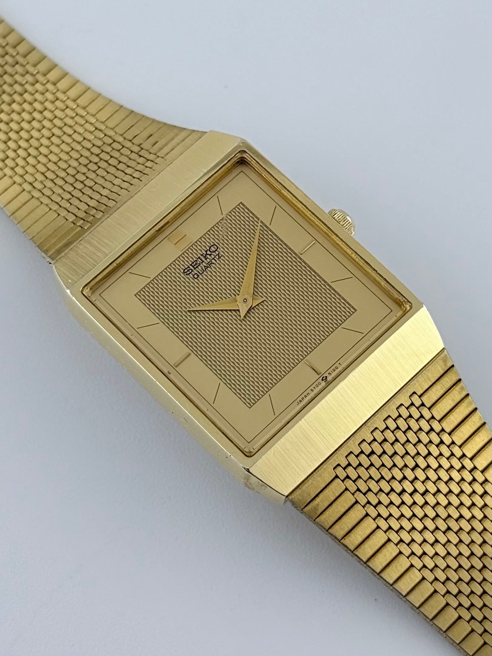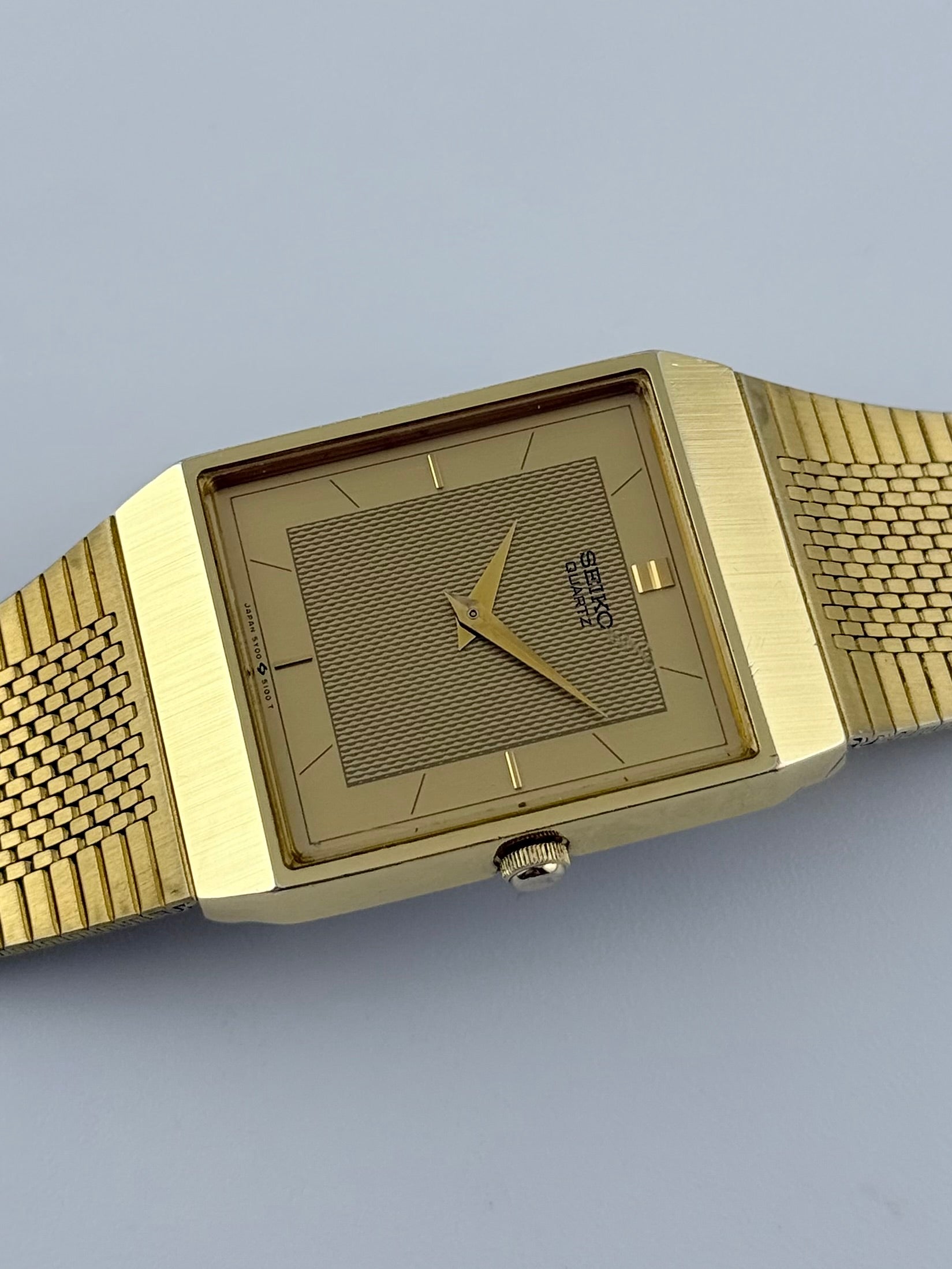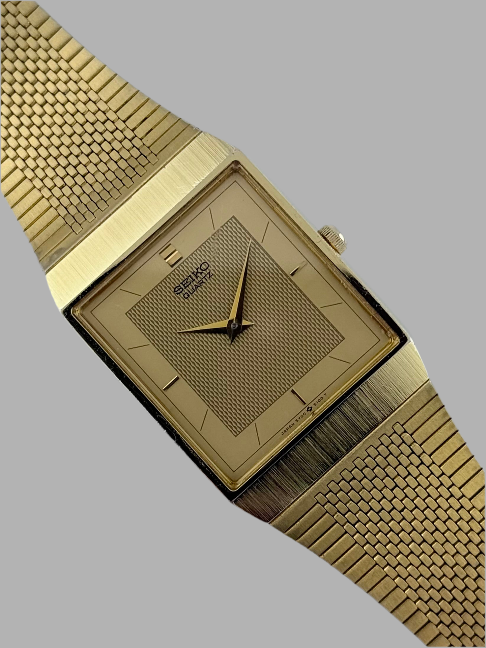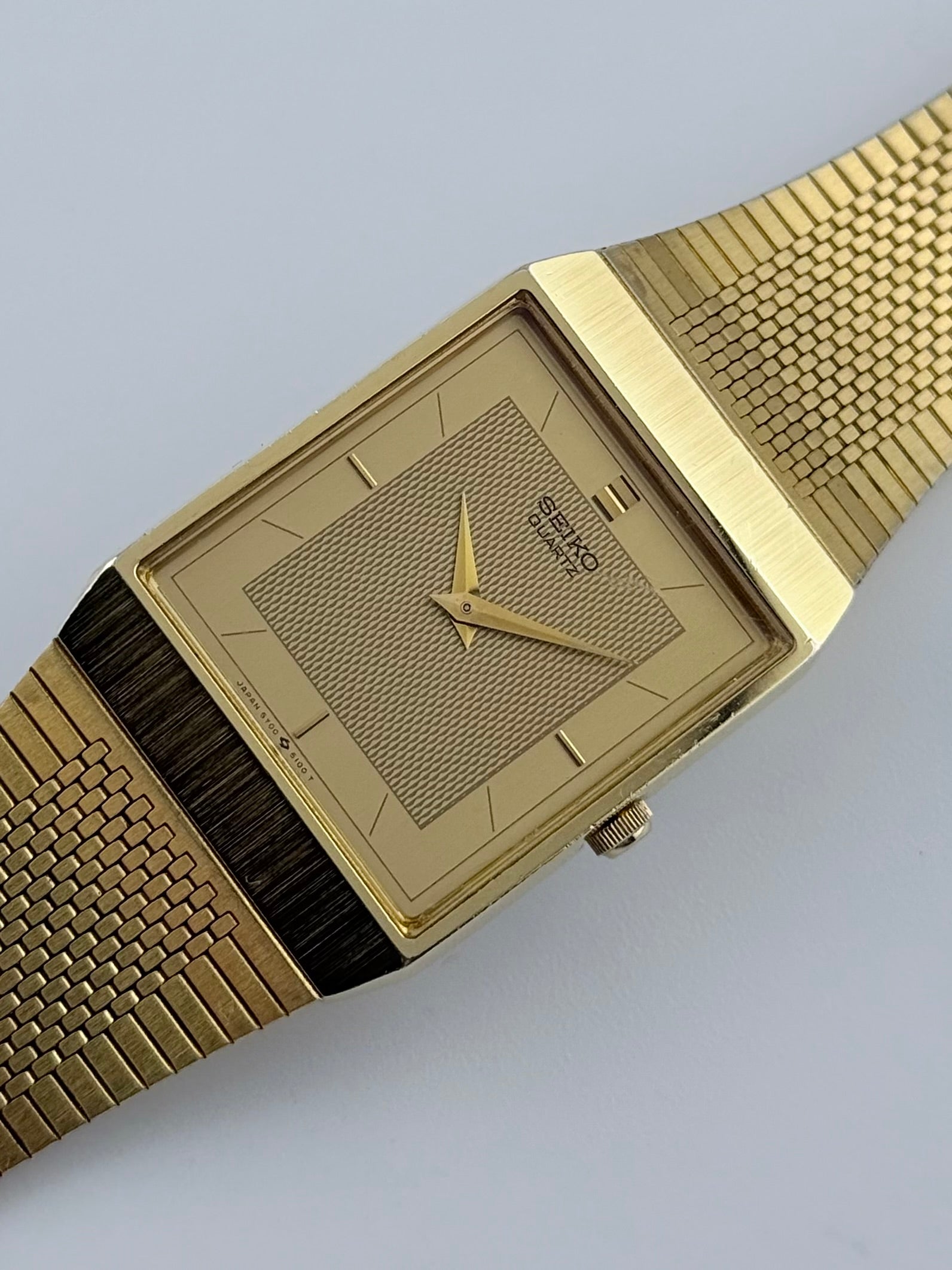 This lovely Seiko Tank with full gold colour profile is in great vintage condition, showing some wear, including a scratch on the crystal, but still looking absolutely amazing. The watch features a stunning two-tone dial with intricate design and pattern as well as its original bracelet. The watch works perfectly in all its functions. This piece would serve as a great dress piece for men!