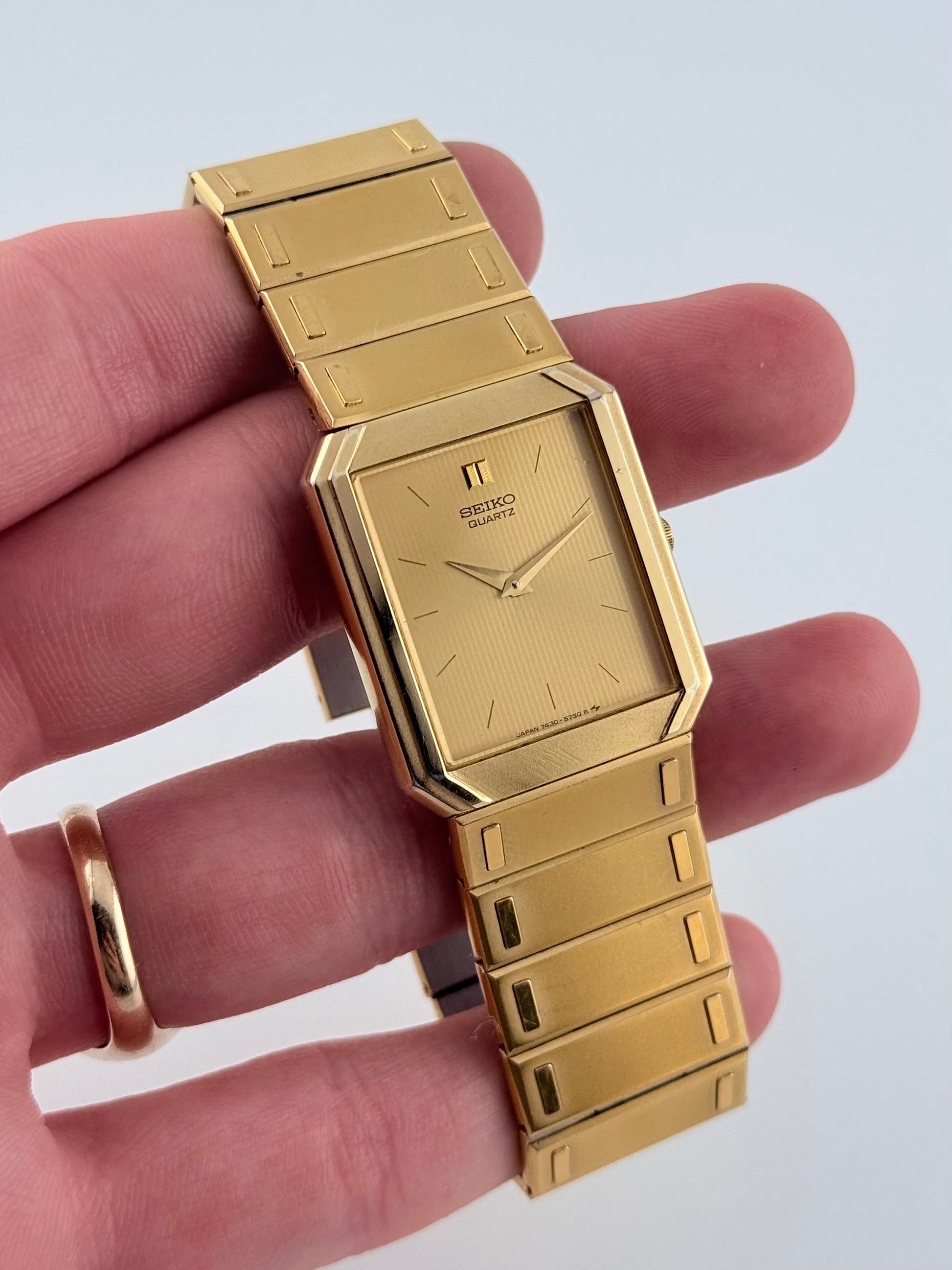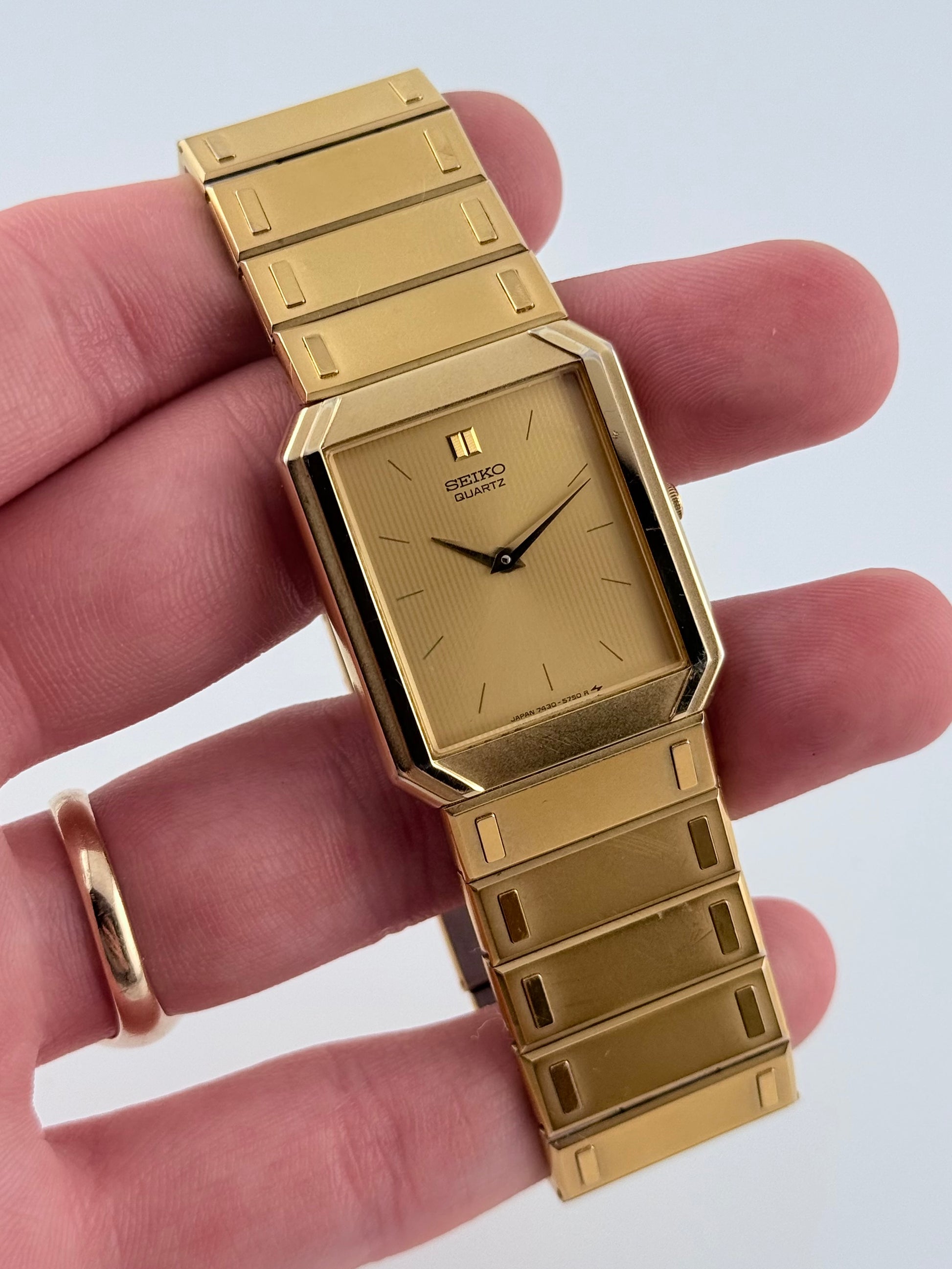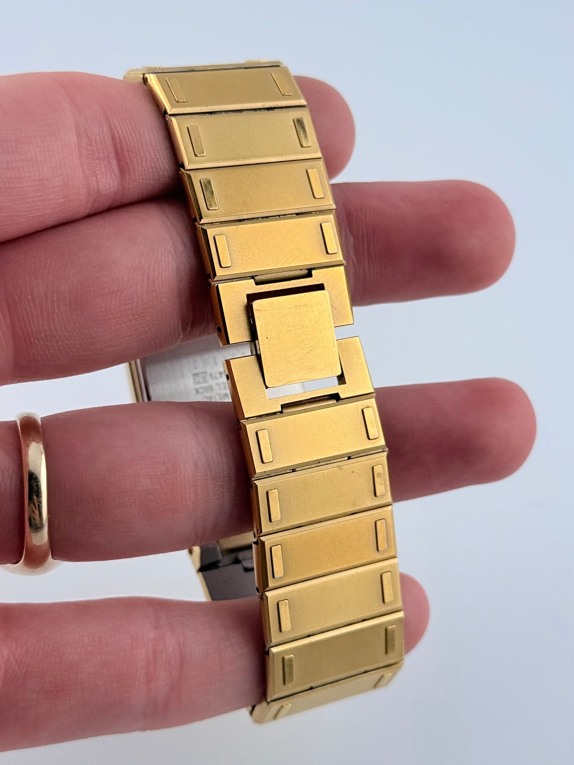 This is a stunning dress watch which features a gold coloured tank shaped case. The dial is champagne coloured with vertical lines which is mark free and is nicely complemented with Dauphine hands and a faceted baton marker at the top of the dial which gives the watch an imposing look. The watch is fitted with its original and quite unique bracelet which is in fantastic condition. A real find.