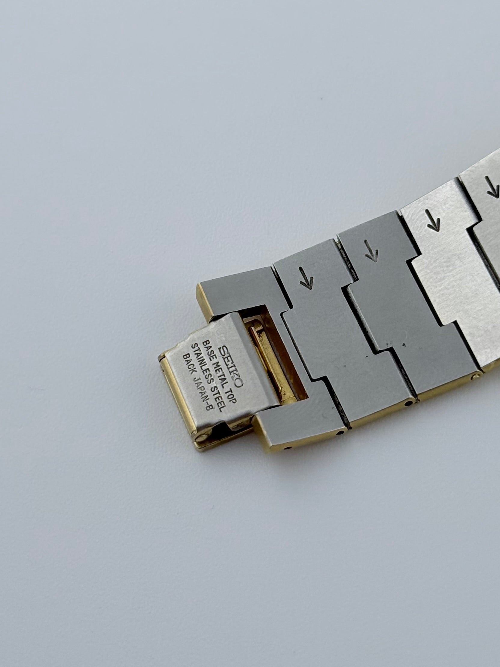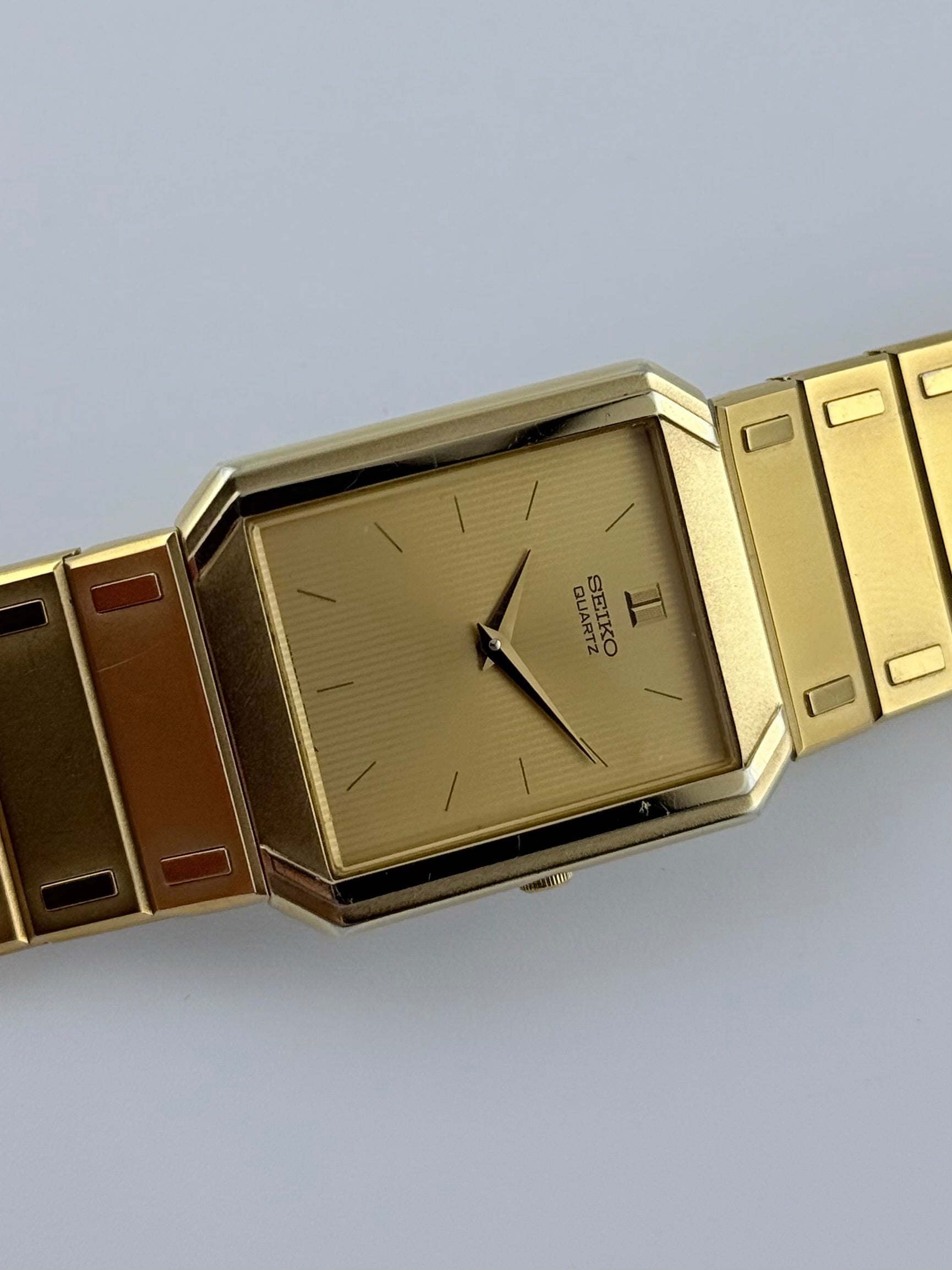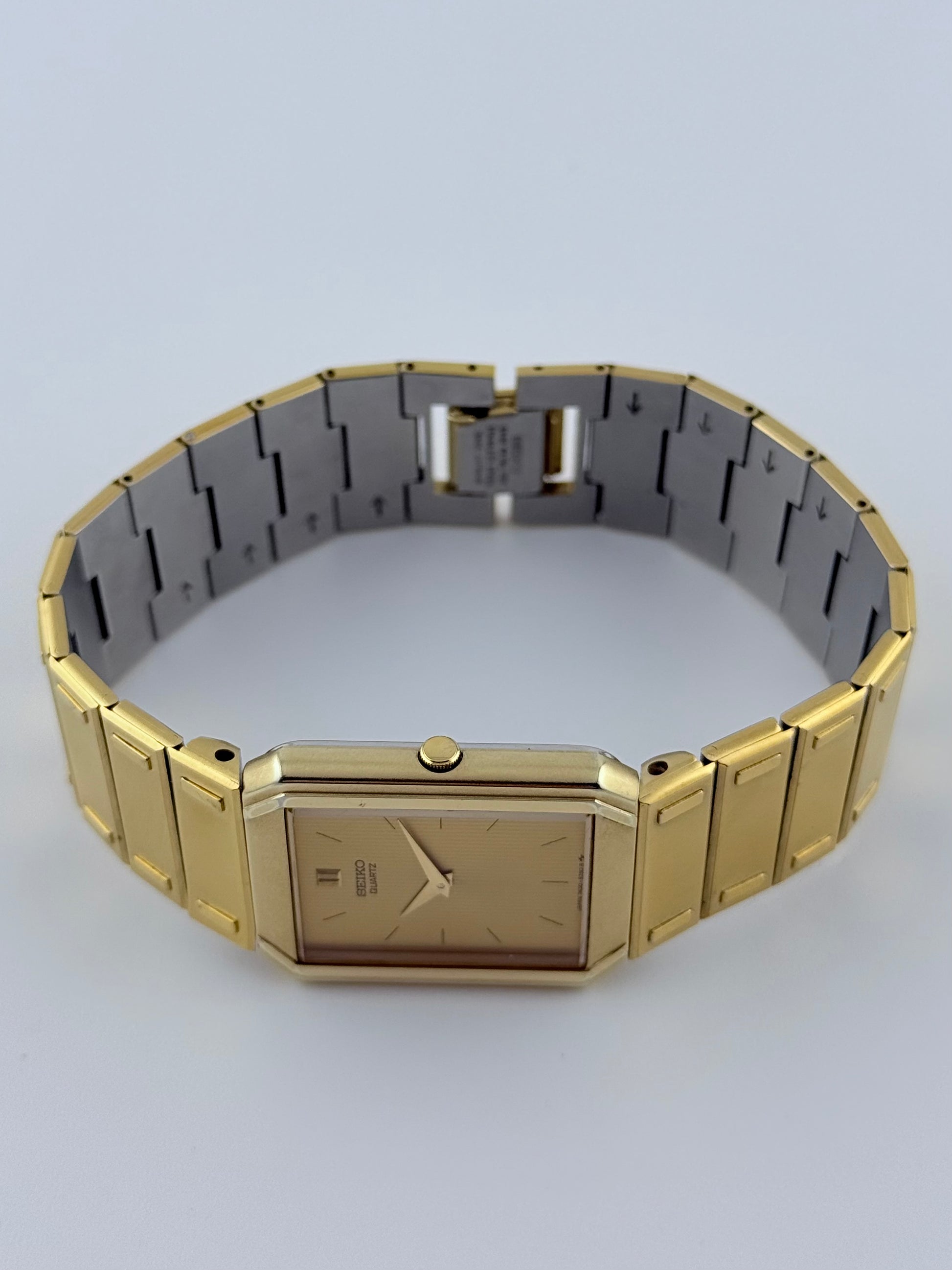 This is a stunning dress watch which features a gold coloured tank shaped case. The dial is champagne coloured with vertical lines which is mark free and is nicely complemented with Dauphine hands and a faceted baton marker at the top of the dial which gives the watch an imposing look. The watch is fitted with its original and quite unique bracelet which is in fantastic condition. A real find.