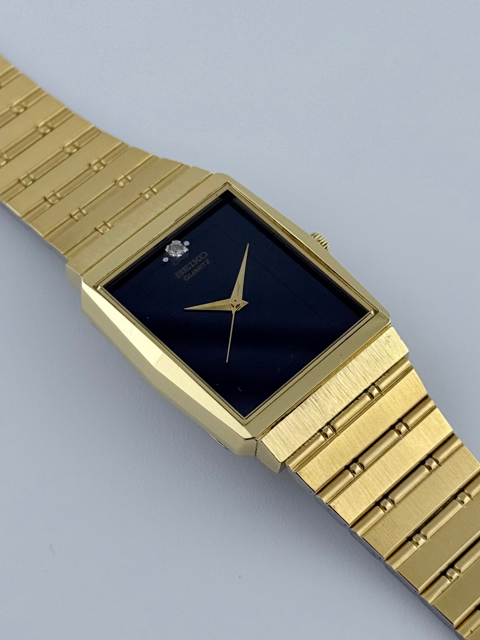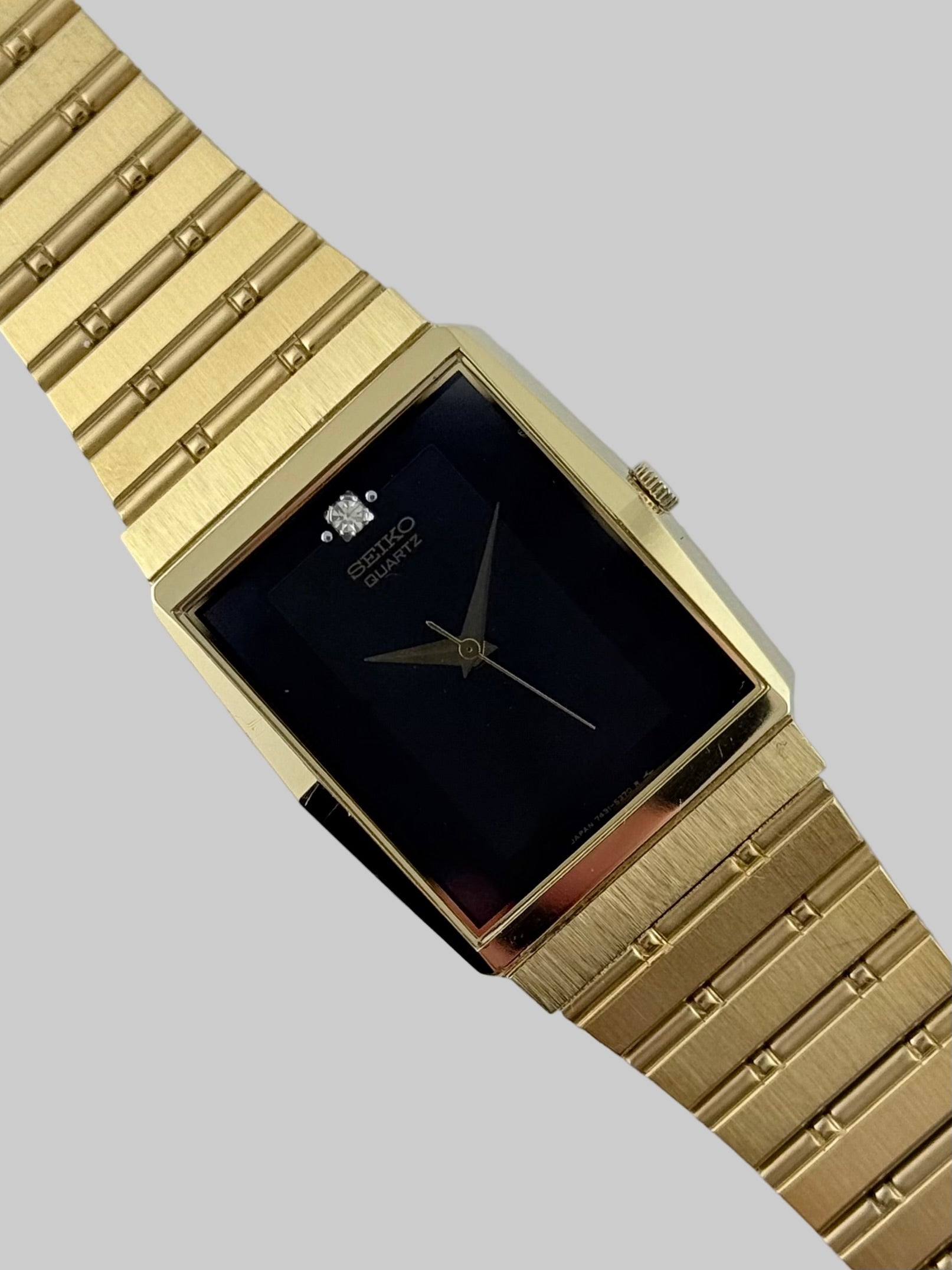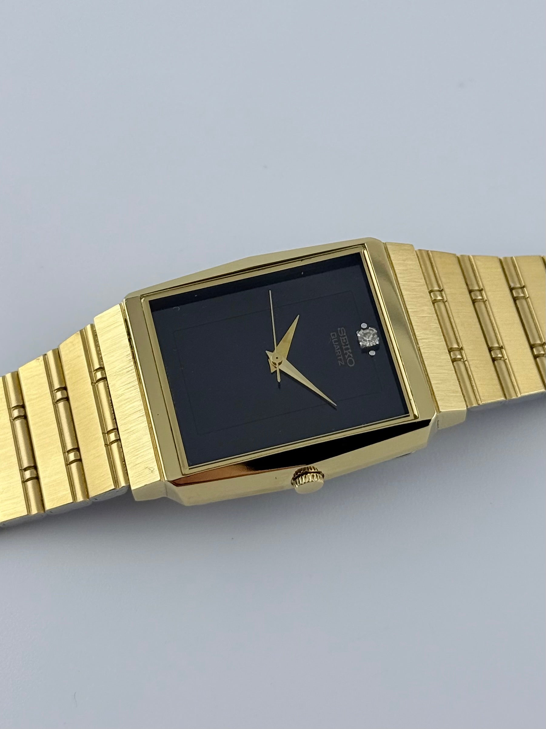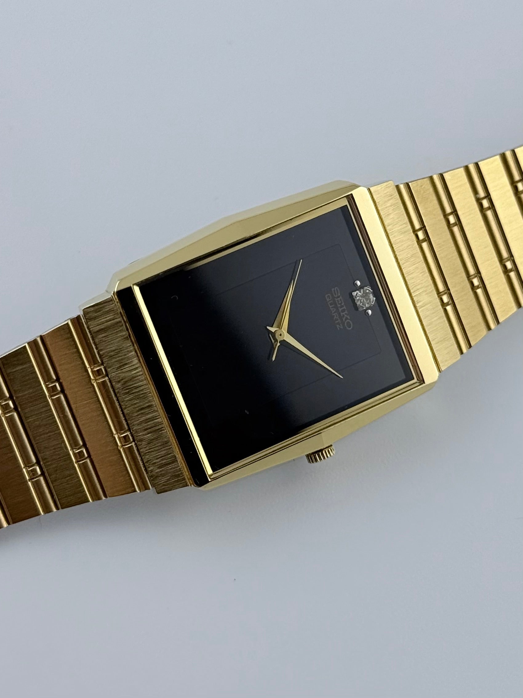 This incredible dress watch is in fantastic condition for its age. The beautiful combination of a gold coloured case with a two tone black dial and a diamond effect stone at the 12 position along with the gold coloured dauphine hands really gives this watch some presence. It functions well and keeps great time. The Crystal has a few minor marks whilst the bracelet is still in excellent condition.