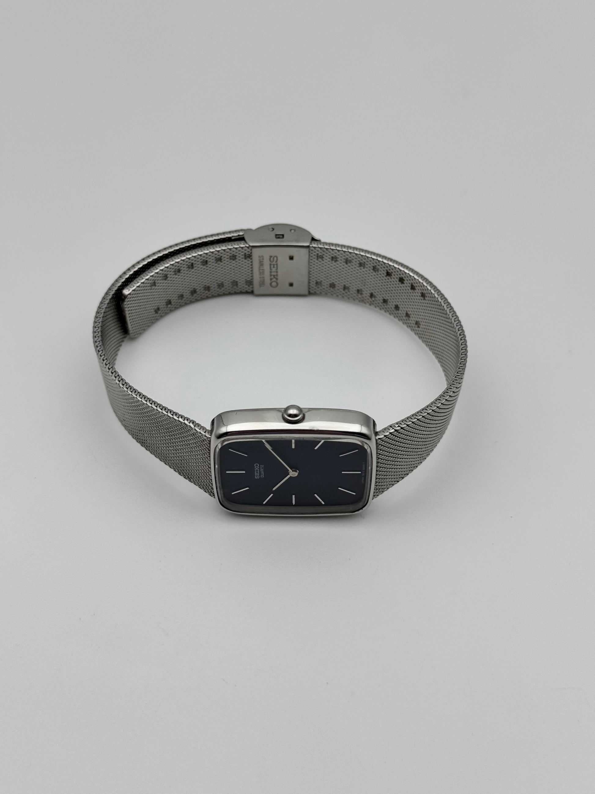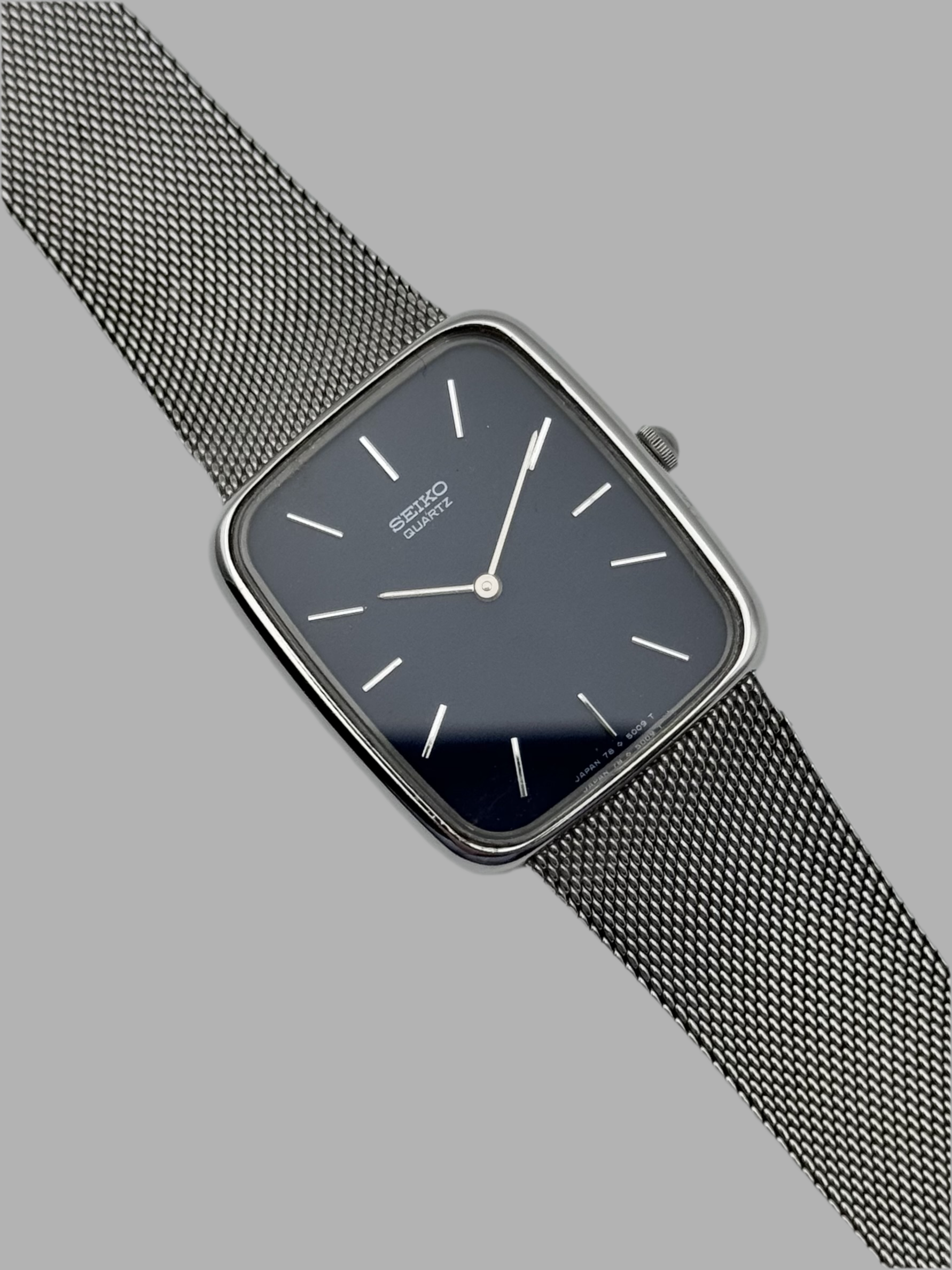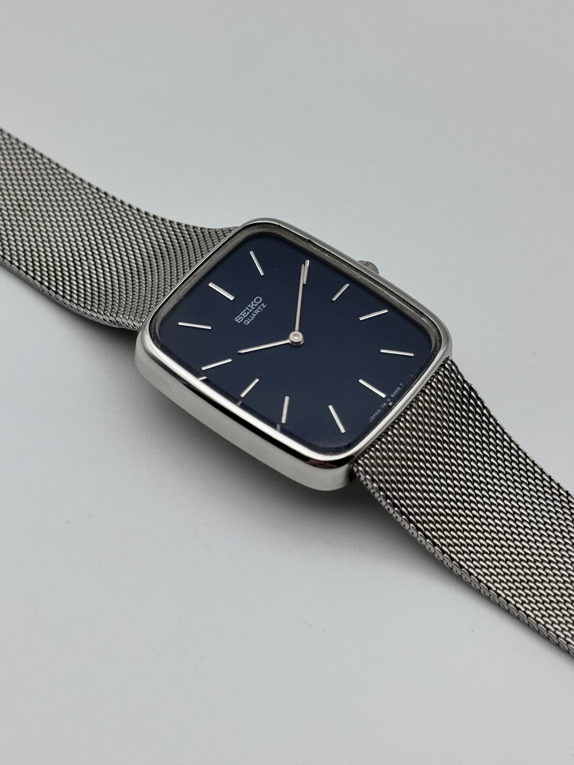 This is a lovely vintage Seiko tank. The watch is in great condition and keeping good time. This piece features a stunning blue dial and its original integrated bracelet.