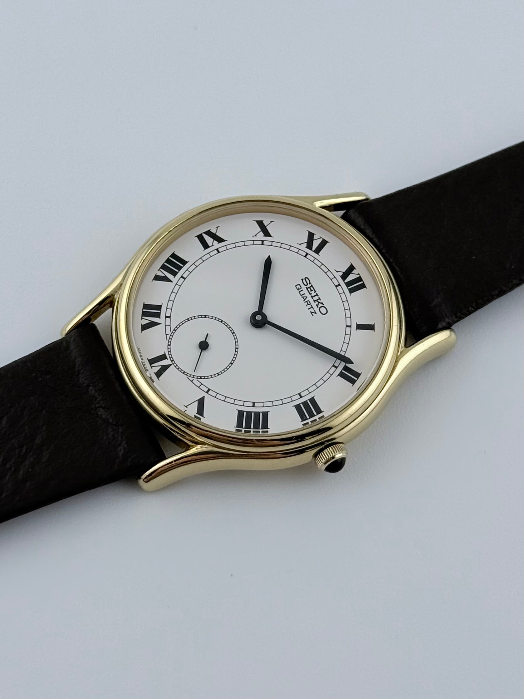 This is superb vintage Seiko features a white Roman Numeral dial with a sub seconds. The dial is in mint condition and the case is showing just very minor wear. The Cabochon crown really suits the aesthetics of this watch. It is fully functional and keeping time.