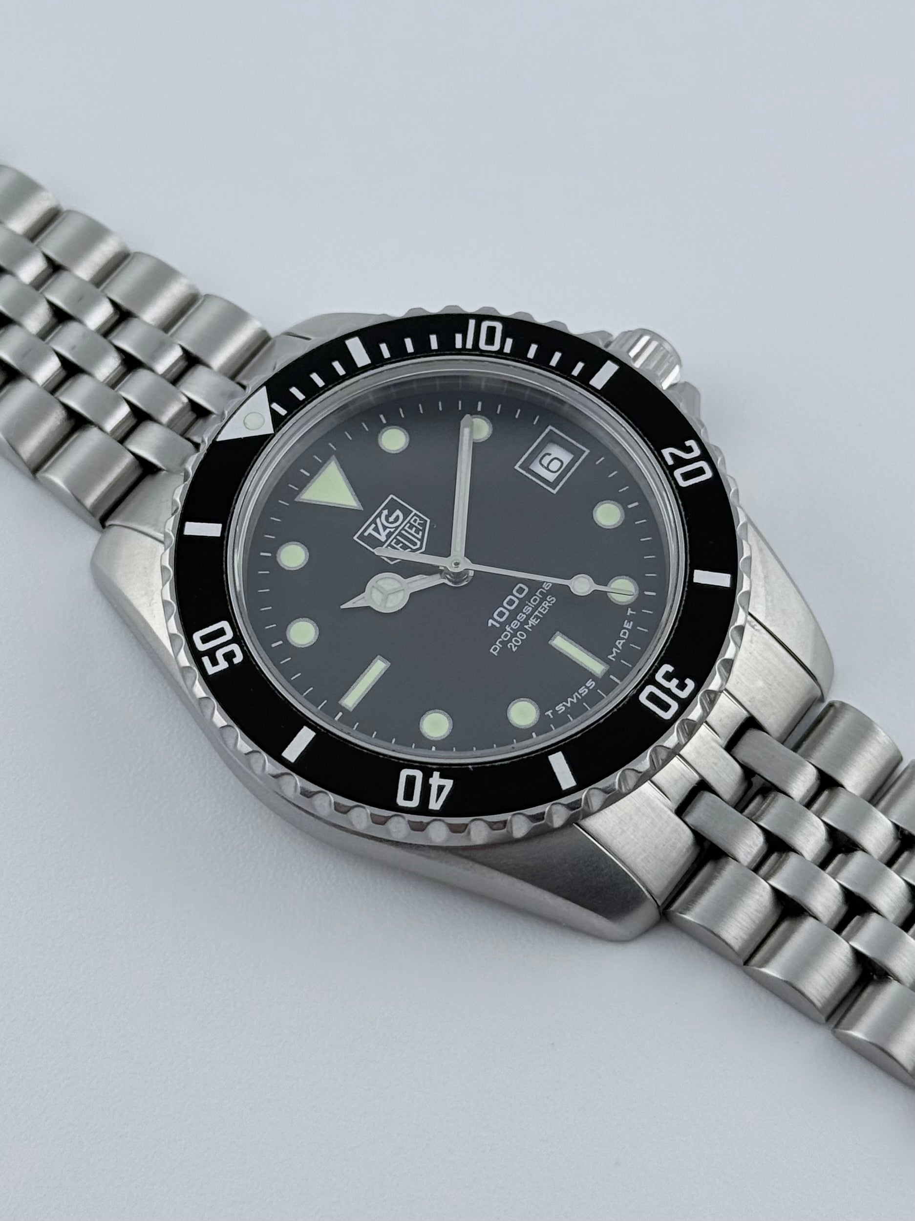We have for sale this fabulous and affordable vintage Tag Heuer Professional 1000 from the mid-1980s. The watch features a desirable black dial set in a stainless steel case and bracelet which are all original and in excellent condition for its age, showing only very mild and general signs of wear. Mechanically, the watch is working perfectly in all its functions.