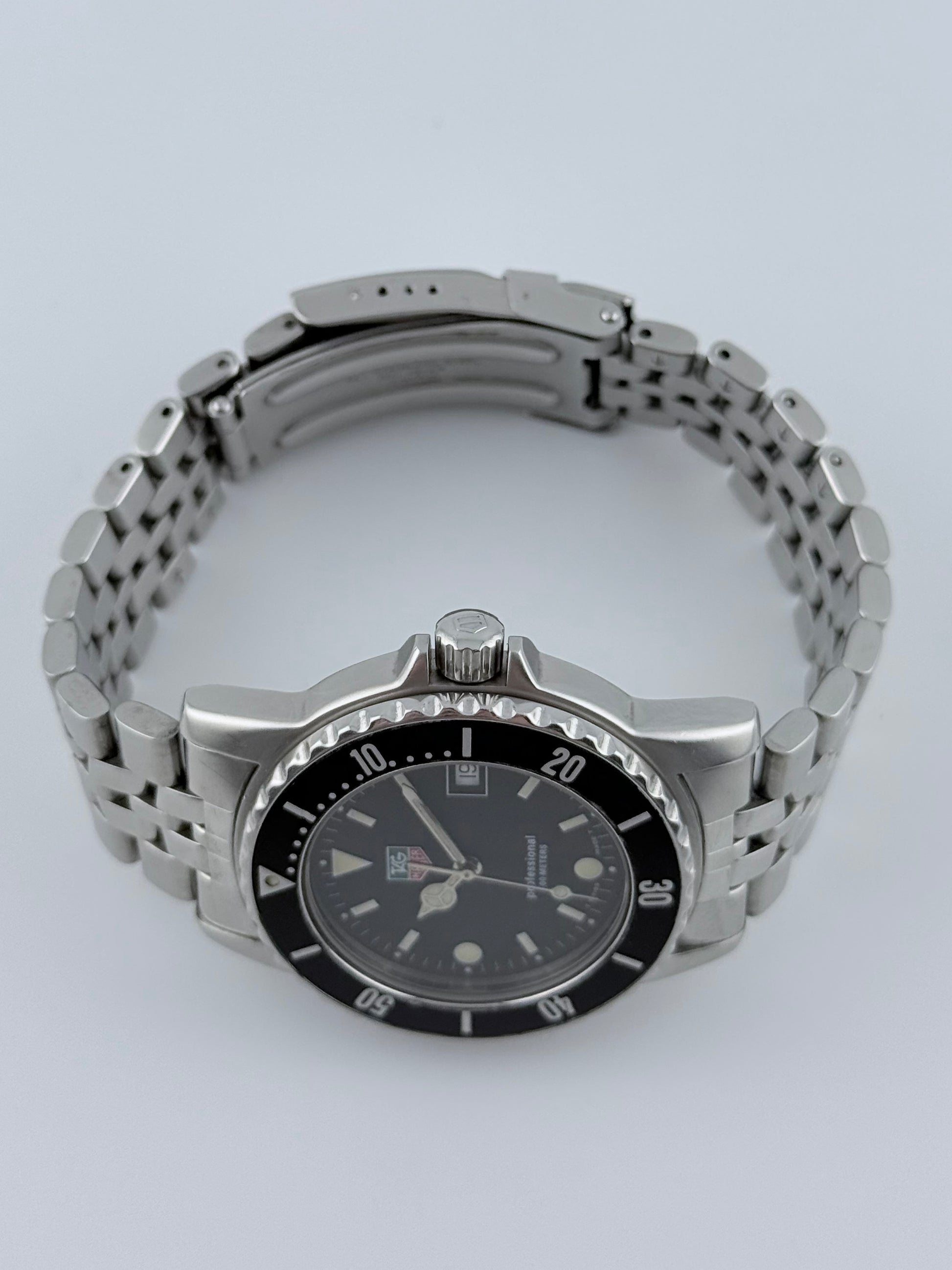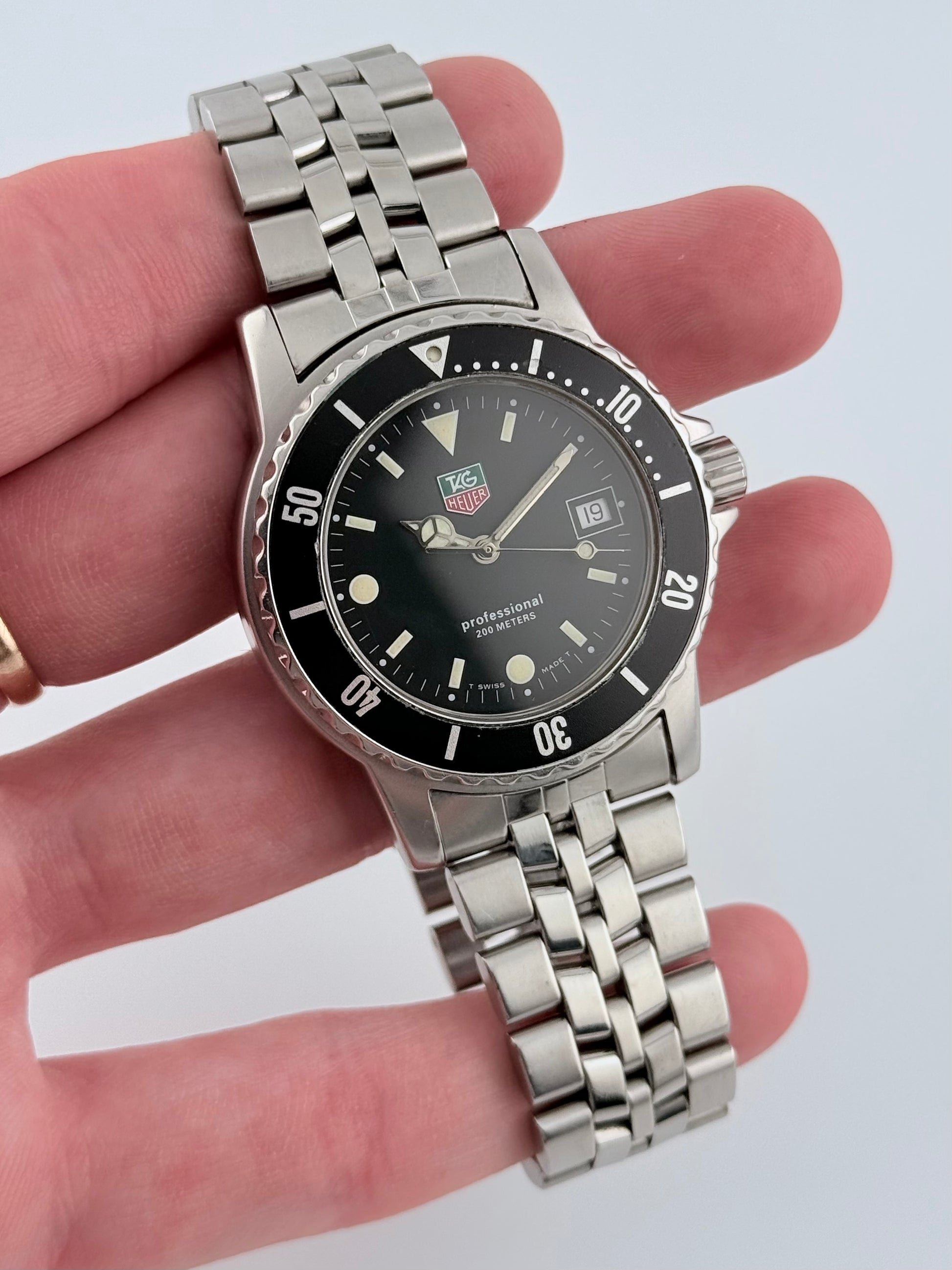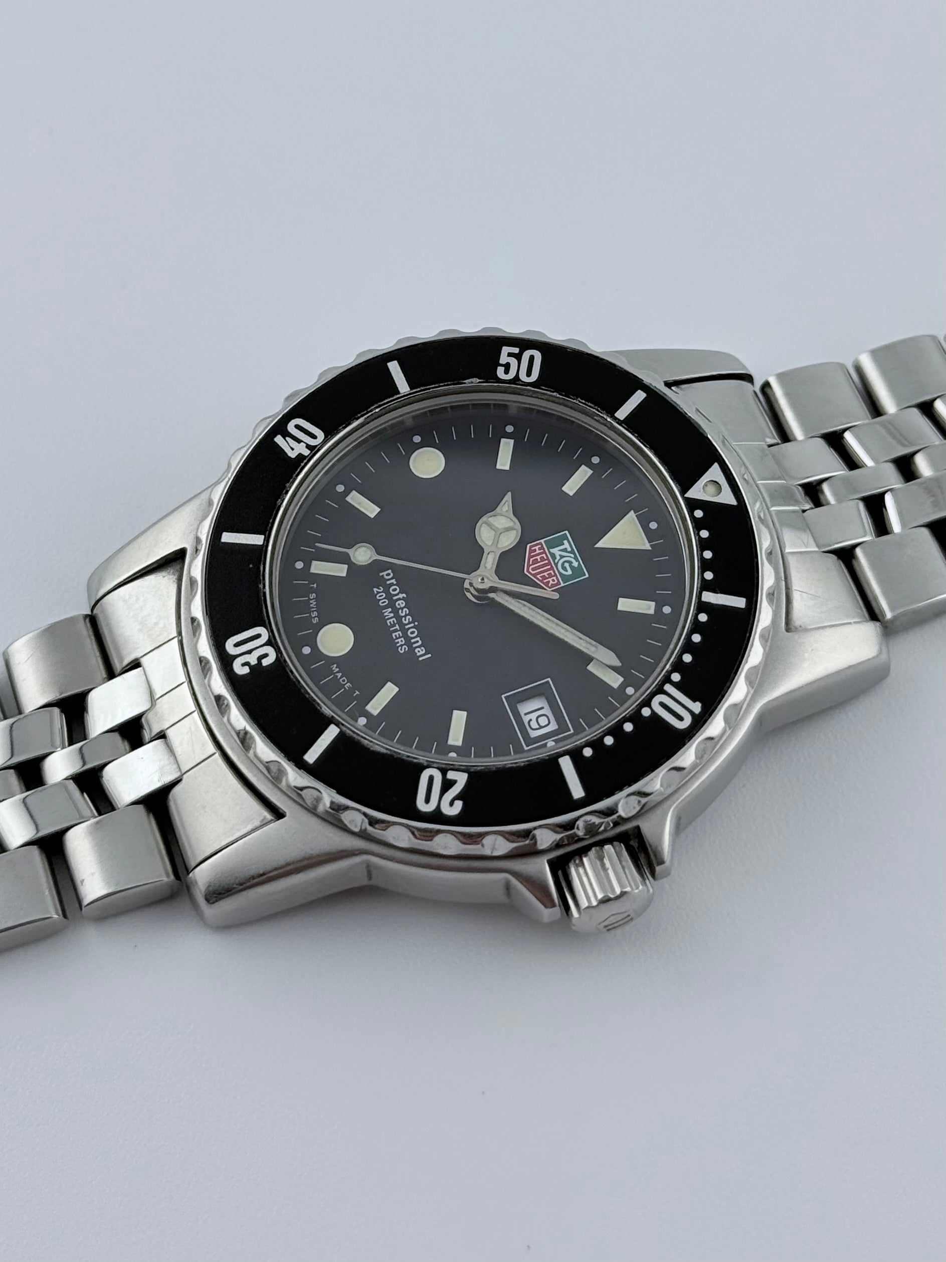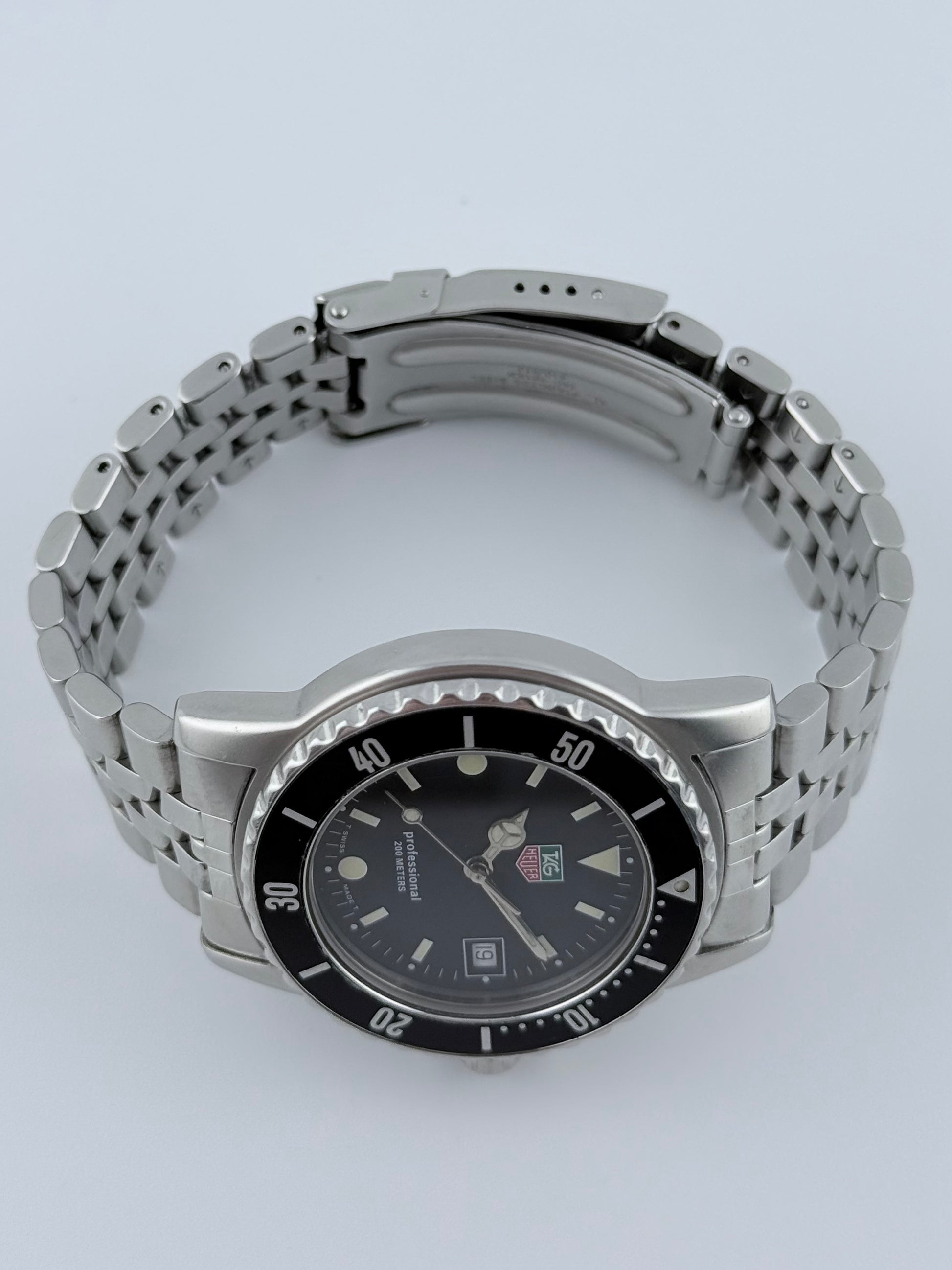 We have for sale this lovely and affordable vintage Tag Heuer Professional 200 from the 90s. The watch is in very nice condition for its age and shows some signs of wear and age. It features a crisp matt black dial in a stainless steel case with a black and white bezel. It comes on its original, also stainless steel Tag Heuer bracelet, which is in great condition, only showing light and common signs of wear. Mechanically, the watch is in excellent condition, working as it should, keeping good time.