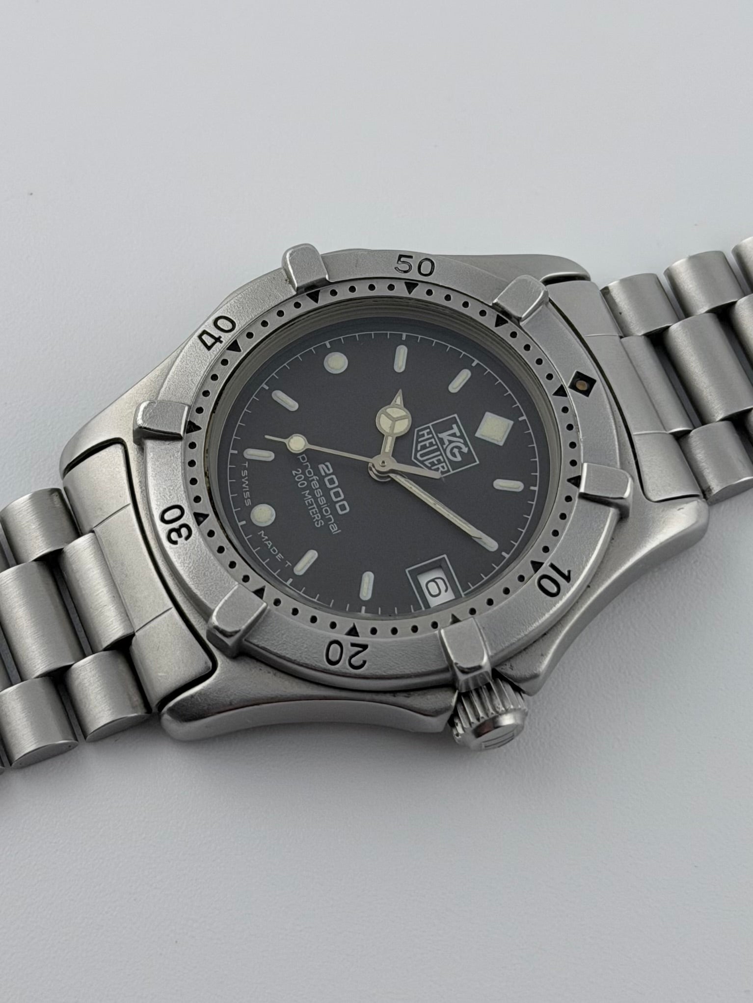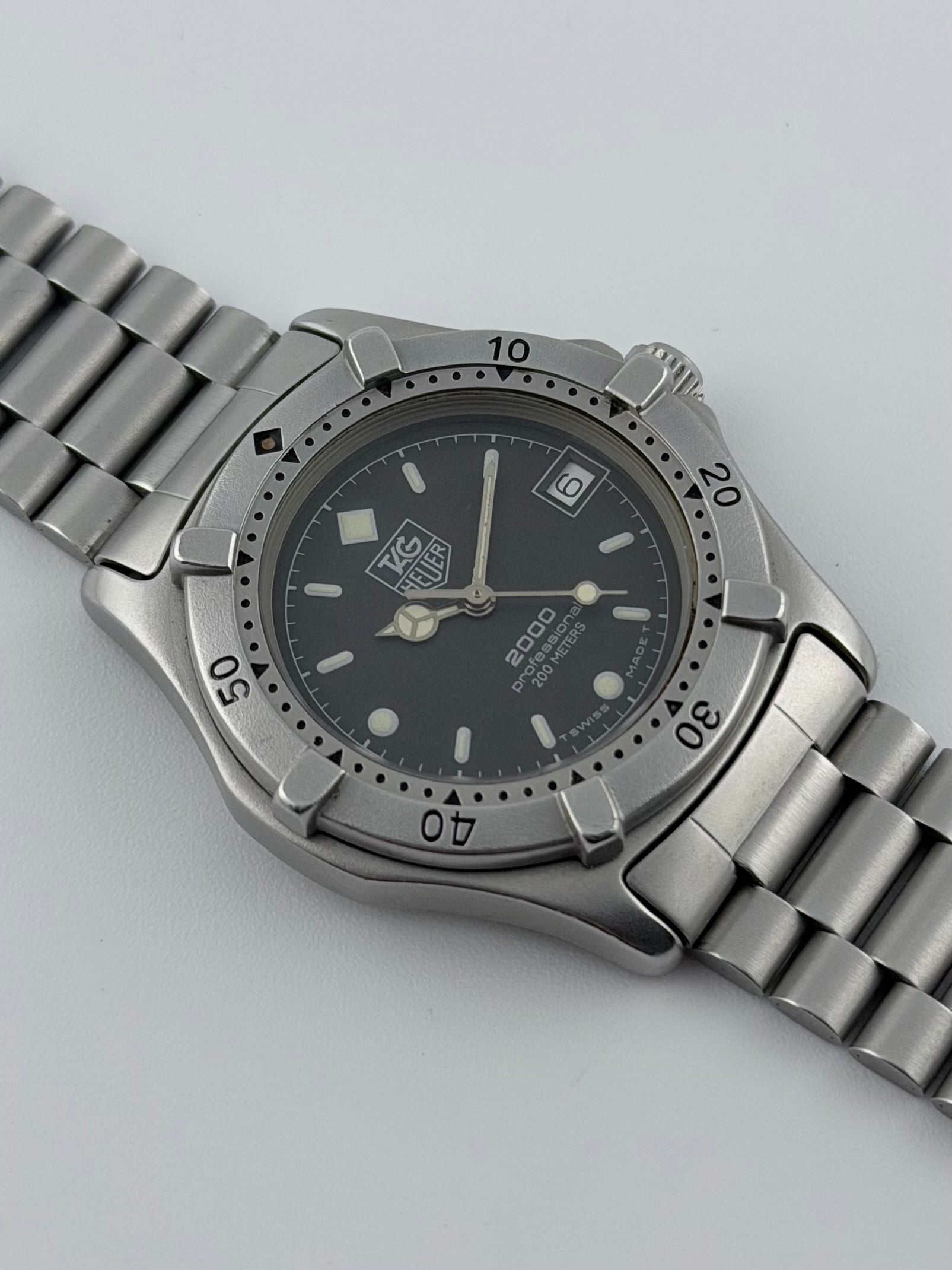 We have for sale this lovely and affordable vintage Tag Heuer Professional 2000 from 1990 featuring a matt black dial encased in a stainless steel case with a matching colour bezel and original Tag Heuer bracelet along with the box, guarantee and information booklet, all of which is in near to new old stock condition. The case is virtually untouched and the watch is working perfectly and keeping excellent time.