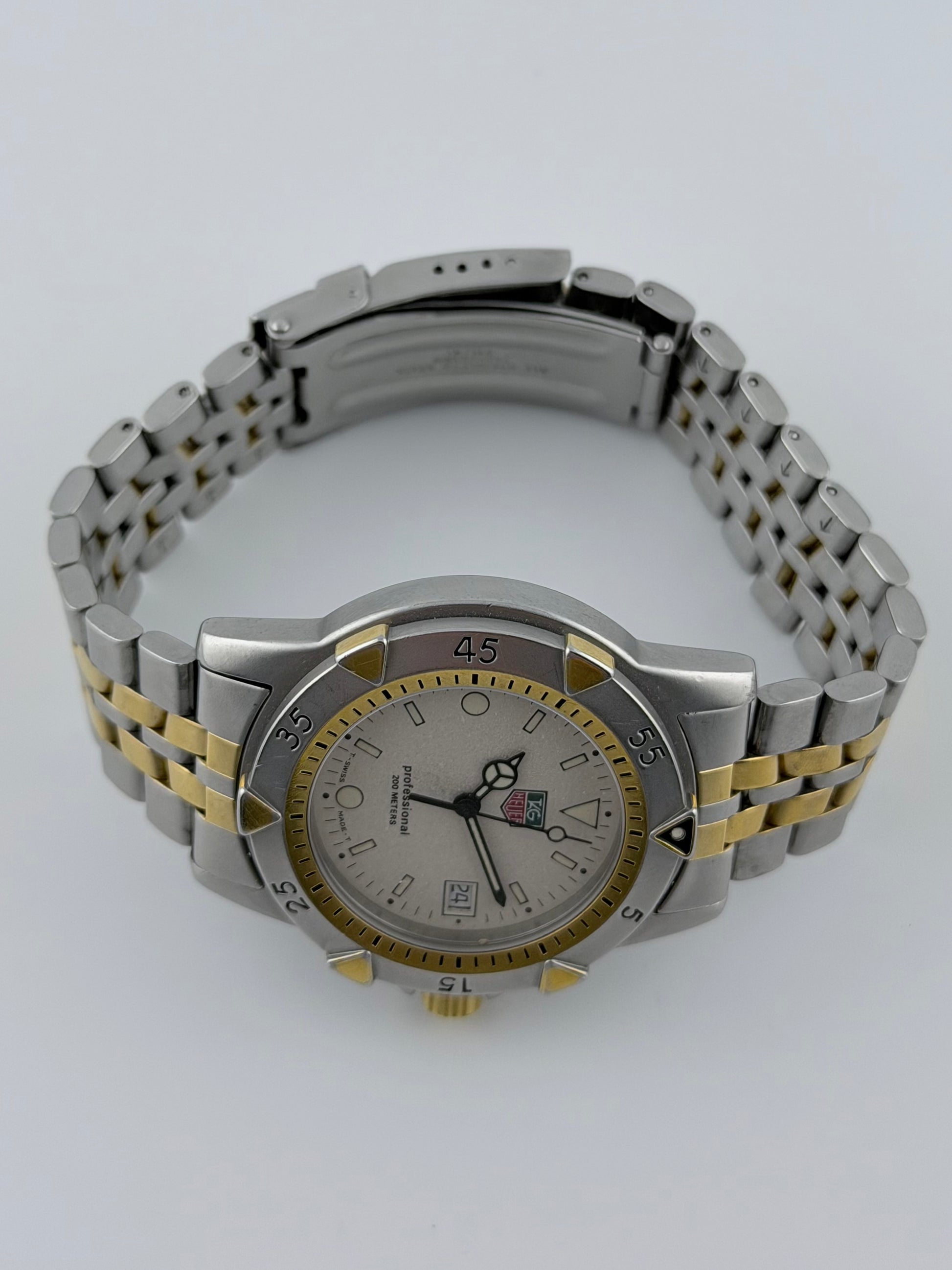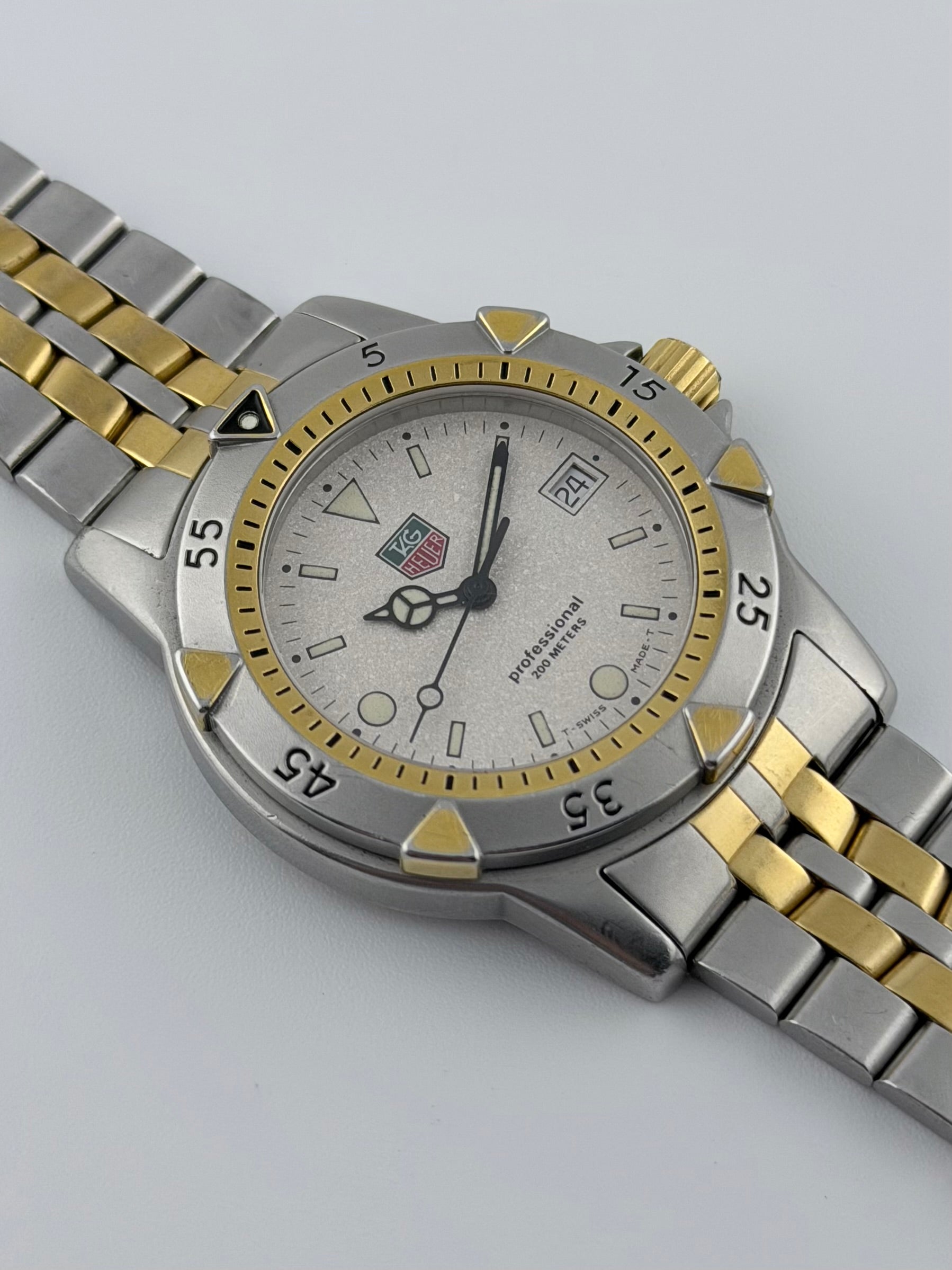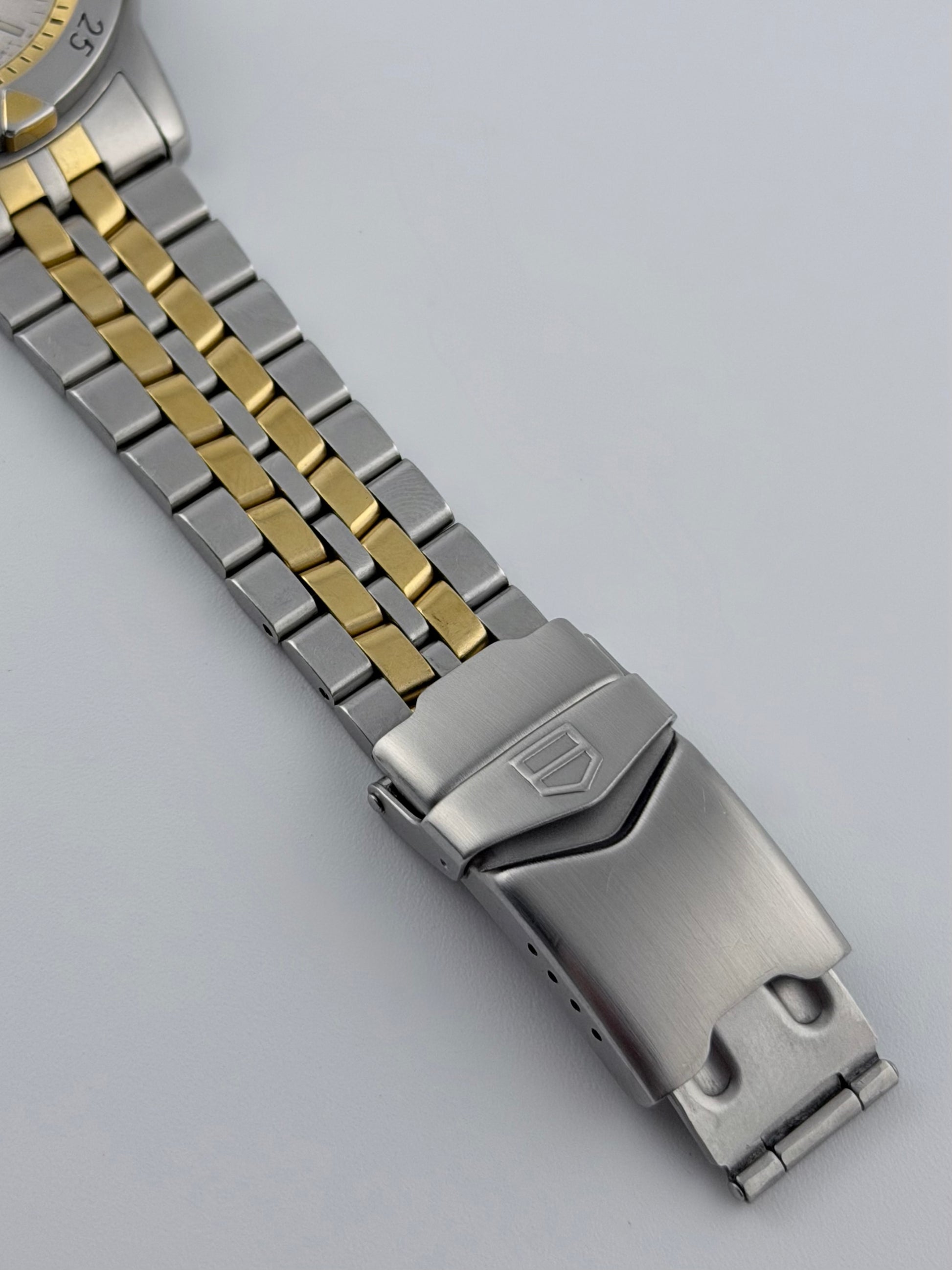 This is a fantastic and affordable vintage Tag Heuer Professional 200 from the 90s featuring a cool silver colour sparkly granite-effect dial with a date complication framed with a two-tone bezel combining mat finish stainless steel with 18ct gold plating. This watch comes with its original and matching in materials and style stainless steel watch with gold plating running through the middle. Mechanically, the watch is working well, keeping excellent time.
