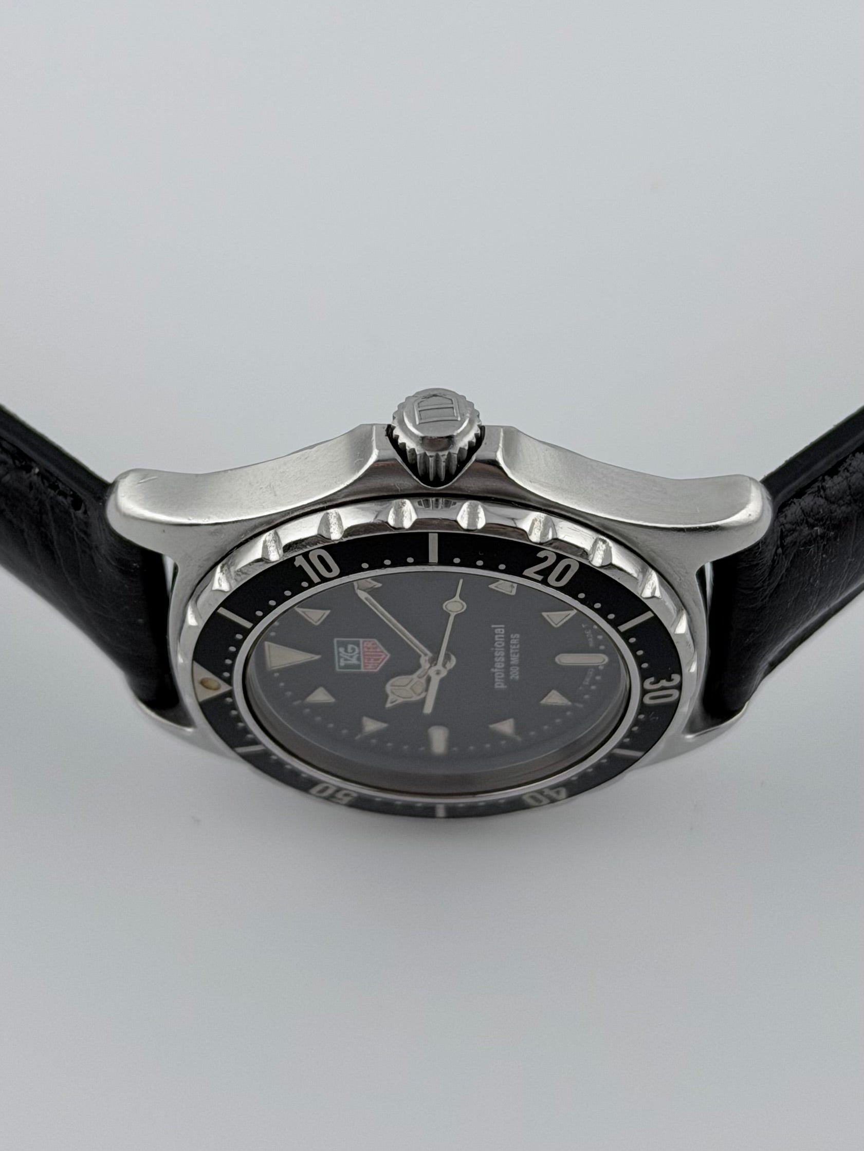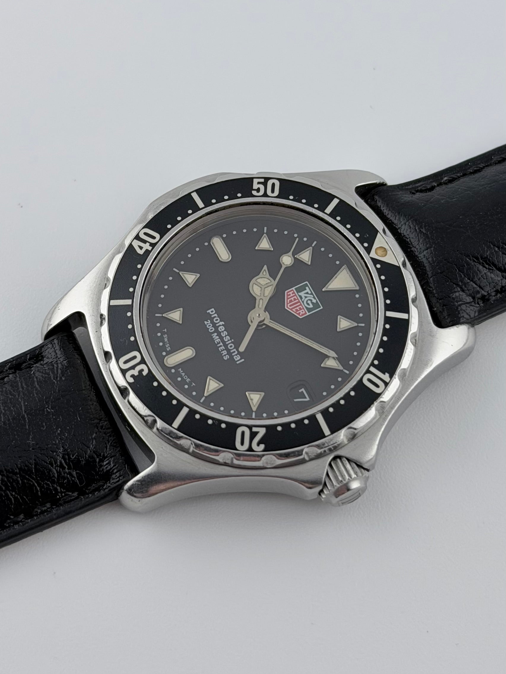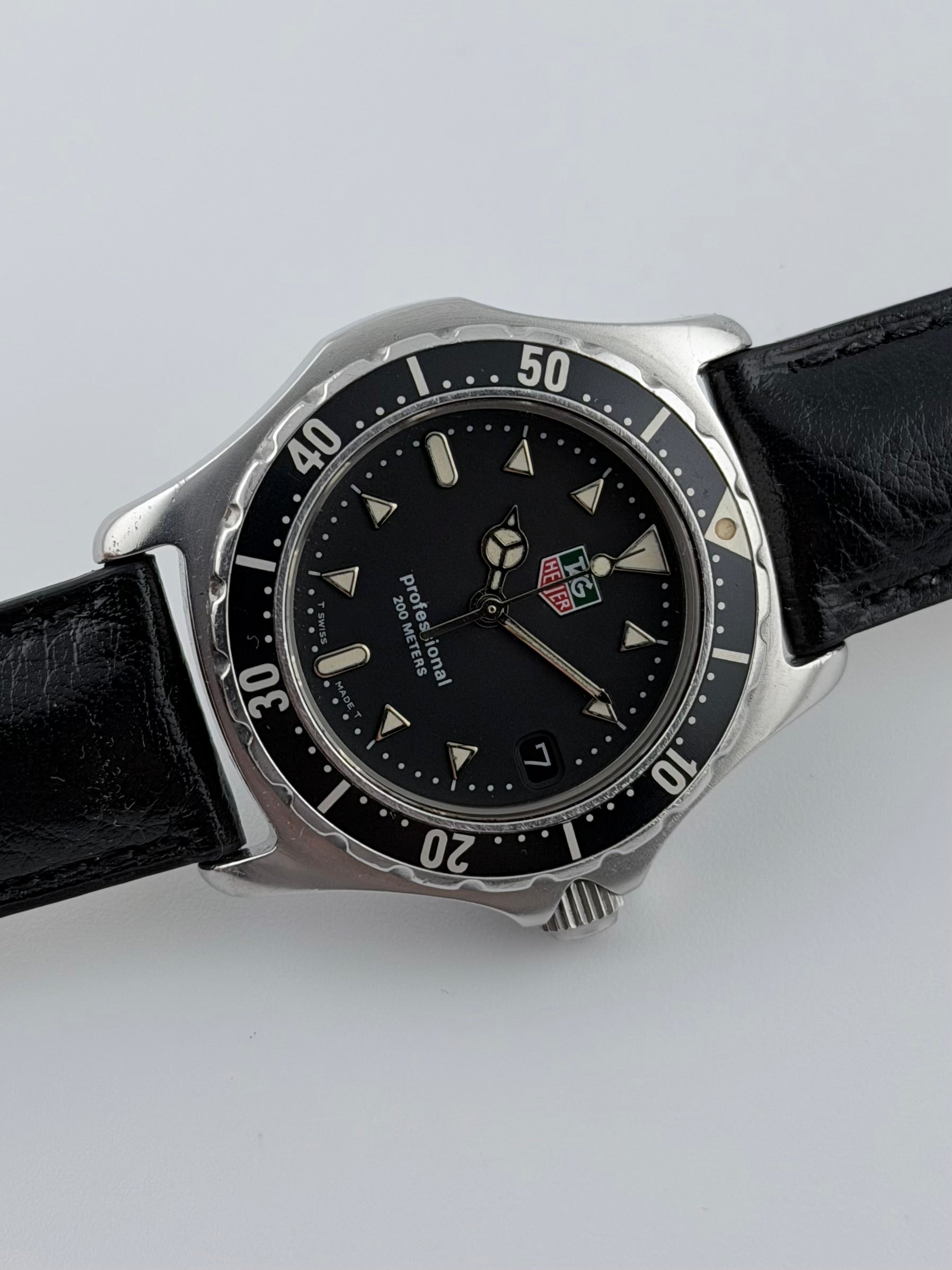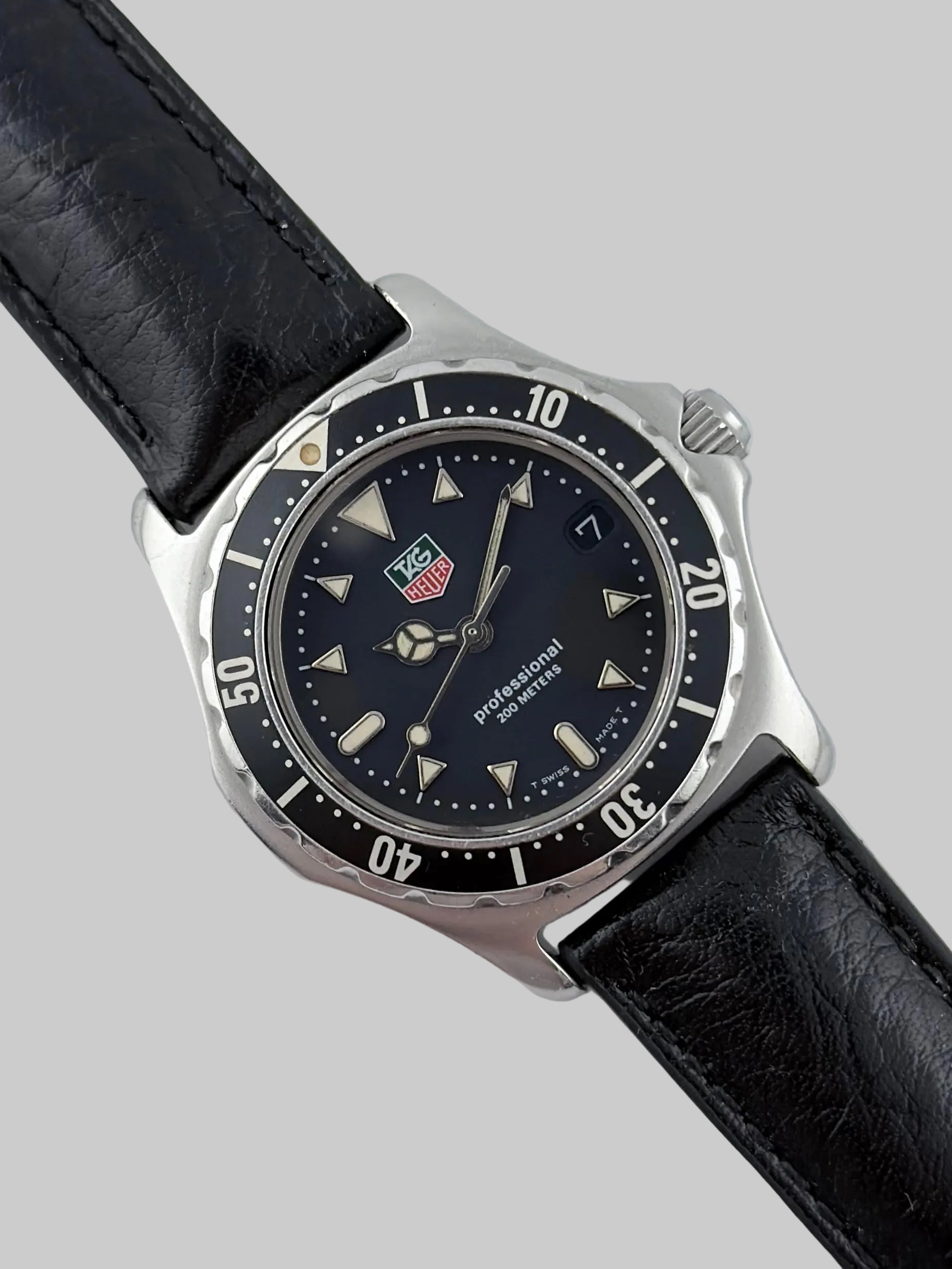 This is a fantastic and affordable vintage Tag Heuer Professional 200 from the 90s featuring a cool black sunburst dial with a date complication. This stainless steel watch with its original bracelet is in very nice condition for its age and only shows general signs of wear. Mechanically, the watch is working perfectly, keeping excellent time.