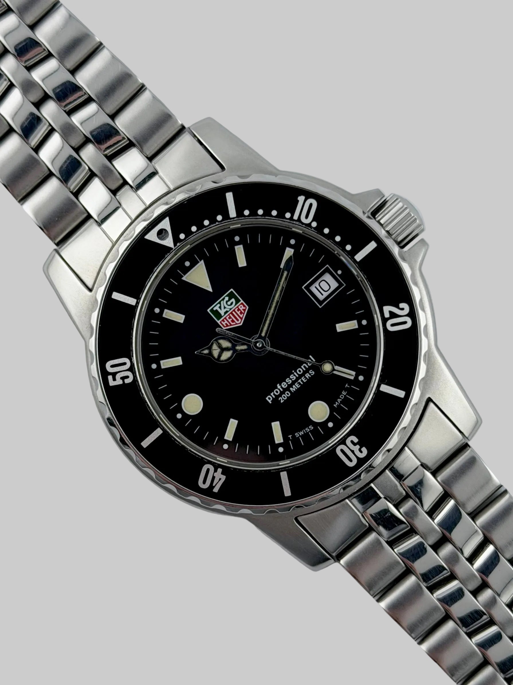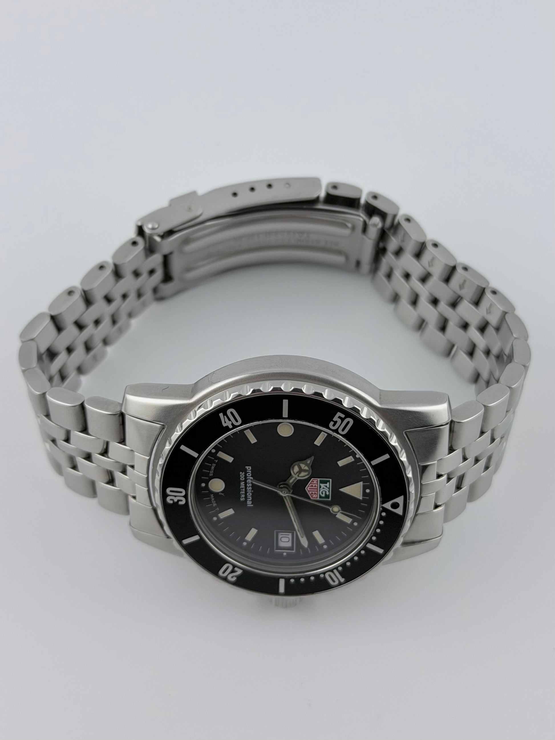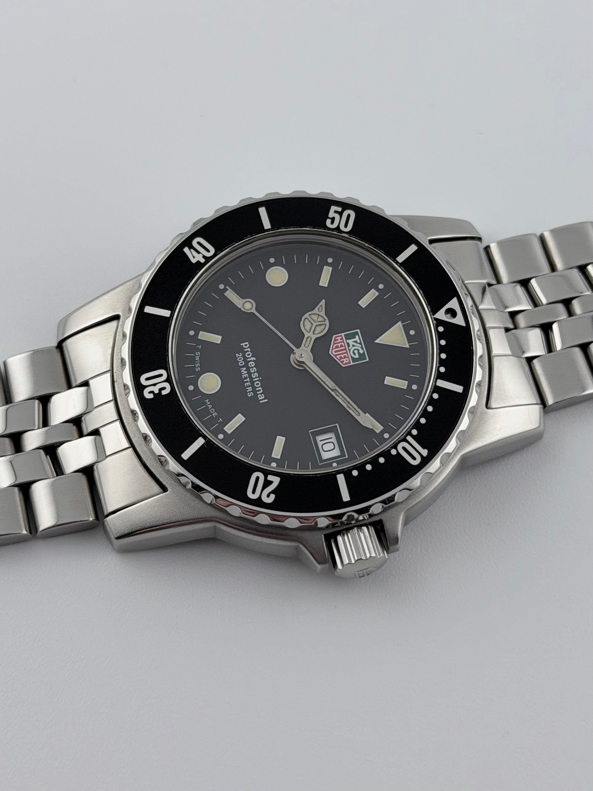 The condition of this Tag is probably as good as it gets, as close to near new old stock as you are likely to find. This Tag Heuer Professional 200 from the 90s features a matt black dial with a date complication. Everything is in near perfect condition from the luminous baton markers, bezel, case and bracelet. It looks as if it could just have come out of its presentation box. Mechanically, the watch is working perfectly, keeping excellent time.