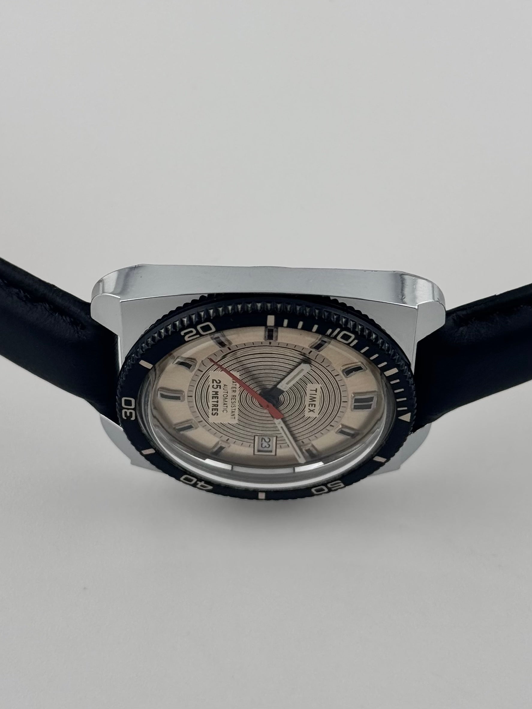 Something a little different, a Timex Dive watch which has quite a fetching and distinctive dial, a perfect budget watch. The watch features a bi directional, friction-fit, plastic elapsed time bezel. The centre of the dial has a distinctive circular pattern surrounded by embossed and printed markers all within a chrome plated case which remains in superb condition. The watch is fully functional and keeping good time.