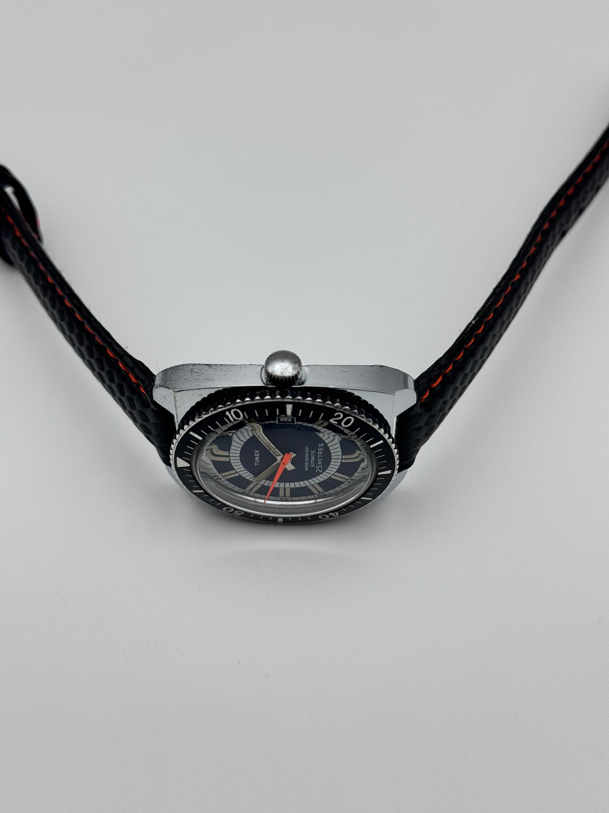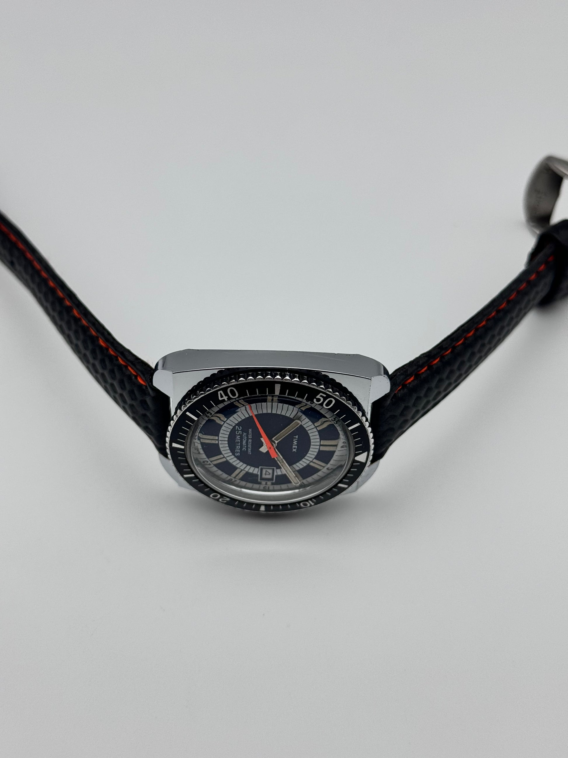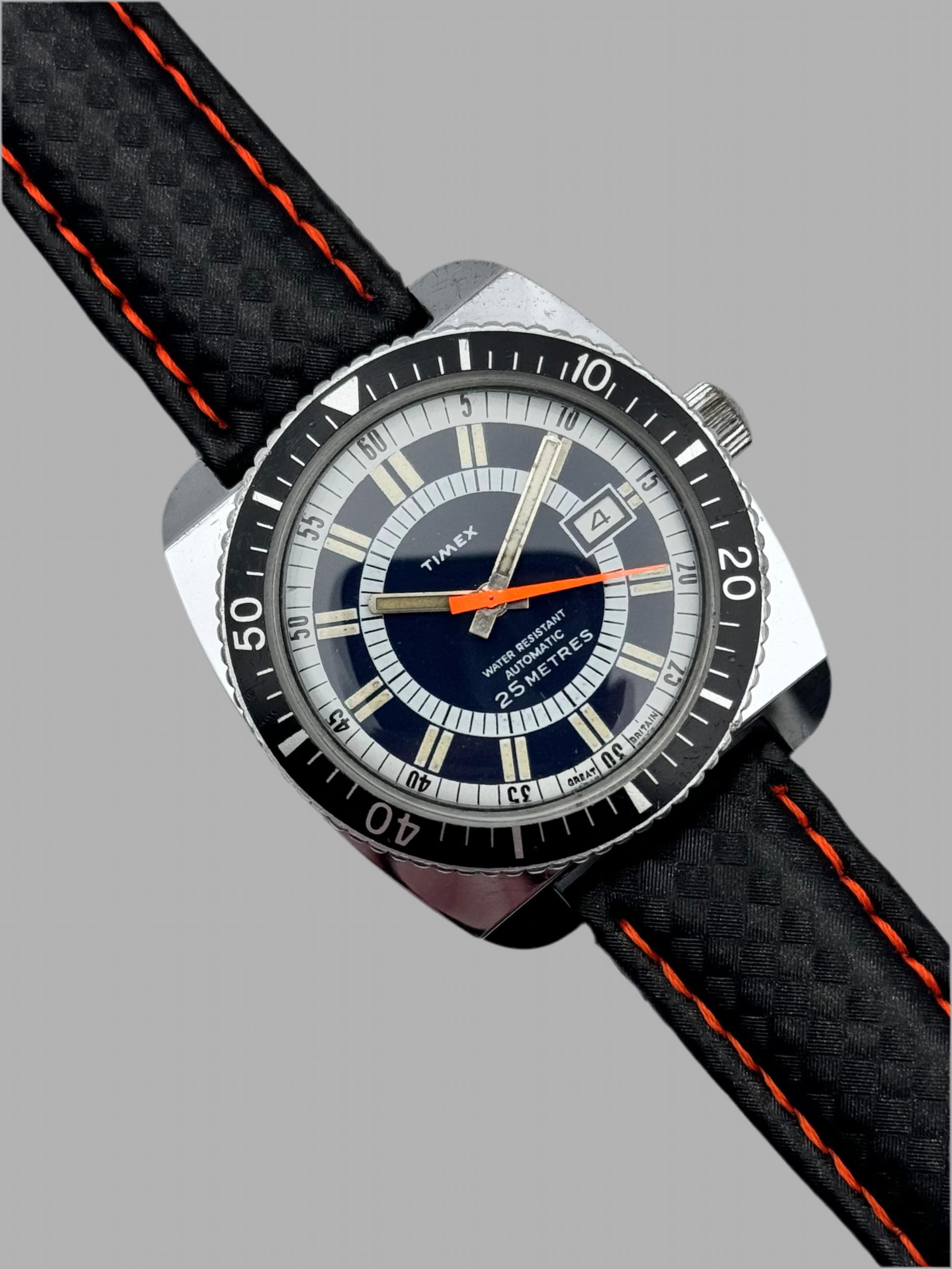Something a little different, a Timex Dive watch which has quite a fetching and distinctive dial, a perfect budget watch. The case and bezel are showing modest wear as you would expect with any vintage watch, but nothing to detract from a watch that is still in excellent condition and comes with the added bonus of its original box. The watch is fully functional and keeping good time.