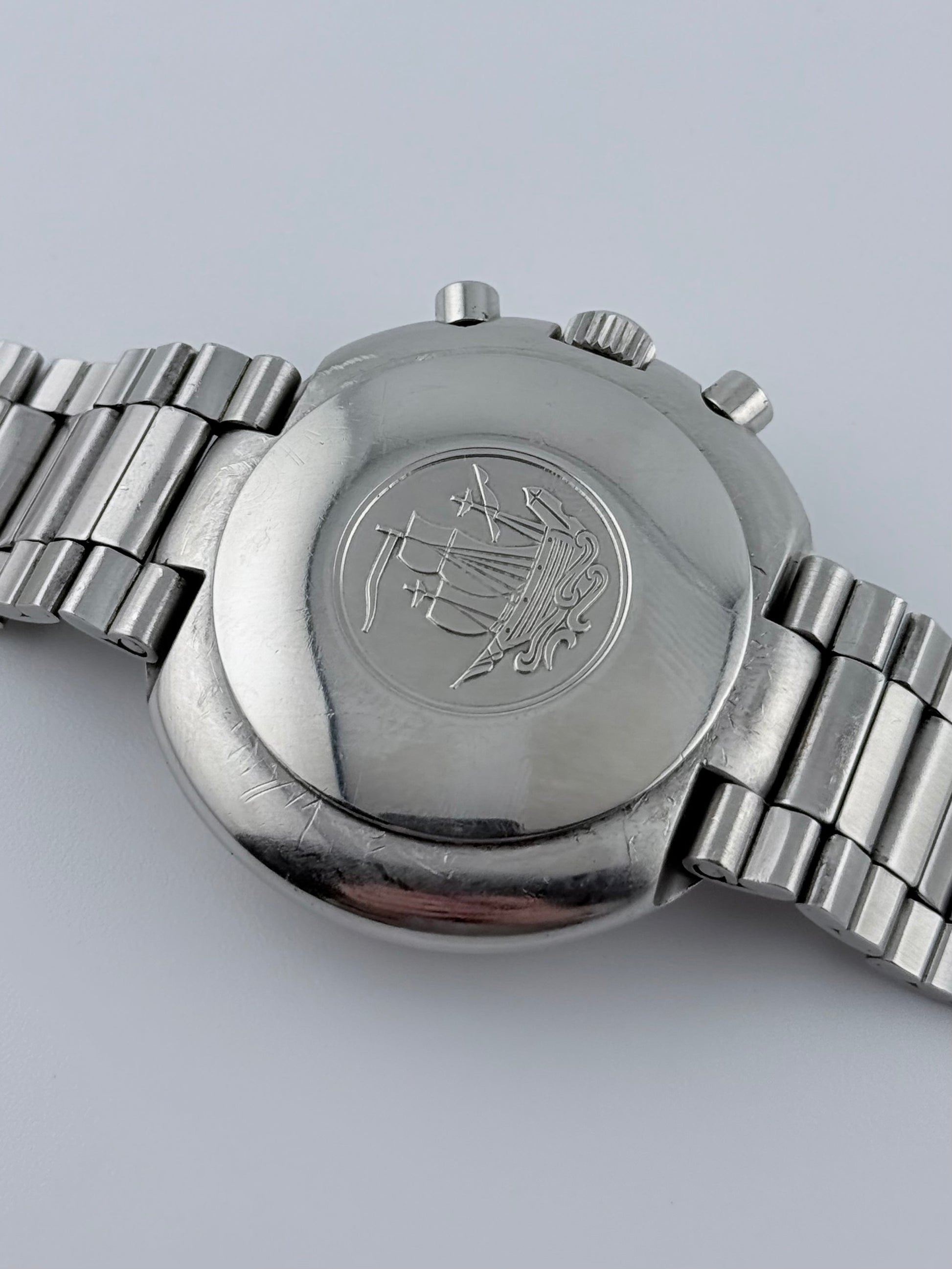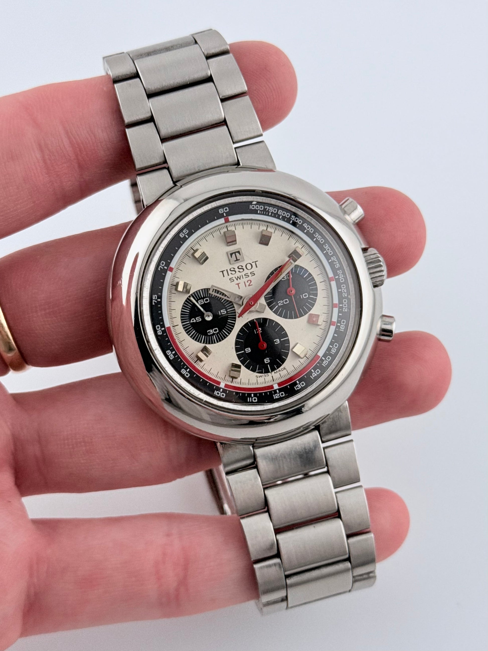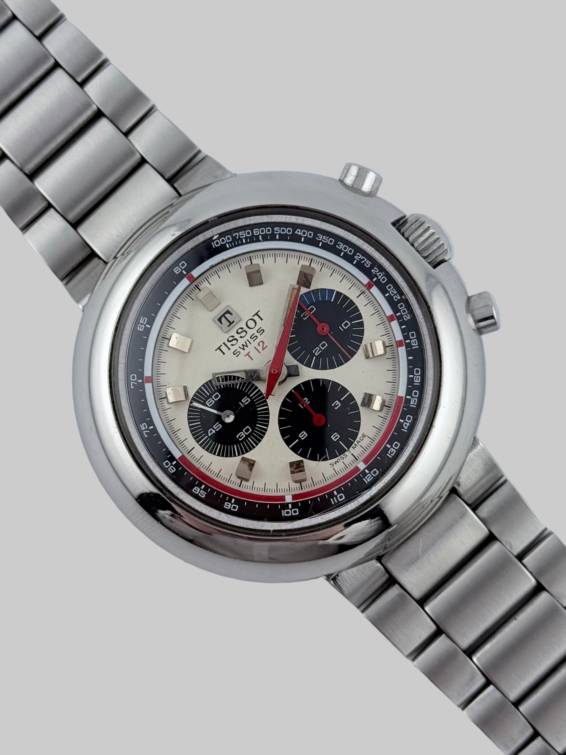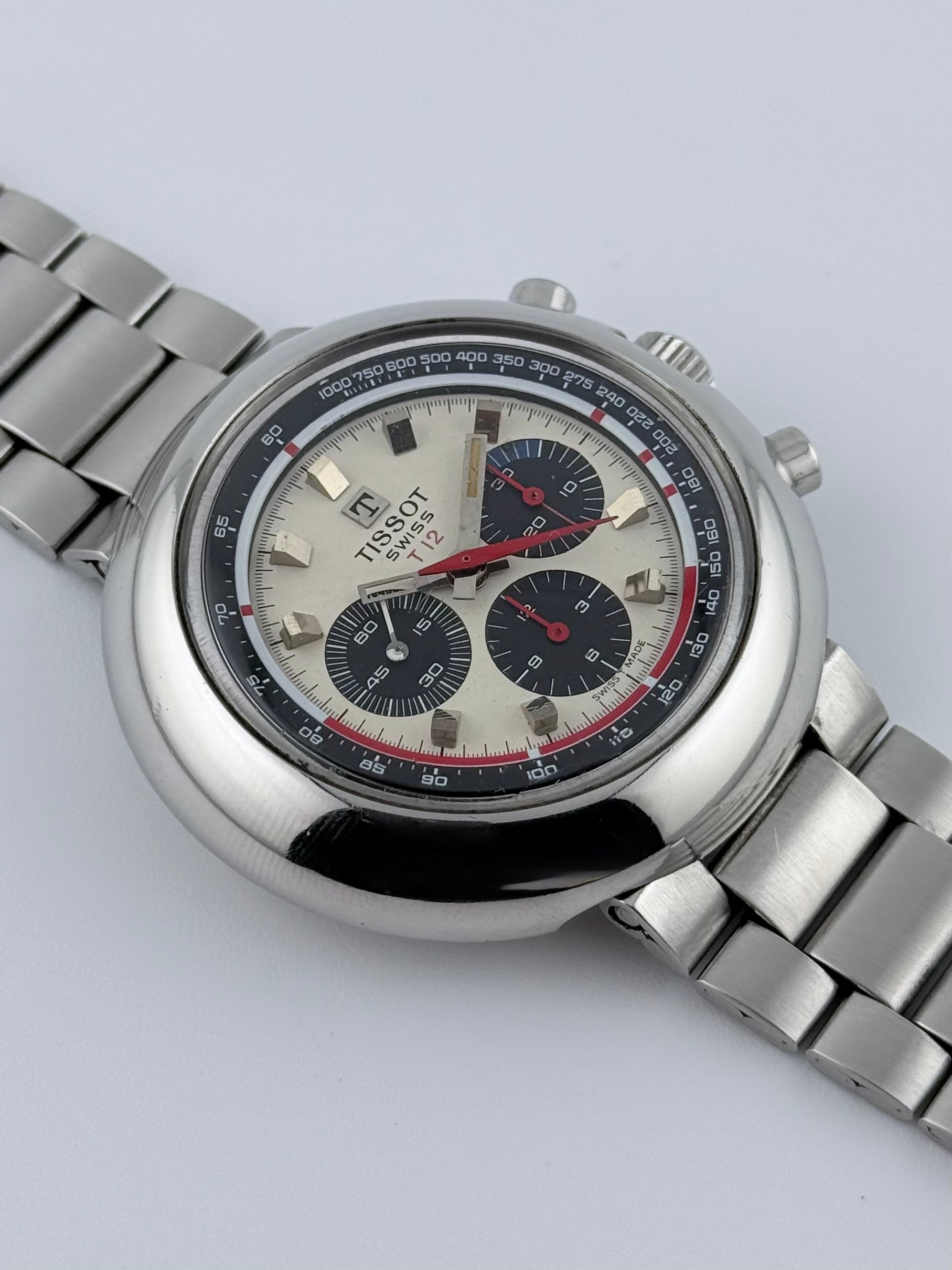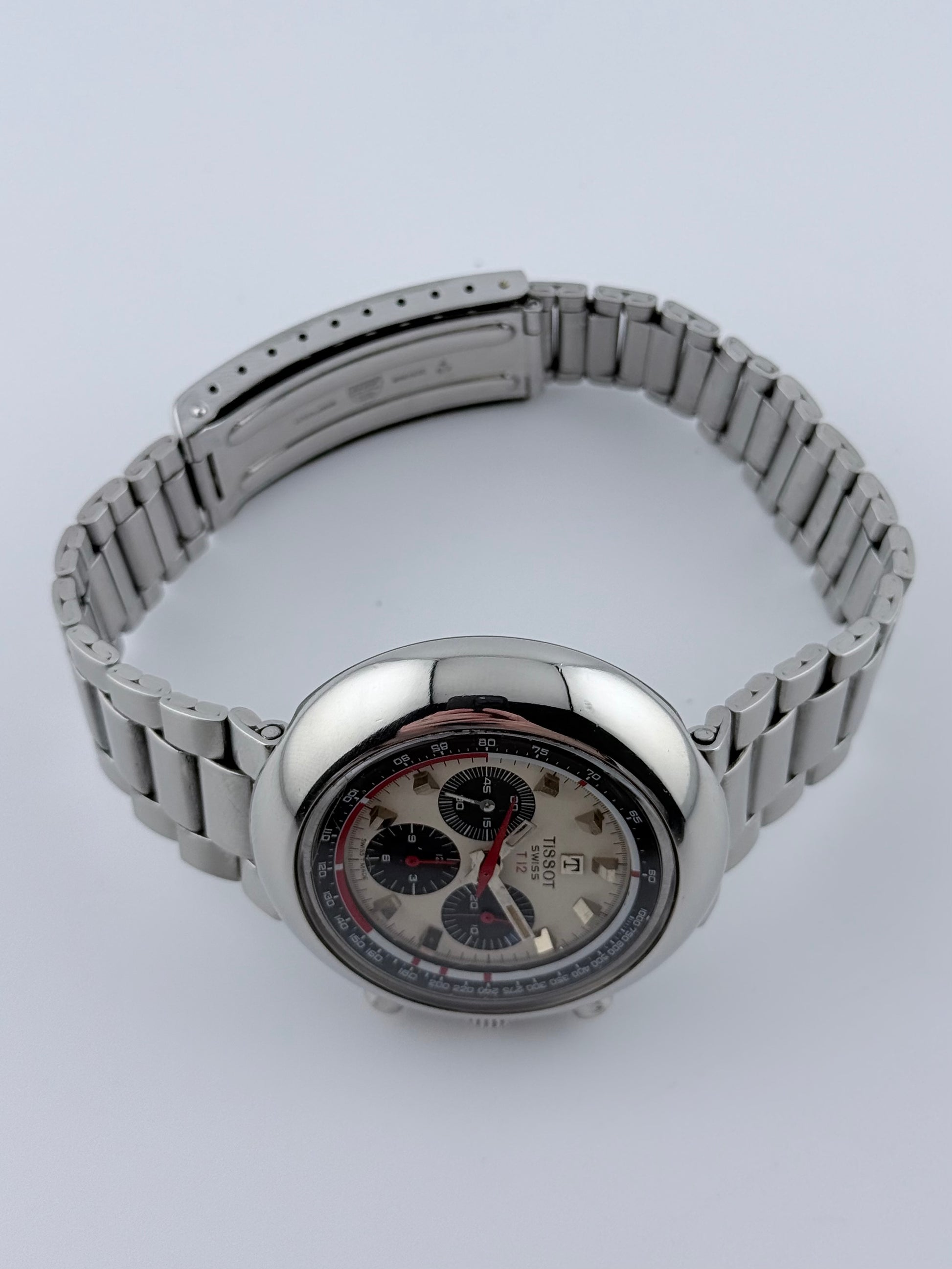 We present for sale this unique UFO style Chronograph from Tissot in the 1970s which is a design classic and still sits on its original Gay Freres bracelet. UFO style watches were a typical go to choice for the 1970s being chunky and very distinctive. The choice of colours for this dial are particularly impressive with a cream dial and black subdials complemented perfectly with the red hands used for the chronograph, 30 minute and hour dials. Even the wedge shaped hour markers look great on the watch. The movement is made by Lemania which was known for quality chronograph movements. The sub dials are all doing as they should with a seconds dial, 30 minute dial and an hour dial. The chronograph element starts and stops as it should and the re-set button is working correctly. If you are seeking something distinctive and different this watch will certainly start a conversation! The watch is in fantastic original condition and is working perfectly in all functions.