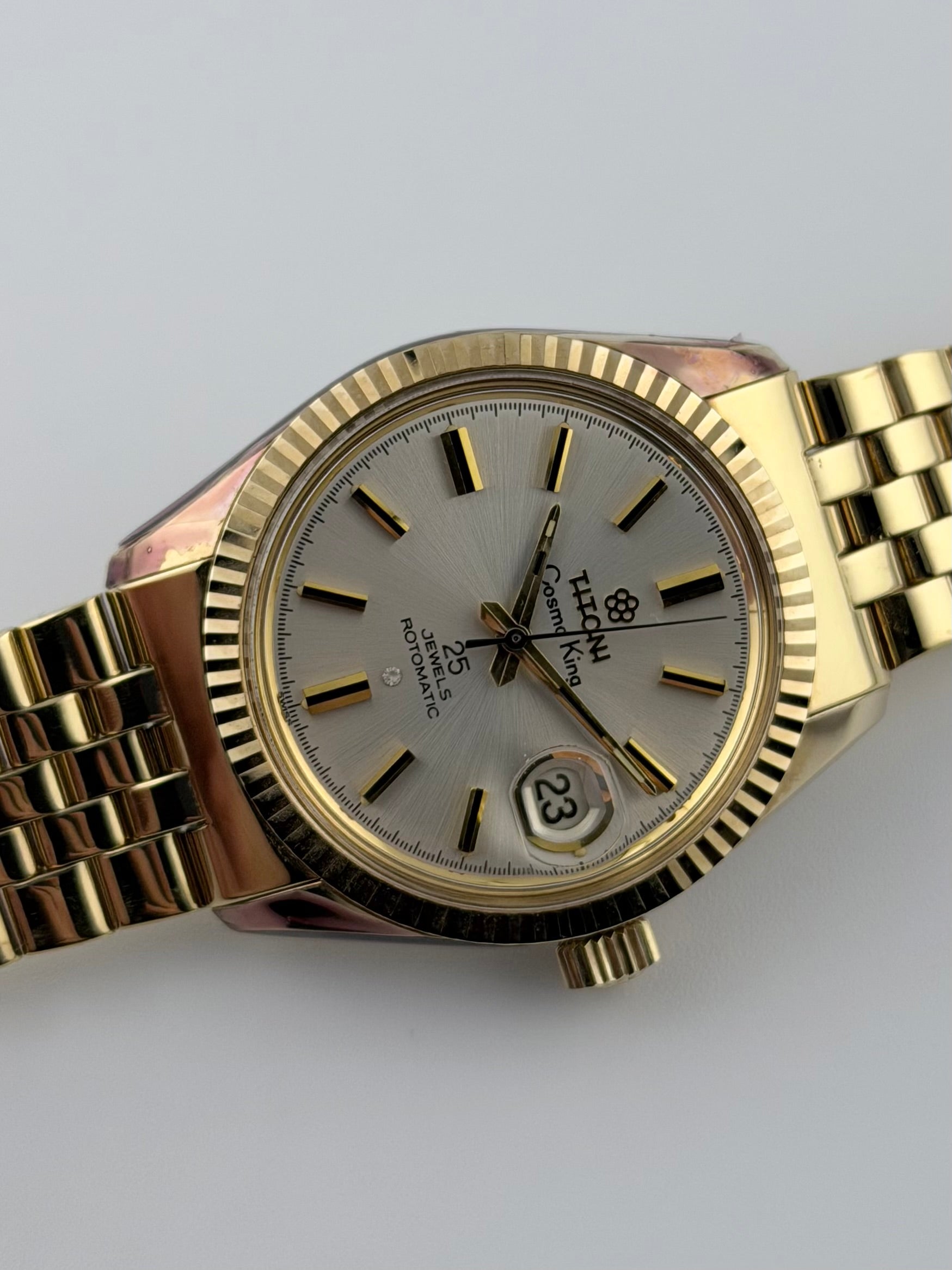 This is a superb vintage Swiss watch from the Titoni Cosmo King line which is one of the brand’s most popular since the 1950s and 1960s. Its distinctive fluted bezel and its King - larger size profile in gold-tone is beautifully complemented by the stunning silver-tone sunburst dial featuring gold colour baton indices, a little jewel stone insert and a date complication which is viewed through a cyclops lens.