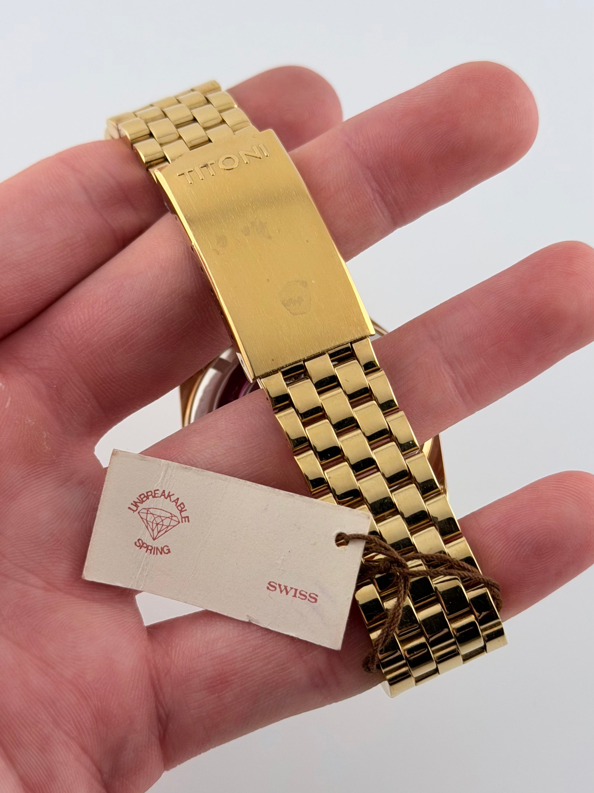 This watch is in magnificent new-old stock condition, still covered by its protective purple wax on parts of the case and back case. There are some very minor signs of wear from just handling the watch over the many years. It comes with its original bracelet which also has its original Titoni tag attached. The Rotomatic – (self-winding) automatic movement is in excellent condition, keeping good time within specification.