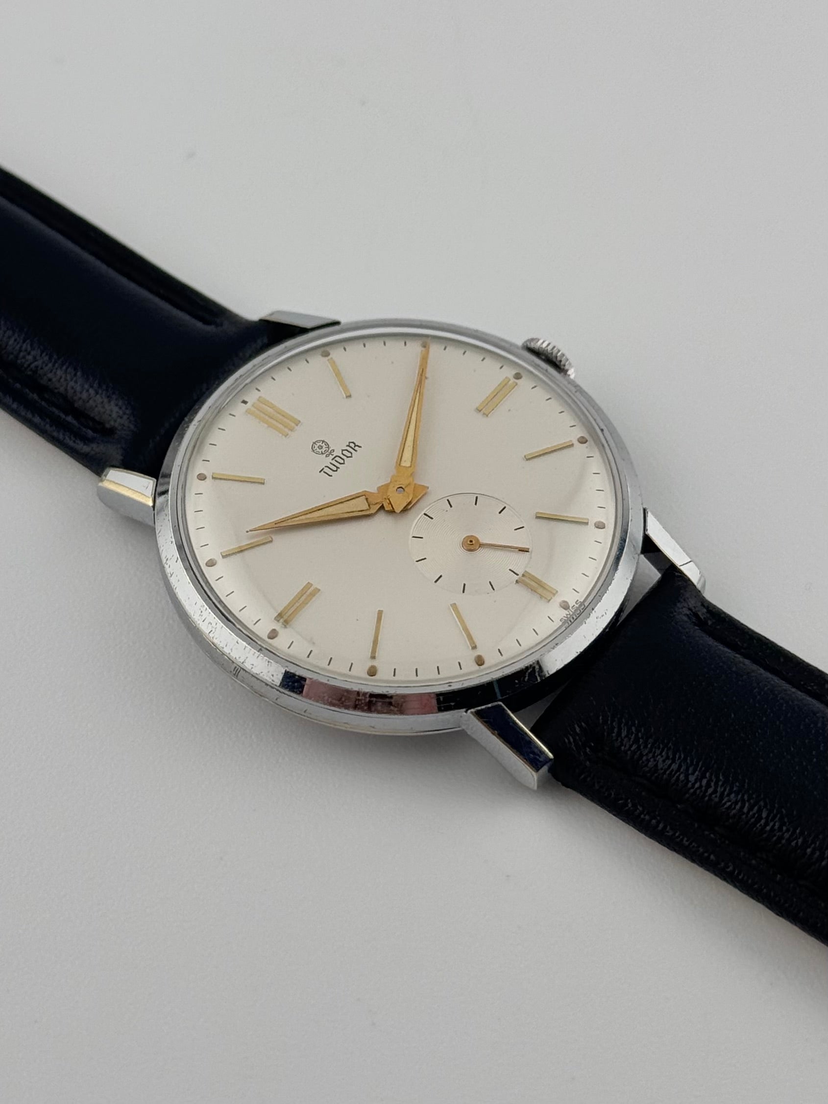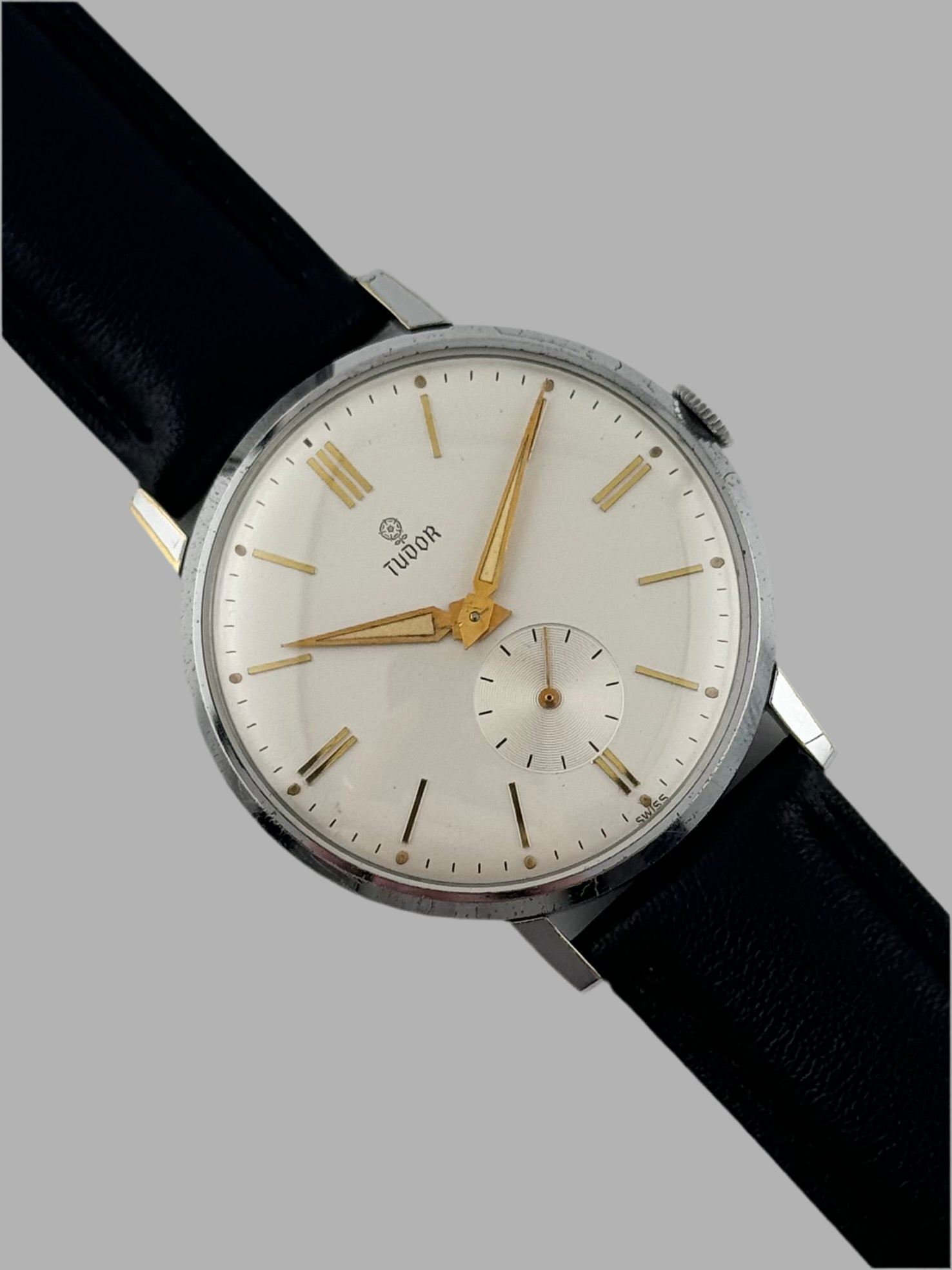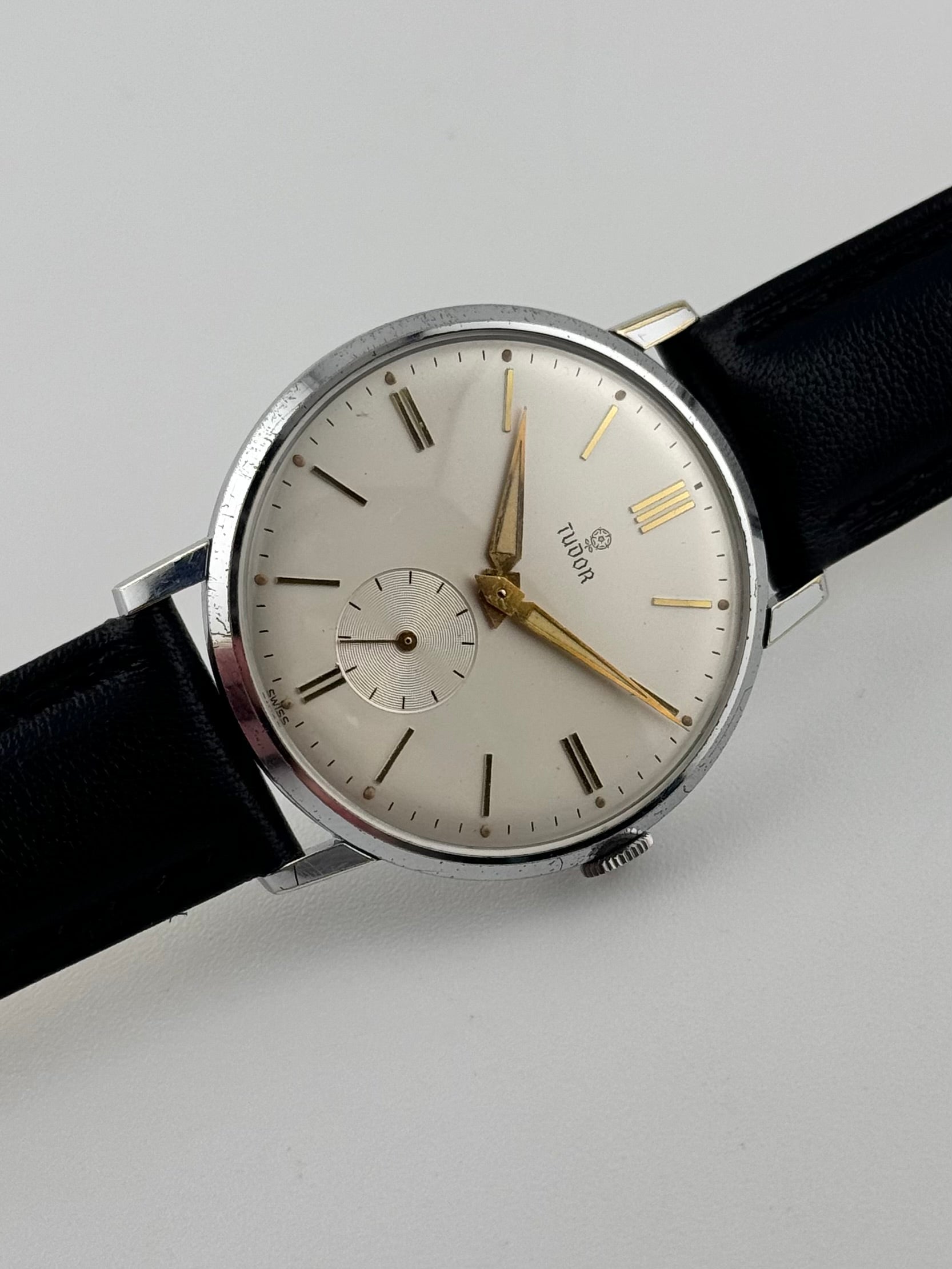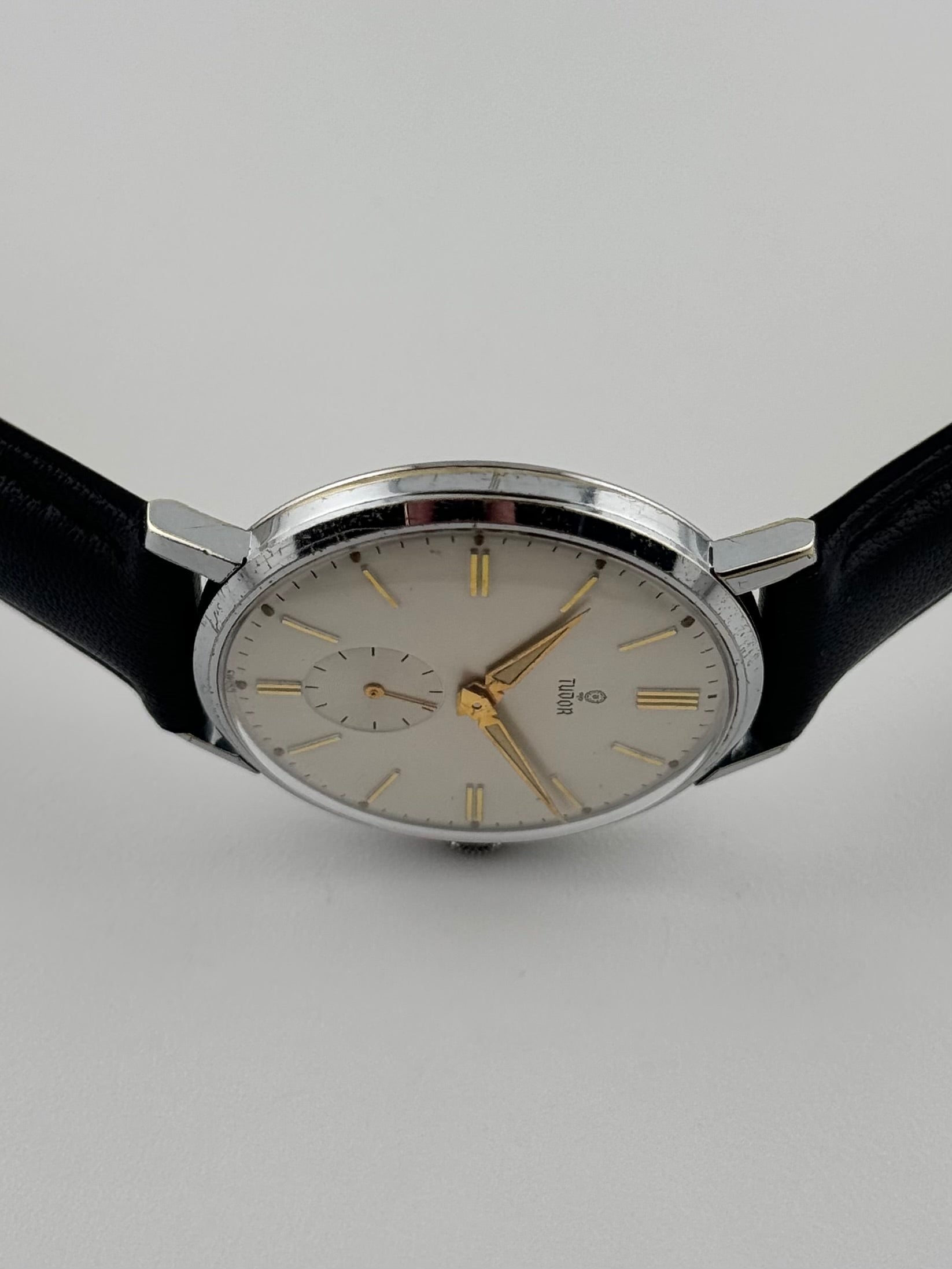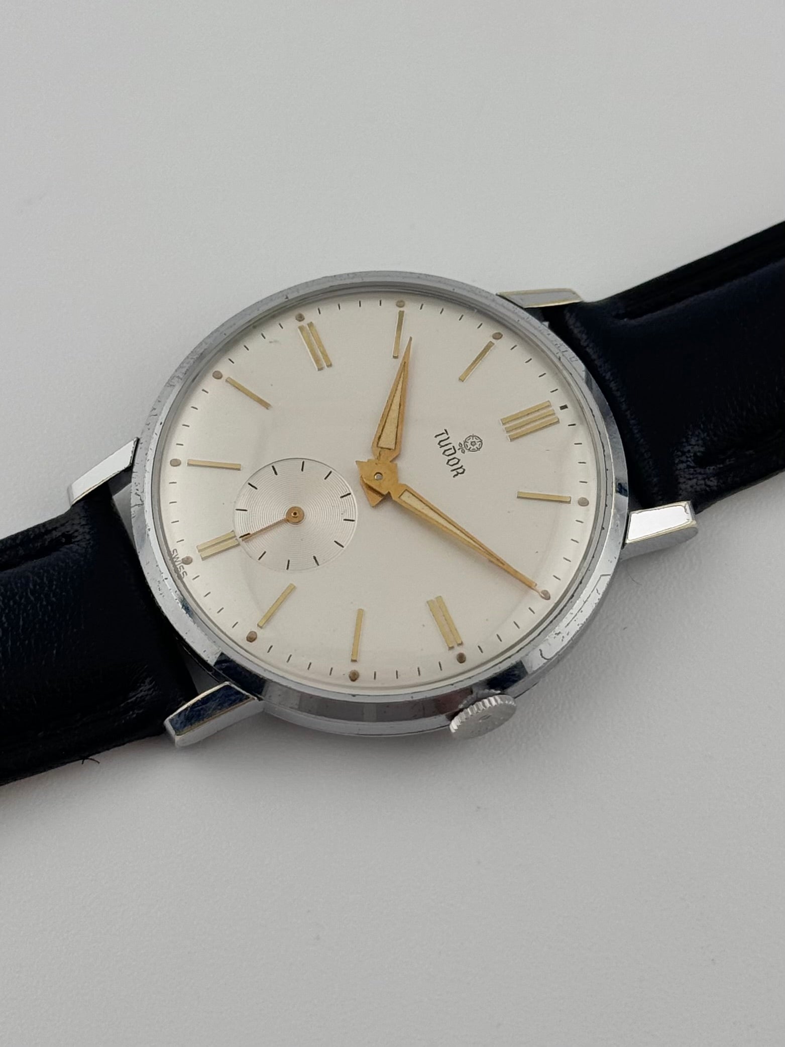 This is an absolutely stunning vintage Rolex Tudor Manual Wind from the 60s which features a beautiful satin finish dial in a slim stainless steel case with raised gold coloured baton markers and seconds sub-dial. The watch is in spectacular condition for its age and is working perfectly, keeping excellent time.