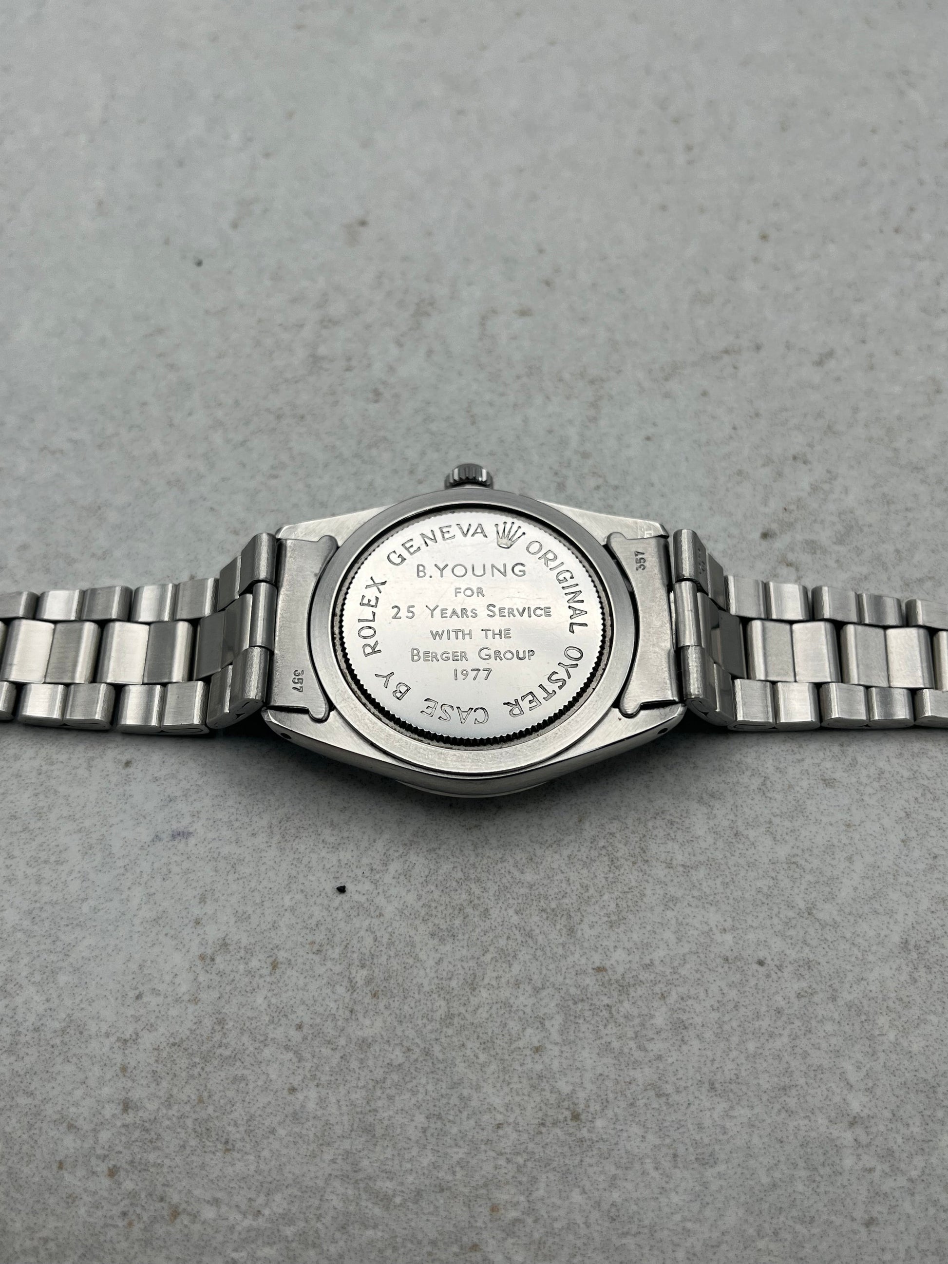 Case Back - The original Rolex case back is in good condition showing signs of wear. There is an inscription which we feel adds to the provenance and story these watches tell. This says "B Young for 25 years service the Berger Group 1977"