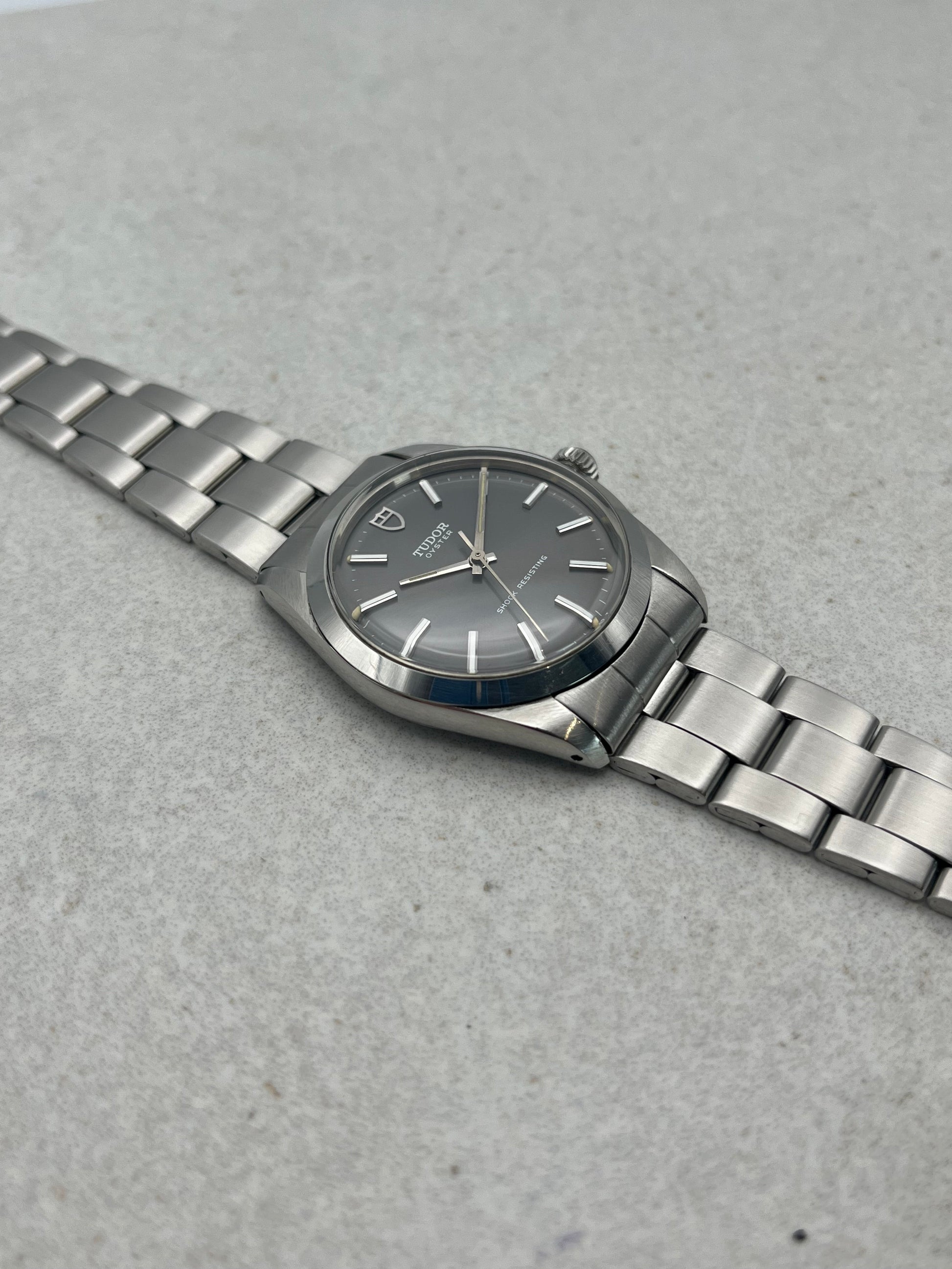 We present to you this super clean example of a vintage Tudor Oyster manual wind from the the late 1970s. This model features a stunning grey sunburst dial with silver and black onyx markers. The watch also features a Rolex crown, caseback and bracelet which are fully original to the watch. The watch is keeping great time within specification for a 60 year old watch.
