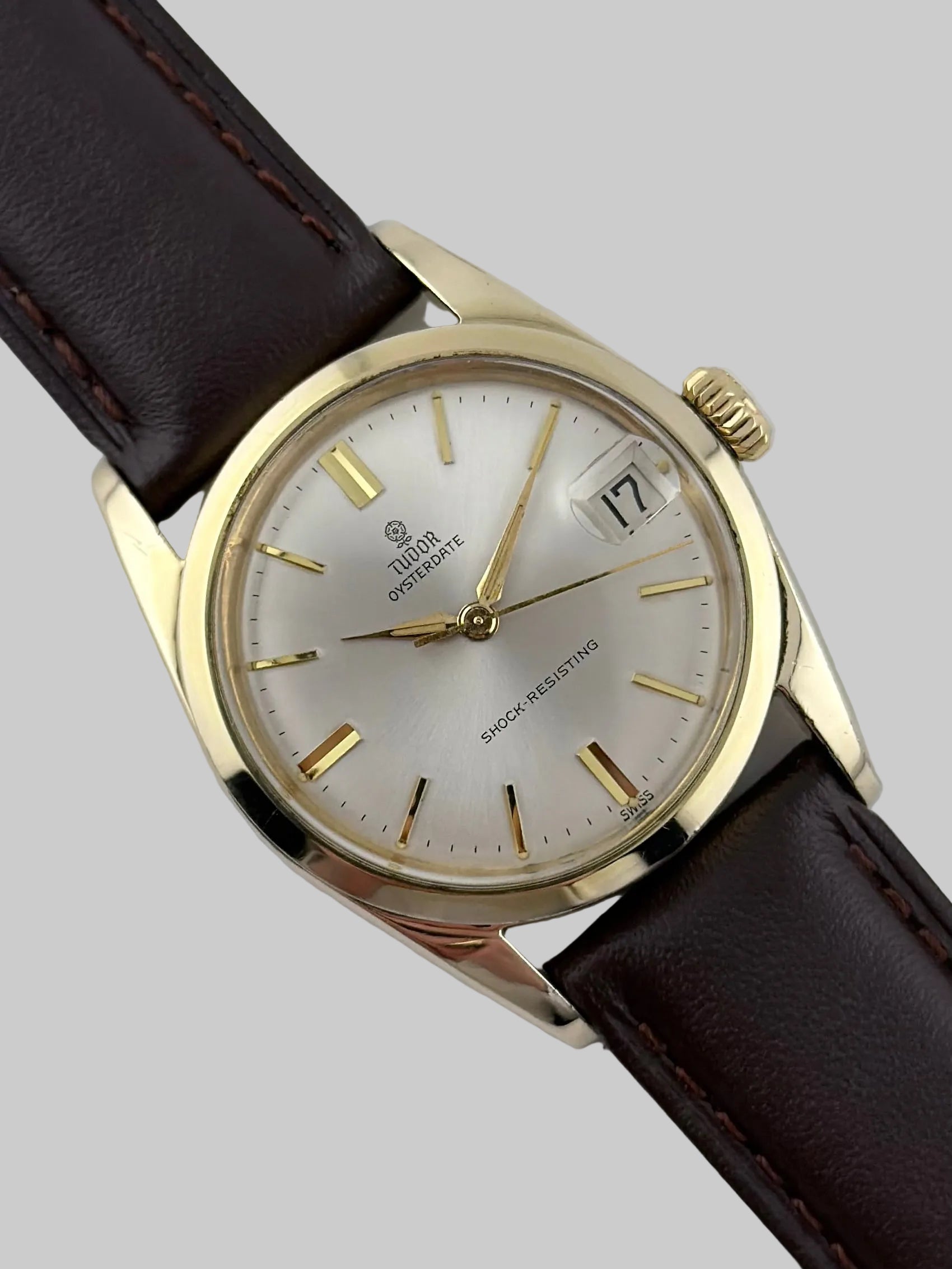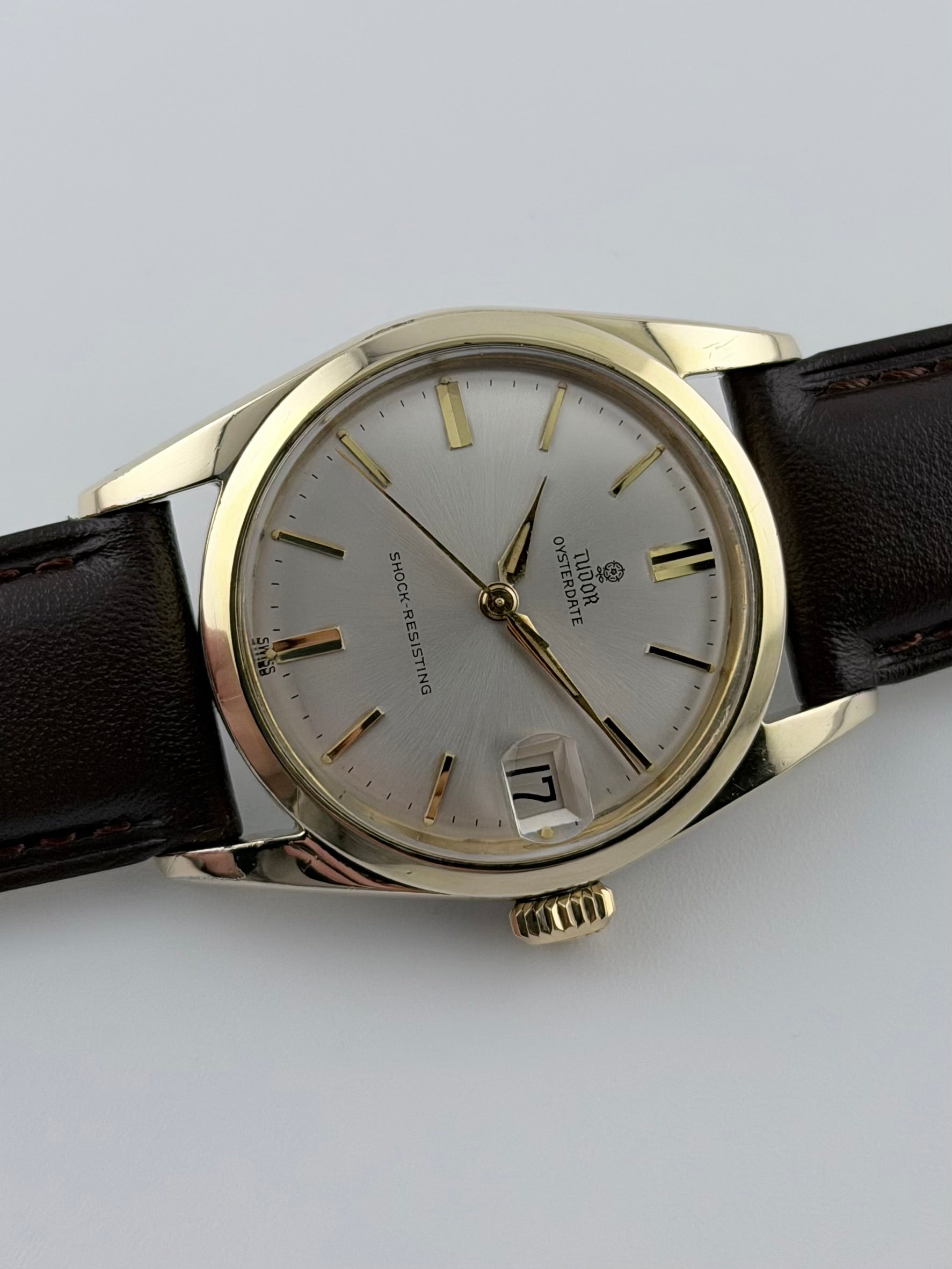 We present to you this super example of a vintage Tudor Oysterdate manual wind from 1965/66. This model features a stunning silver sunburst dial with gold coloured baton hours markers and a date complication. The watch has a Rolex crown and caseback which are fully original to the watch. The watch is keeping excellent time and is running perfectly.