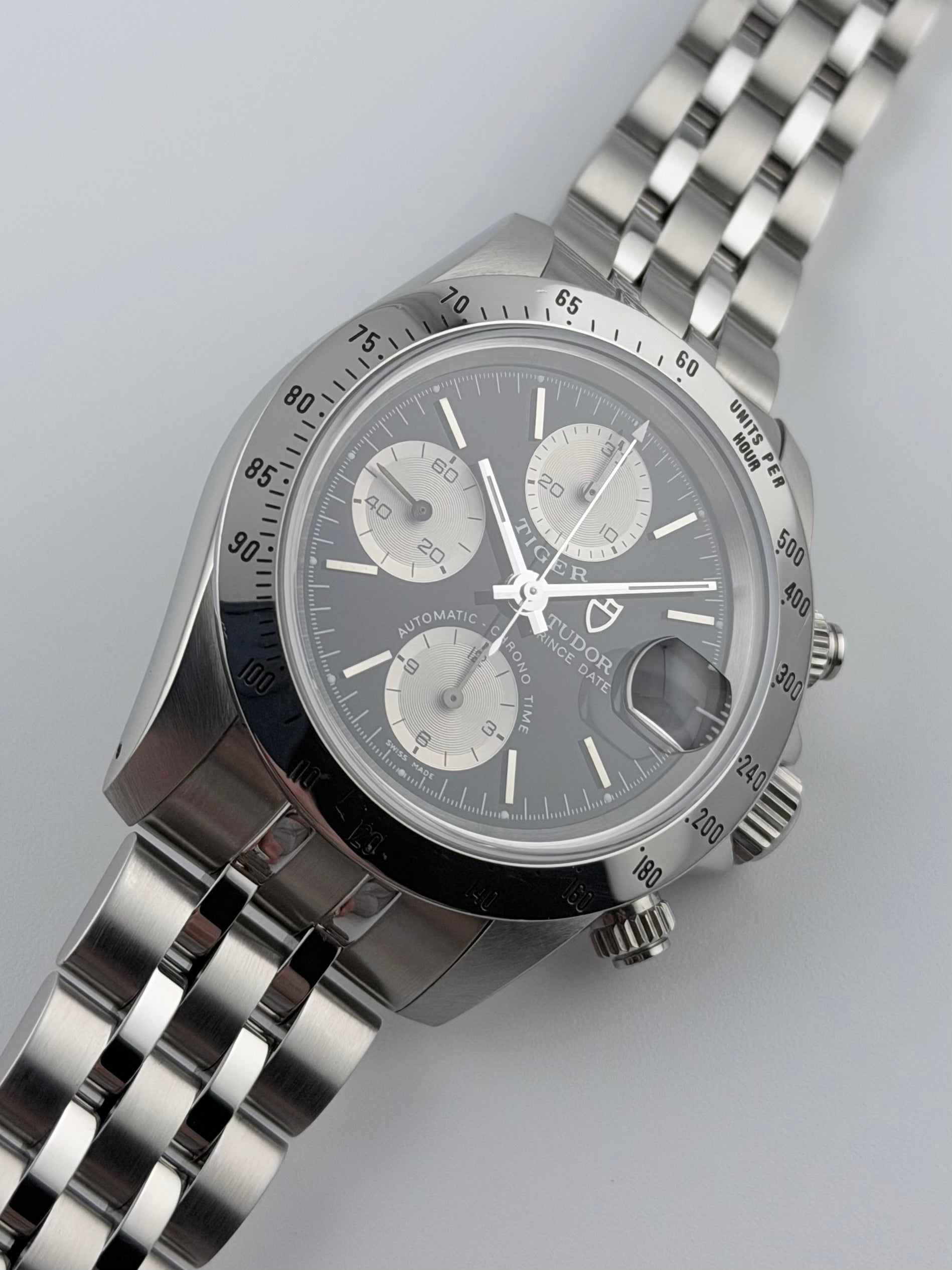 We present for sale the incredible and highly sought-after by collectors - Tudor Oysterdate Automatic Chronograph from 1997. As one of the popular "Tiger" models - named after the Tudor's famed ambassador Tiger Woods - this timepiece deserves its historic importance due to its performance as well as distinctive design and connection to the late 90s/early 2000s era of Tudor chronographs. This particular timepiece features a silver and black reverse Panda dial, a stainless steel bezel and a fully functional date complication, which is viewed through the Rolex cyclops lens. This piece is in spectacular condition showing minimal signs of wear. Please see pictures, as these form part of the description.