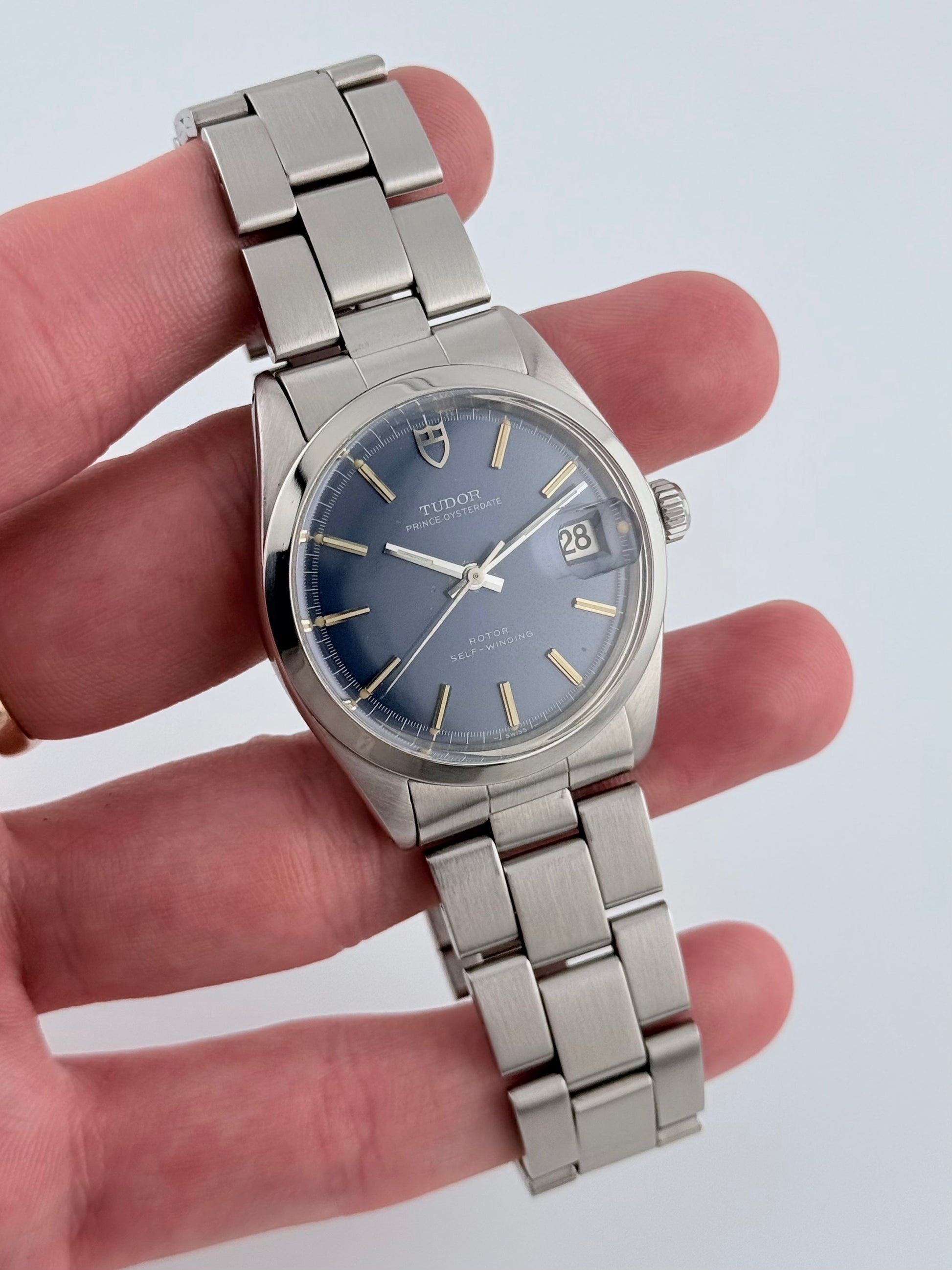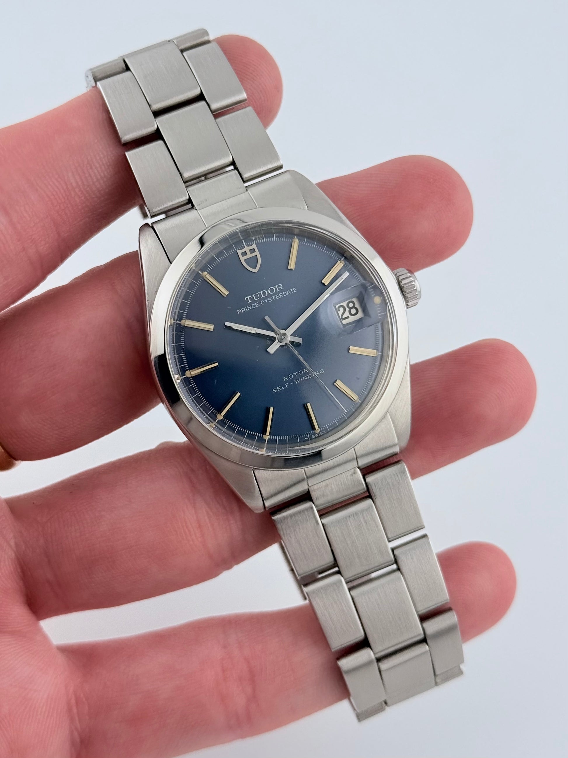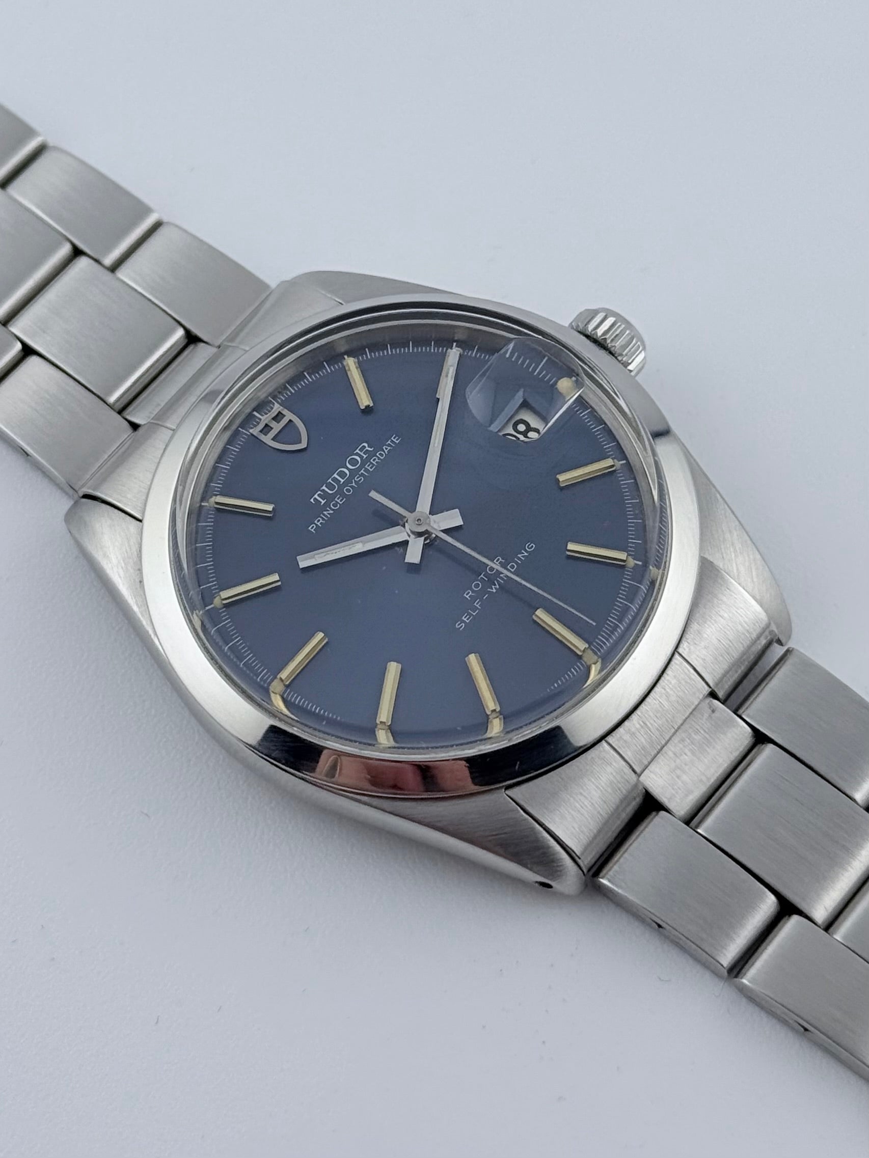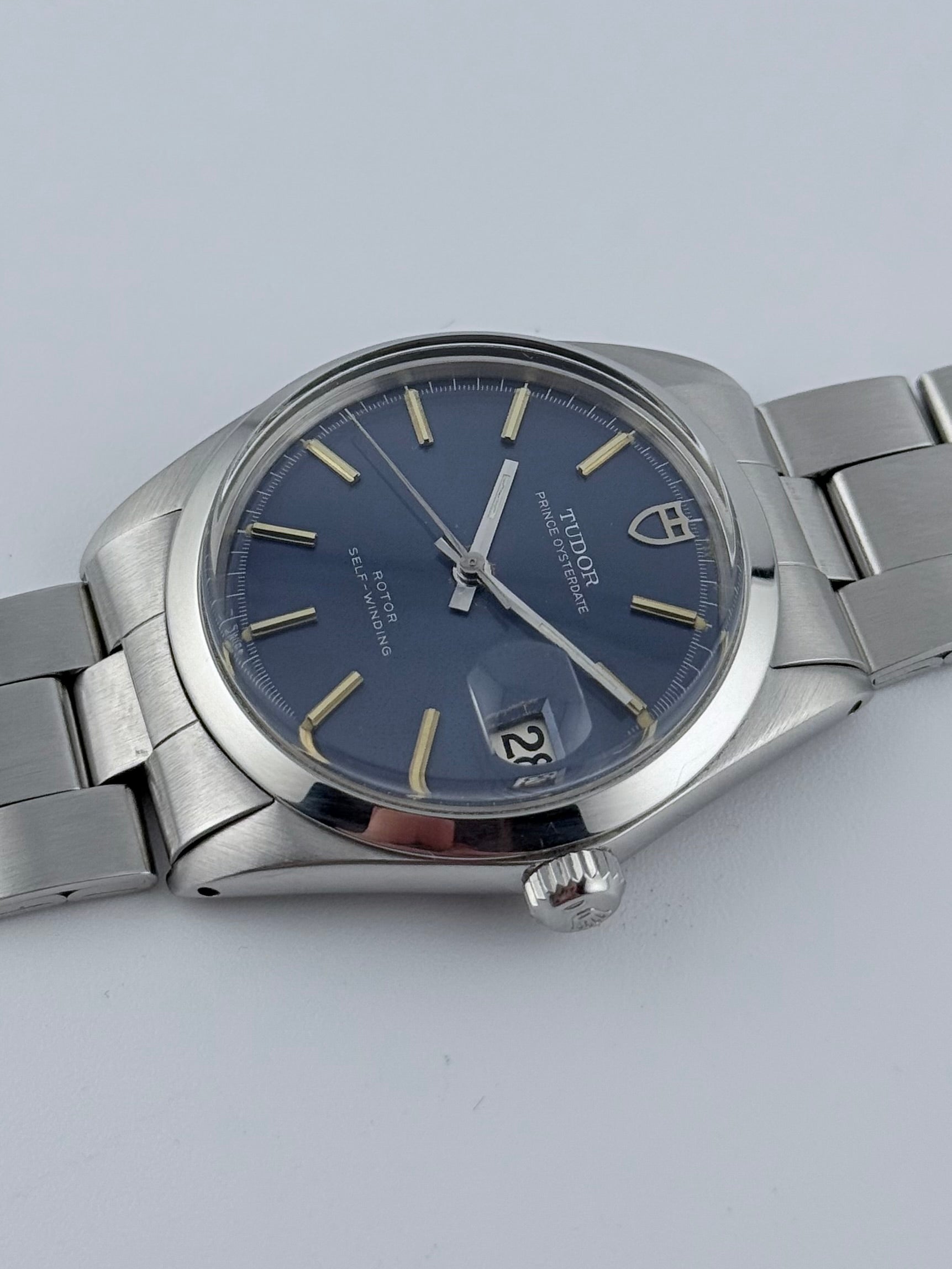 This is an incredible Tudor Prince Oysterdate from the 1970s in fantastic condition. This particular model features a stunning blue sunburst dial which displays a fully functional date complication viewed through the Rolex Cyclops magnifying window. This Tudor also features a Rolex made case and crown combined with a stainless steel Tudor bracelet and folding clasp, all Rolex parts are Rolex signed. Tudor and Rolex were sibling companies and all parts on this watch are original. This piece is in spectacular condition for its age, working perfectly. Please see pictures, as these form part of the description.