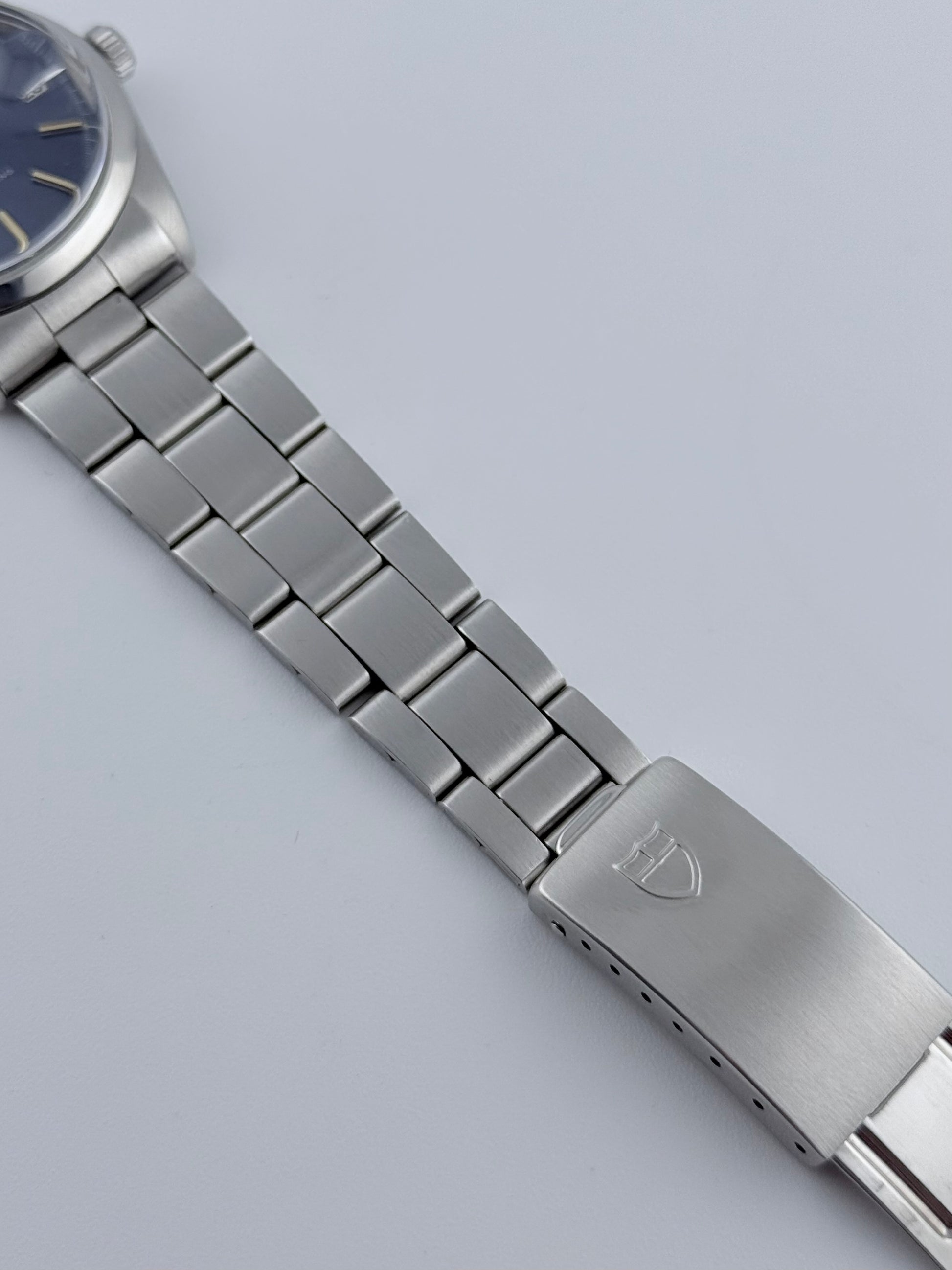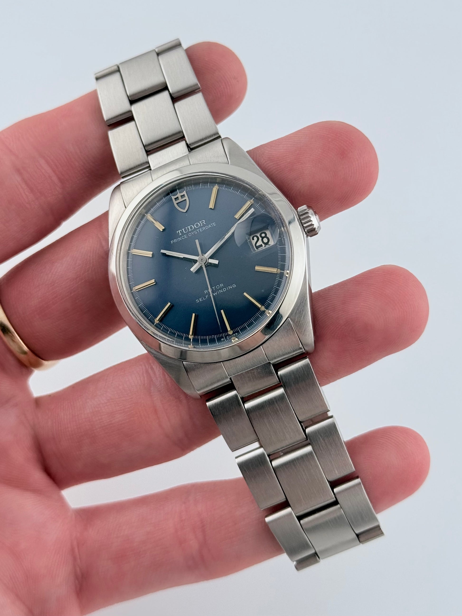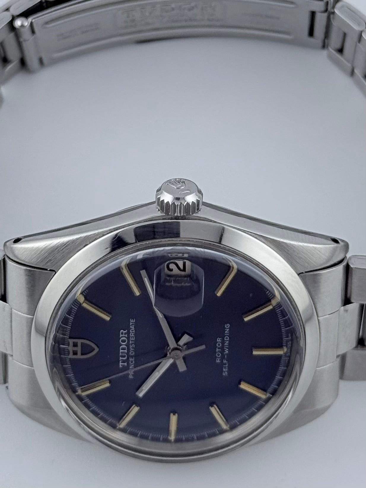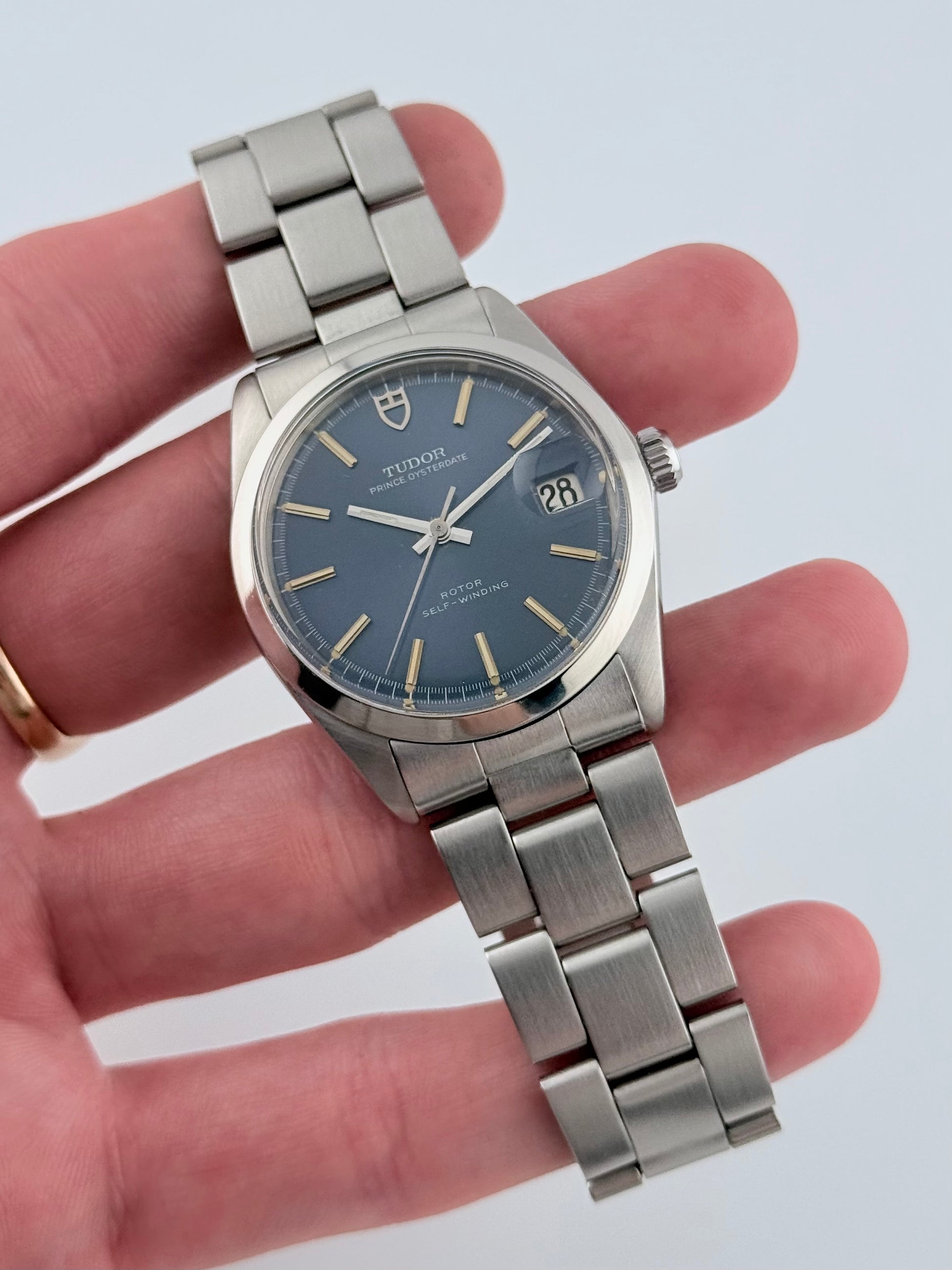 This is an incredible Tudor Prince Oysterdate from the 1970s in fantastic condition. This particular model features a stunning blue sunburst dial which displays a fully functional date complication viewed through the Rolex Cyclops magnifying window. This Tudor also features a Rolex made case and crown combined with a stainless steel Tudor bracelet and folding clasp, all Rolex parts are Rolex signed. Tudor and Rolex were sibling companies and all parts on this watch are original. This piece is in spectacular condition for its age, working perfectly. Please see pictures, as these form part of the description.