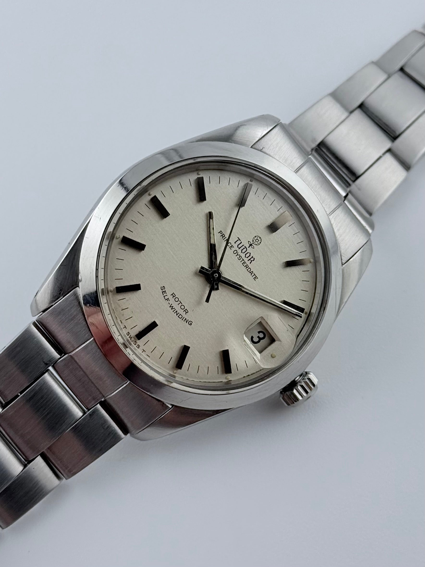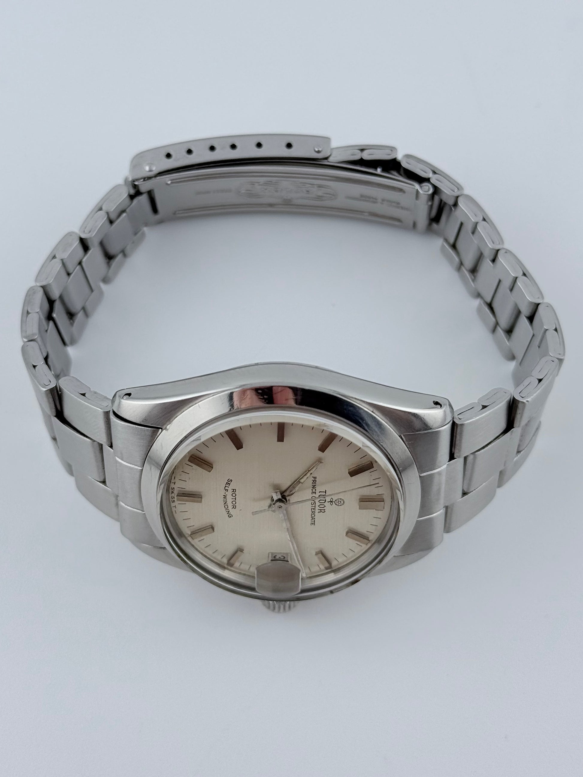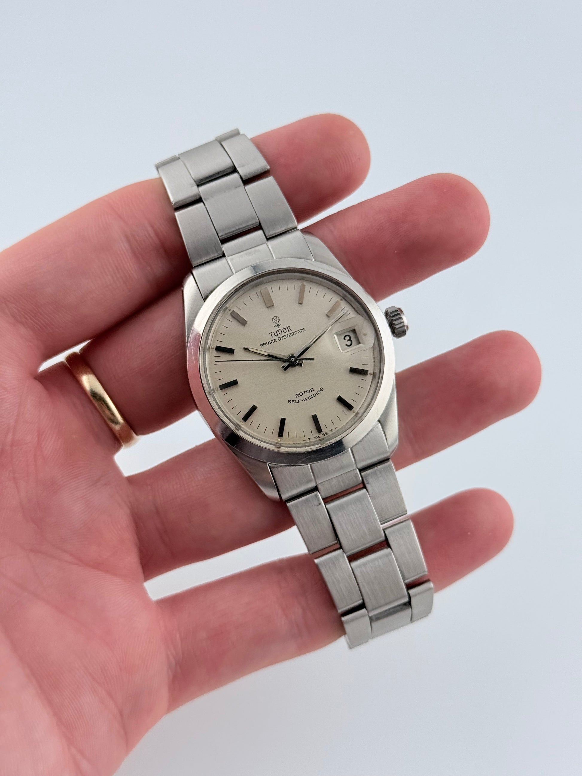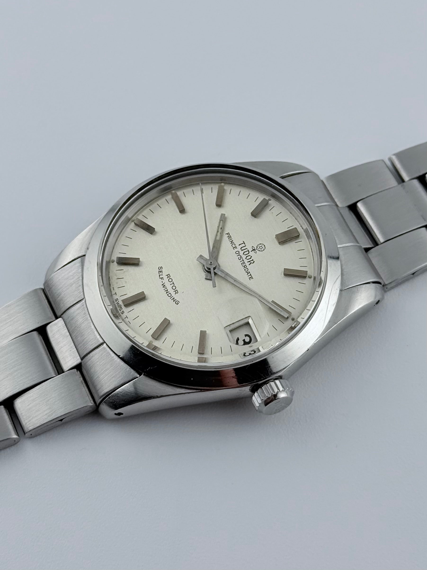 This is an incredible Tudor Prince Oysterdate from the 1960s in fantastic condition. This particular model features a stunning silver, horizontally brushed dial which displays a fully functional date complication viewed through the Rolex Cyclops magnifying window. This Tudor also features a Rolex made case and crown combined with a stainless steel Rolex bracelet and folding clasp, all Rolex parts are Rolex signed. Tudor and Rolex have been sister companies since 1926 and all parts on this watch are original. This piece is in spectacular condition for its age, working perfectly. Please see pictures, as these form part of the description.